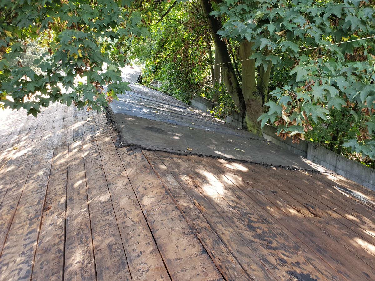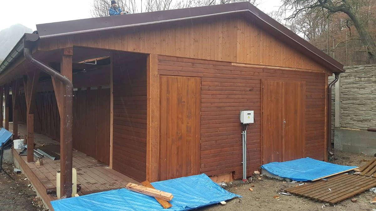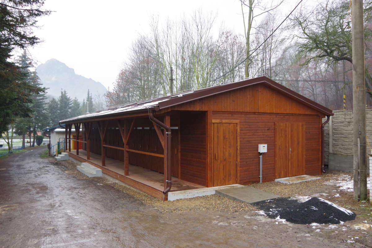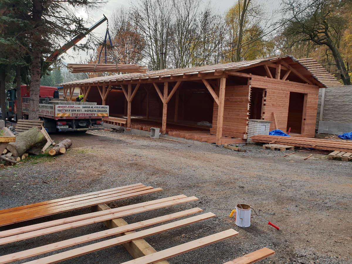 Nosná konstrukce sedlové střechy je navržena z dřevěných vaznic 140/160 mm, krokví 100/140 mm, pásků 100/120 mm a jednostranných kleštin 80/160 mm. Dřevěné vaznice jsou osazeny na dřevěných sloupcích a podepřeny pásky 100/120 mm. Střešní plášť z falcovaných ocelových probarvených plechů je osazen na dřevěné bednění z prken tl. 25 mm. Pod plechy se nachází strukturovaná dělící rohož.