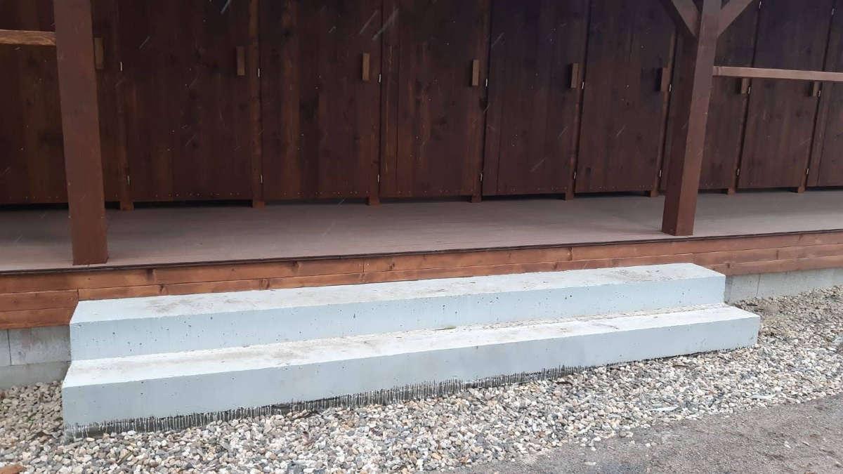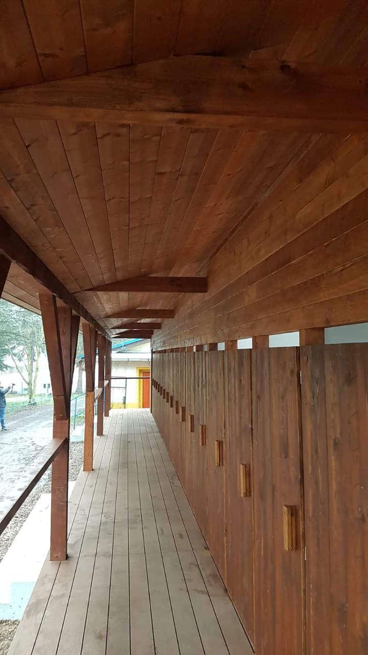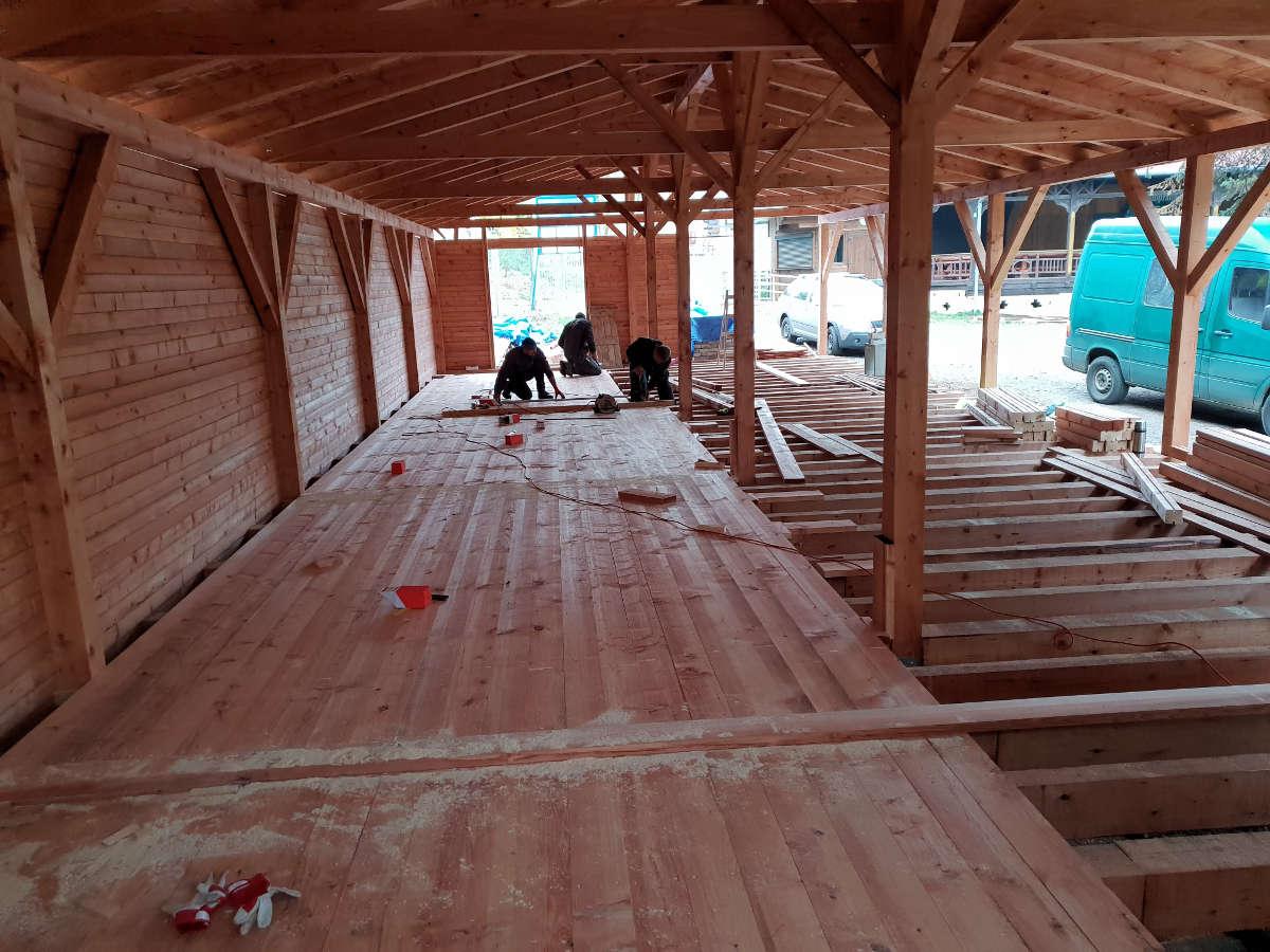 Ve vnitřních prostorách objektu ve skladu je navržena dřevěná podlaha z fošen tl. 40 mm. V prostorech převlékáren a terasy je navržena podlaha z dřevoplastových terasových prken (desky WPC) tl. cca 25 mm. Spodní podhledové a boční konstrukce jsou obloženy dřevěným obkladem z palubkových prken. Veškeré dřevěné konstrukce jsou opatřeny vhodným nátěrem na dřevo do vnějšího prostředí.
