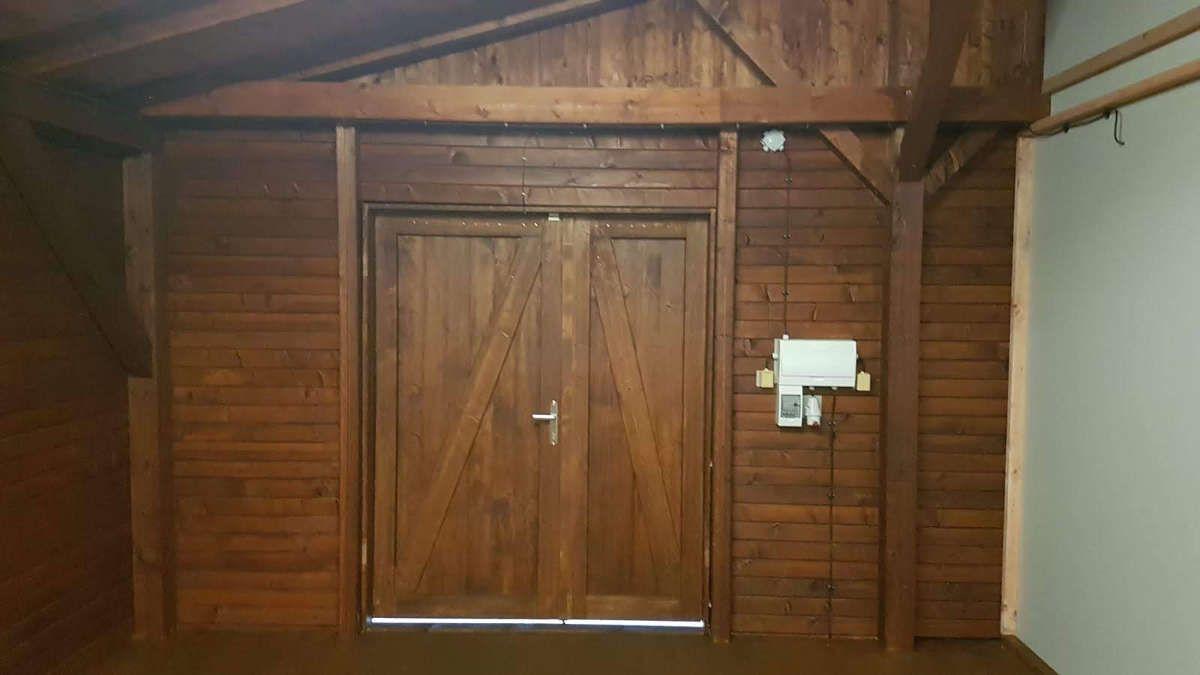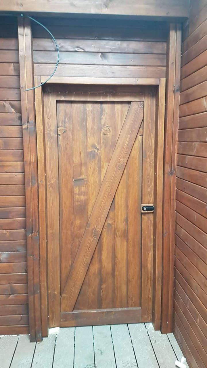 Dveře byly vyrobeny na míru dle domluvy. V tomto případě se jednalo o několik typů dveří - dvoukřídlé (1600 / 2035 mm), 2x jednokřídlé klasické (900 / 2000 mm) s instalací wc zámku a bezpečnostních zámků, dále 18x dveře kabinkové (800 / 1975 mm). Všechny typy mají konstrukci tvořenou z dřevěných fošen, vnější povrch namořen do tmavého ořechu, vnitřní povrch světle čirý a dřevěnou zárubeň. Okna střešní jednokřídlová, pevně zasklená.