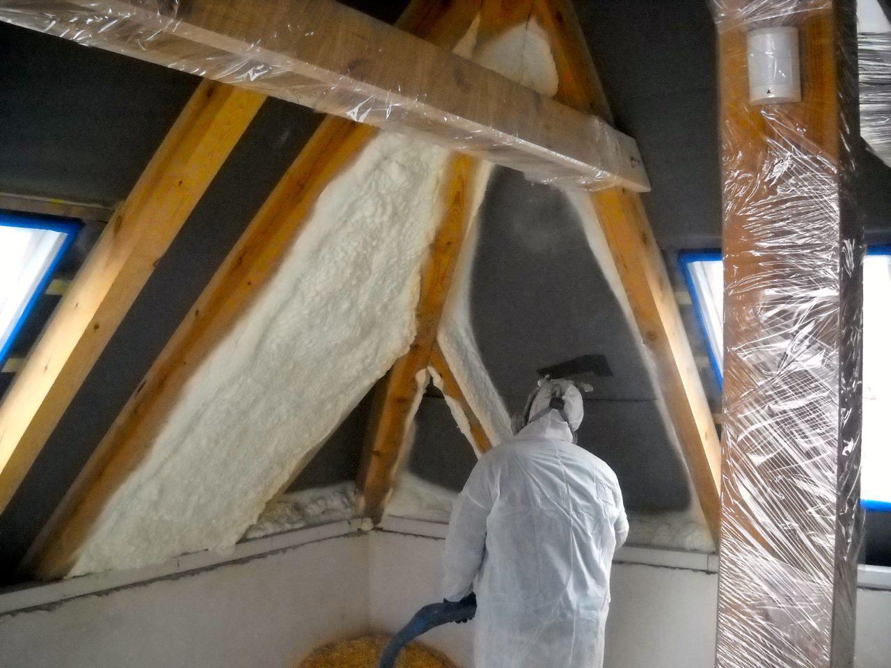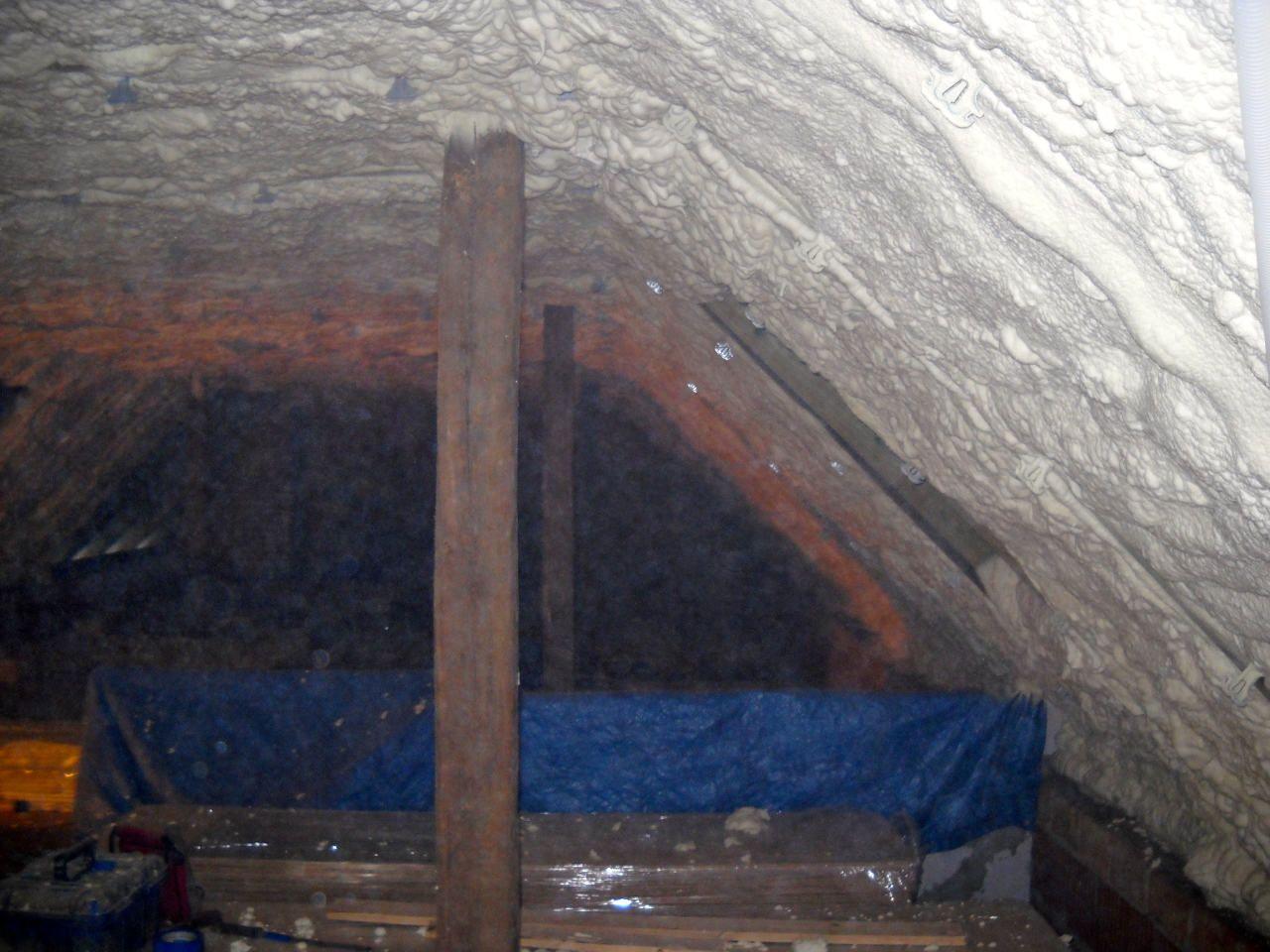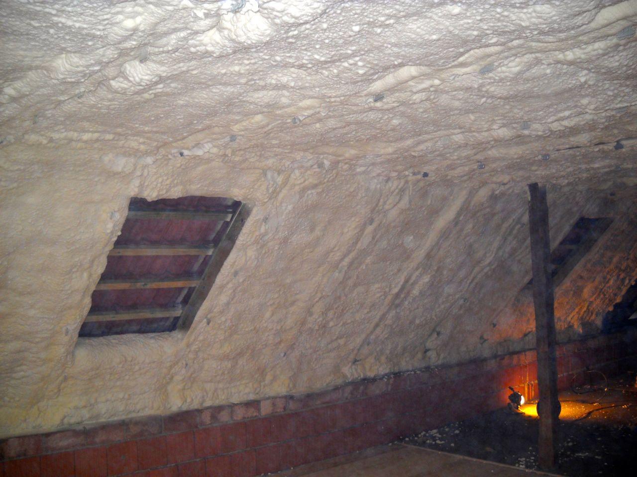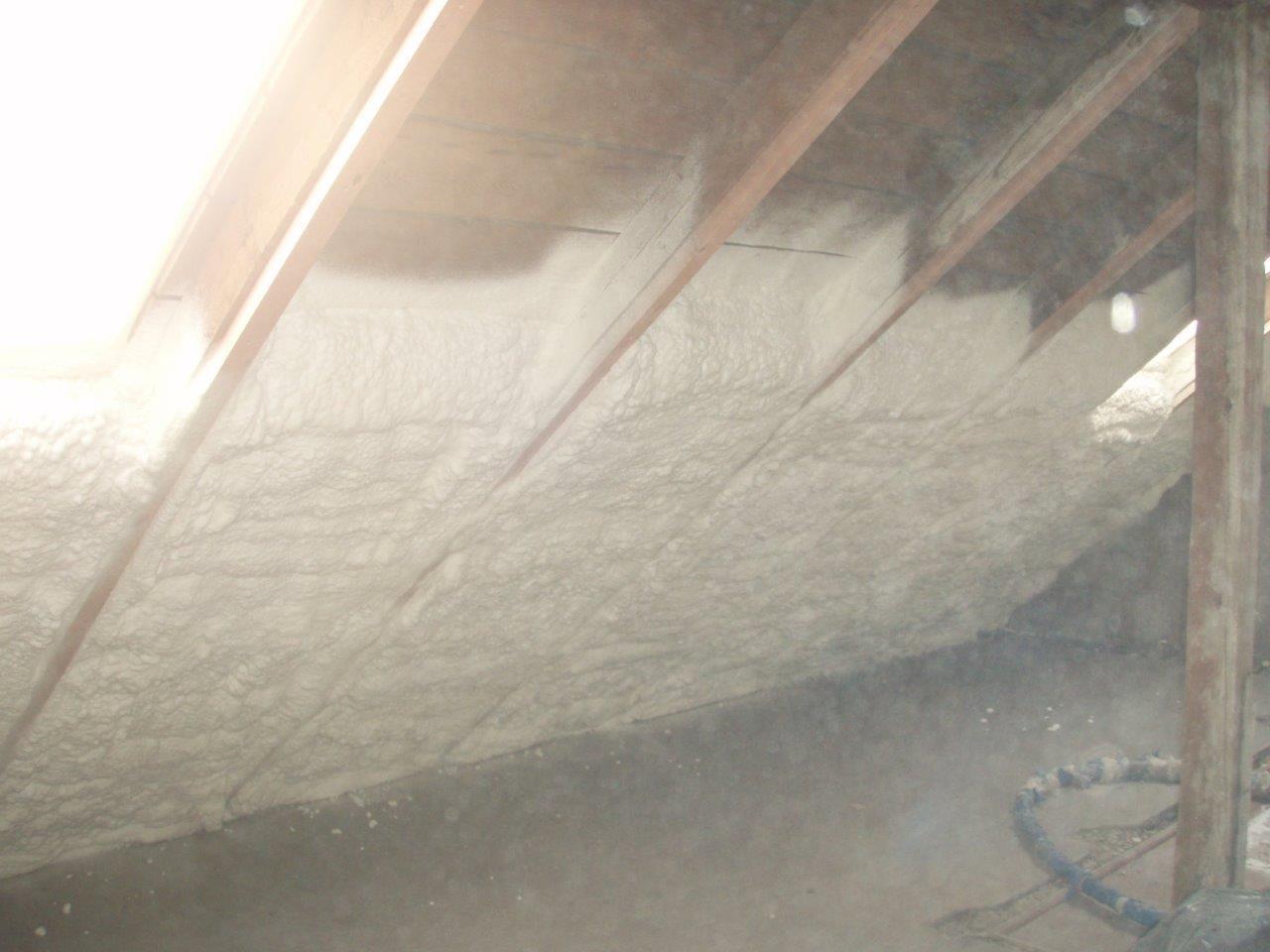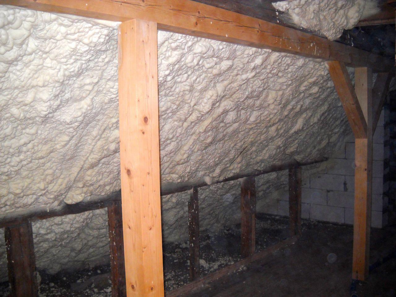 Aplikace stříkané pěny EKO S 500 na objektu starší dvoupatrové vily, kde docházelo k velkému úniku tepla. Jedná se o nástřik přímo na dřevěné bednění,kde naše pěna je k tomuto materiálu šetrná z hlediska otevřené difuze izolantu. Nedochází tudíž zde k výskytu plísní na podkladu (dřevo). Celý izolovaný prostor podkroví je tak vzduchotěsně uzavřen, ale přesto dýchá, což je podstata moderní technologie zateplování.