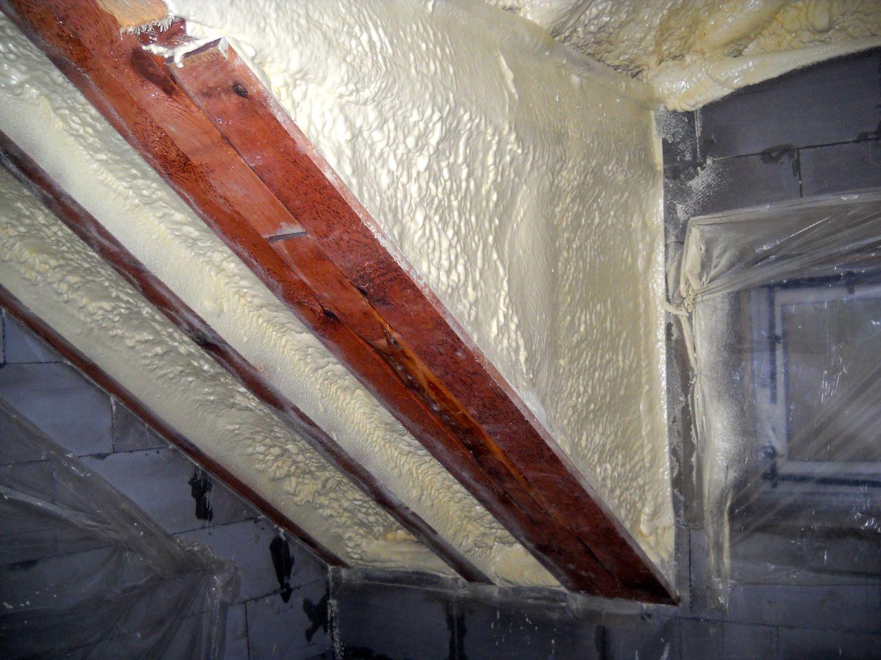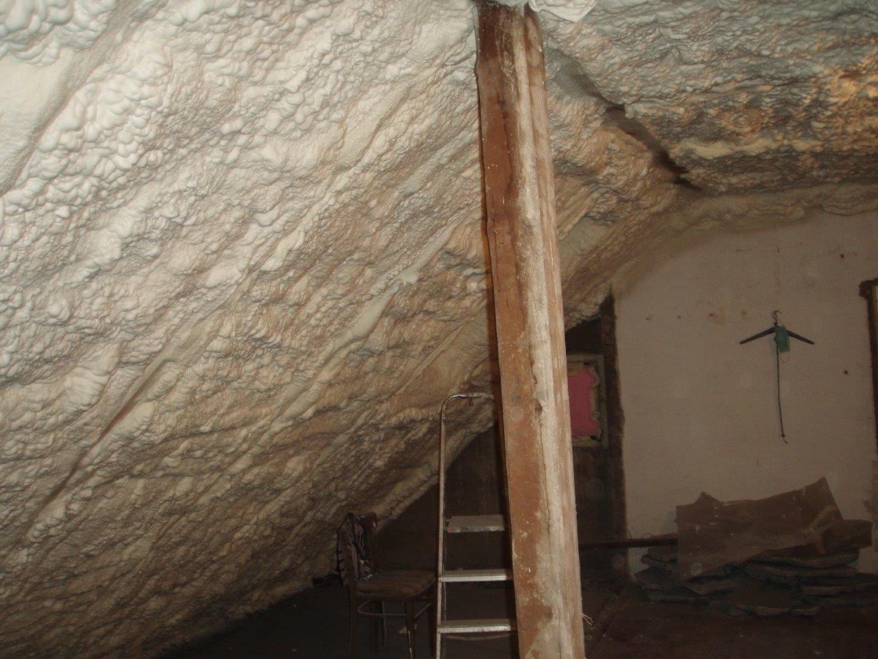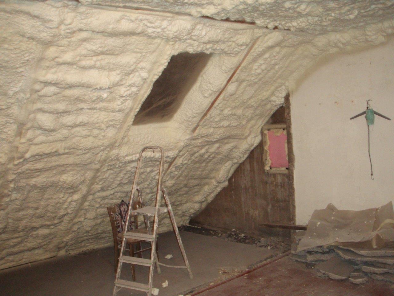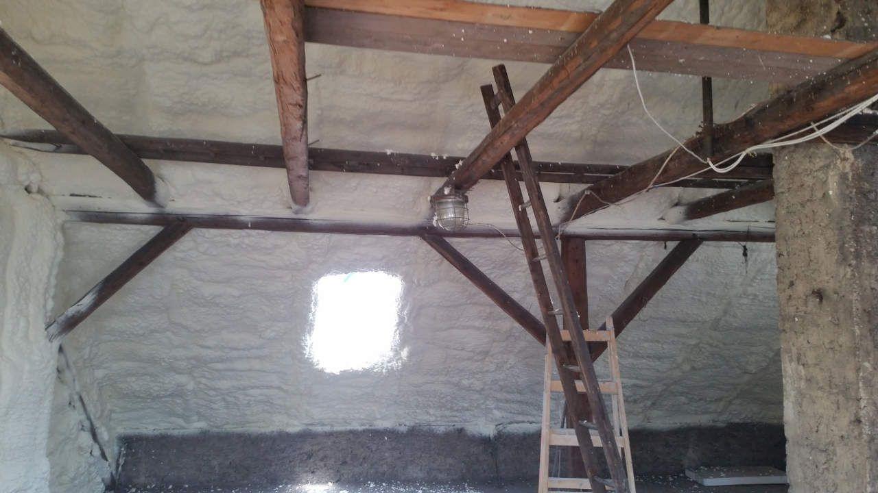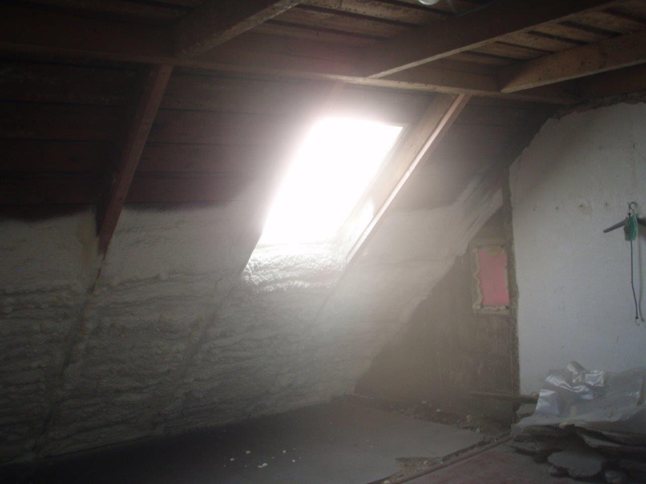 Aplikace stříkané pěny EKO S 500 na objektu starší dvoupatrové vily, kde docházelo k velkému úniku tepla. Jedná se o nástřik přímo na dřevěné bednění,kde naše pěna je k tomuto materiálu šetrná z hlediska otevřené difuze izolantu. Nedochází tudíž zde k výskytu plísní na podkladu (dřevo). Celý izolovaný prostor podkroví je tak vzduchotěsně uzavřen, ale přesto dýchá, což je podstata moderní technologie zateplování.