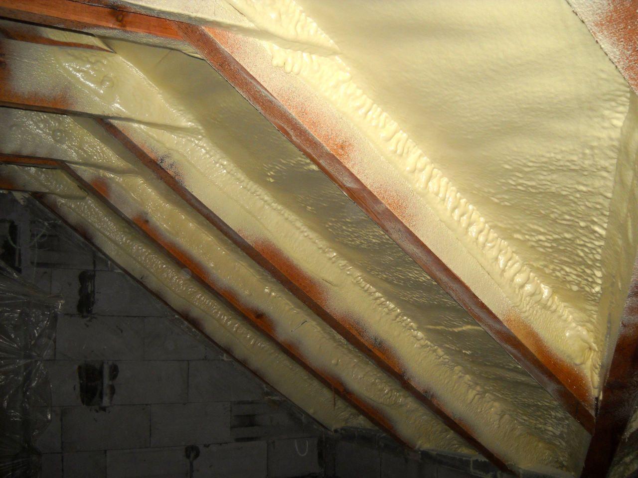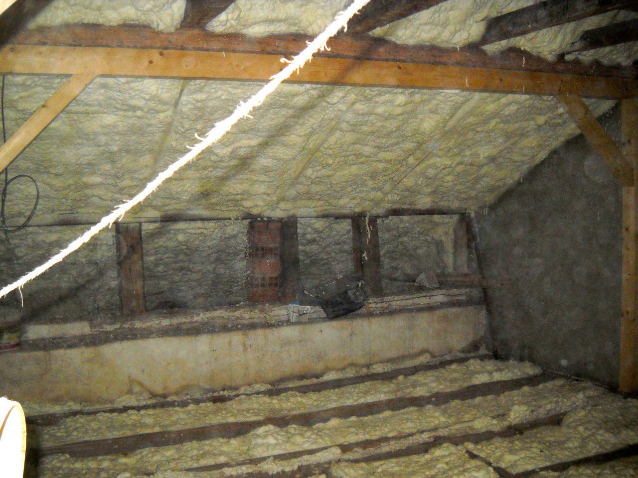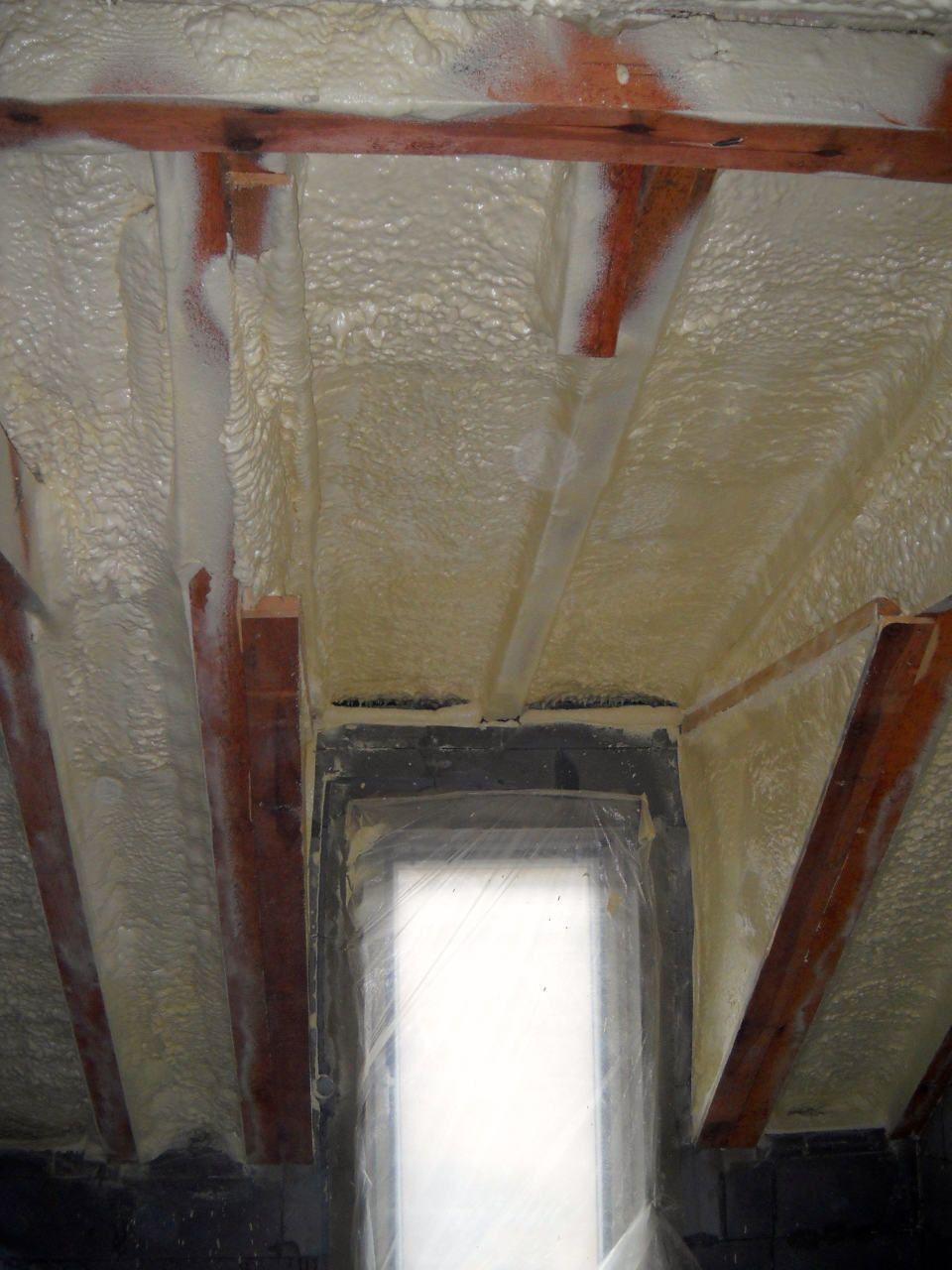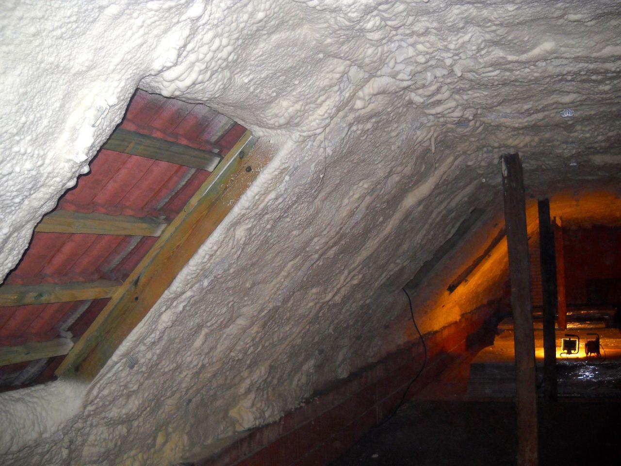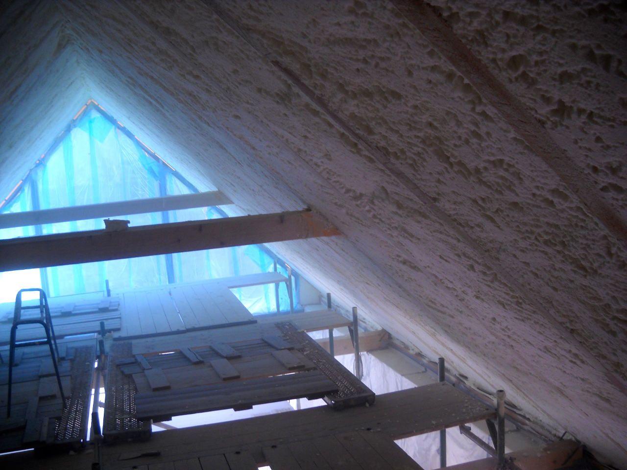 Aplikace stříkané pěny EKO S 500 na objektu starší dvoupatrové vily, kde docházelo k velkému úniku tepla. Jedná se o nástřik přímo na dřevěné bednění,kde naše pěna je k tomuto materiálu šetrná z hlediska otevřené difuze izolantu. Nedochází tudíž zde k výskytu plísní na podkladu (dřevo). Celý izolovaný prostor podkroví je tak vzduchotěsně uzavřen, ale přesto dýchá, což je podstata moderní technologie zateplování.