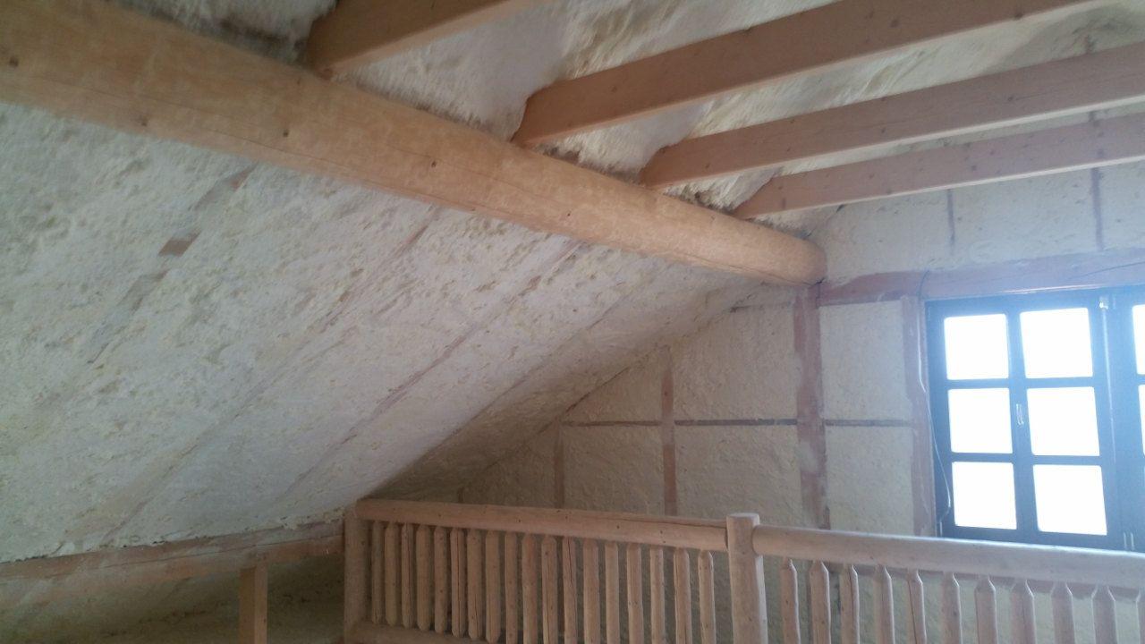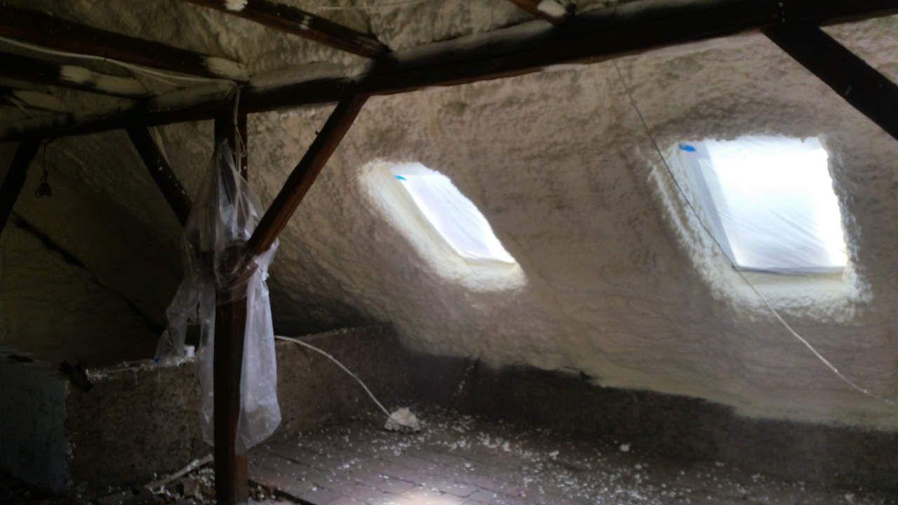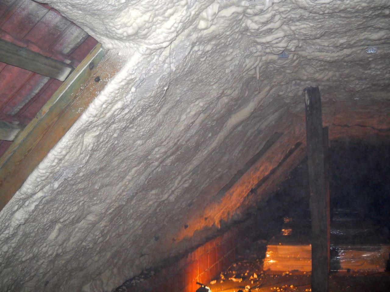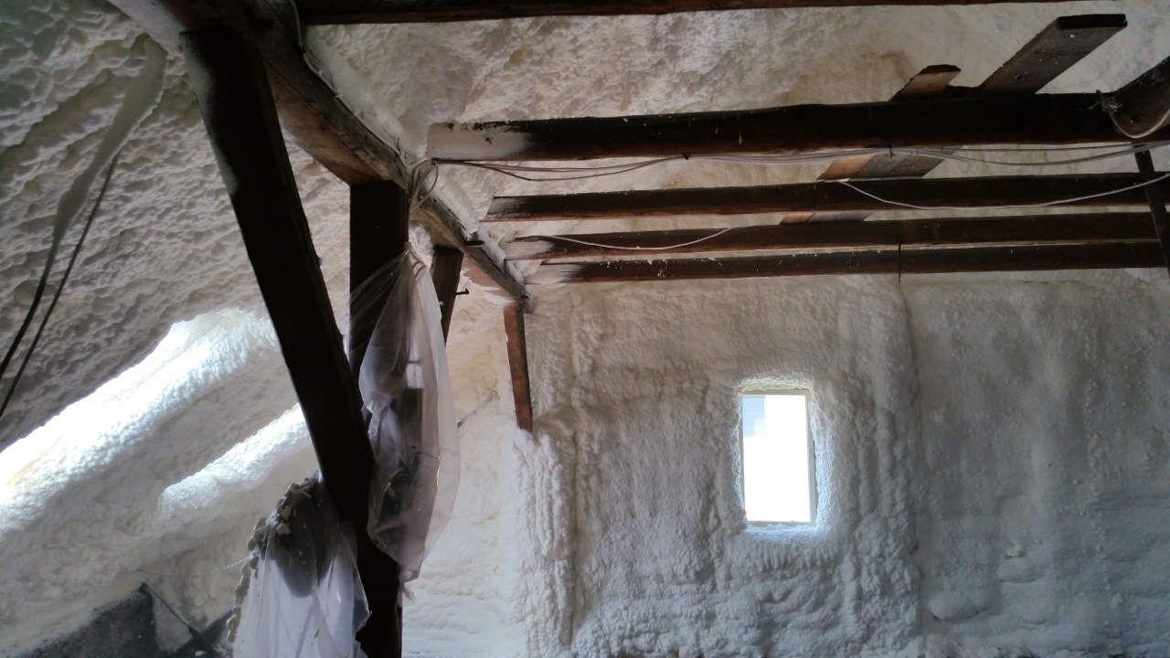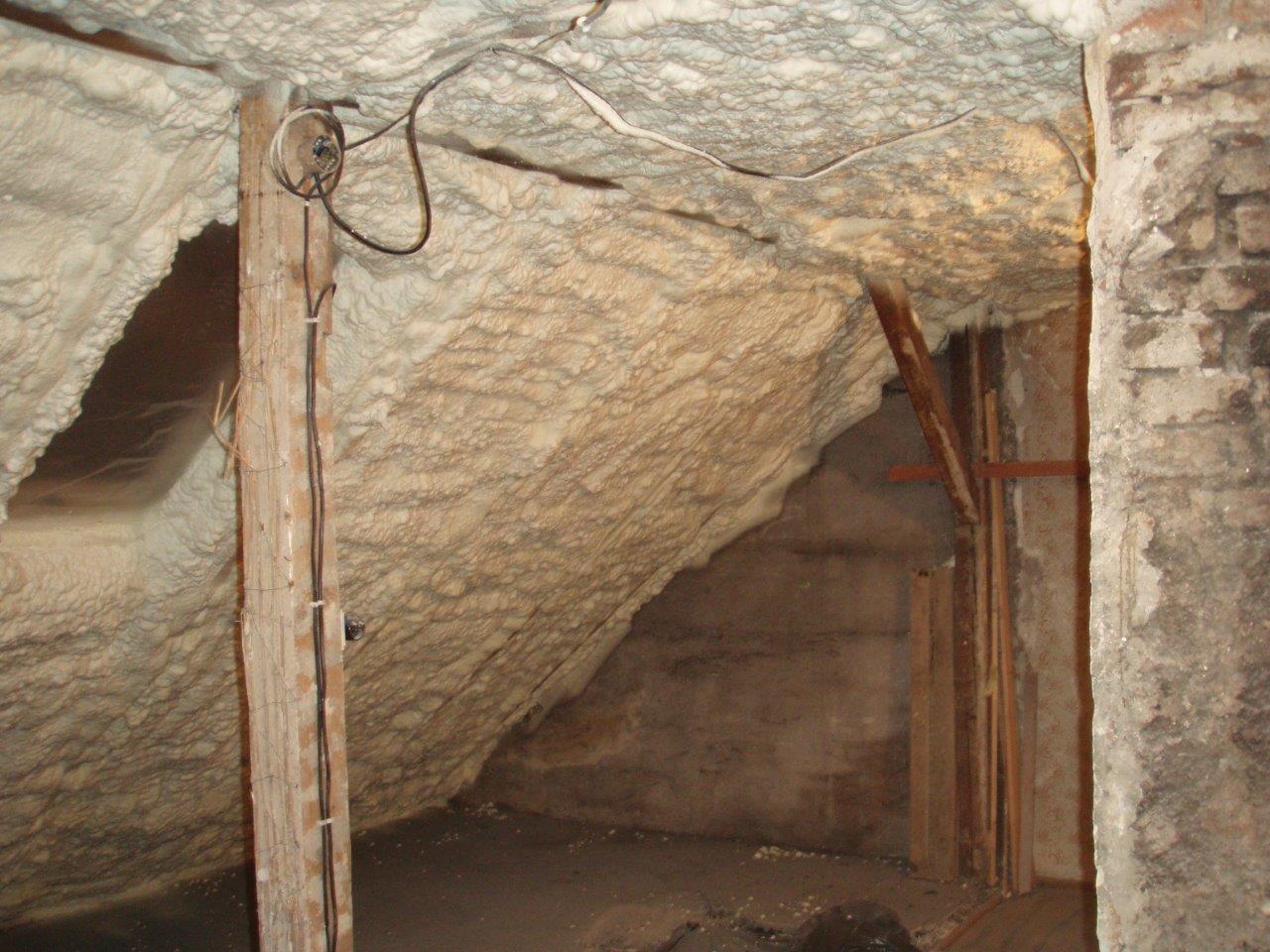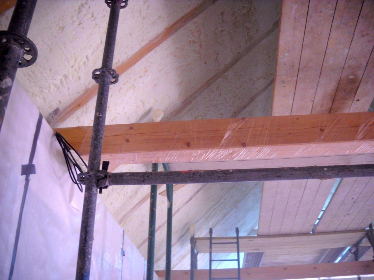 Aplikace stříkané pěny EKO S 500 na objektu starší dvoupatrové vily, kde docházelo k velkému úniku tepla. Jedná se o nástřik přímo na dřevěné bednění,kde naše pěna je k tomuto materiálu šetrná z hlediska otevřené difuze izolantu. Nedochází tudíž zde k výskytu plísní na podkladu (dřevo). Celý izolovaný prostor podkroví je tak vzduchotěsně uzavřen, ale přesto dýchá, což je podstata moderní technologie zateplování.