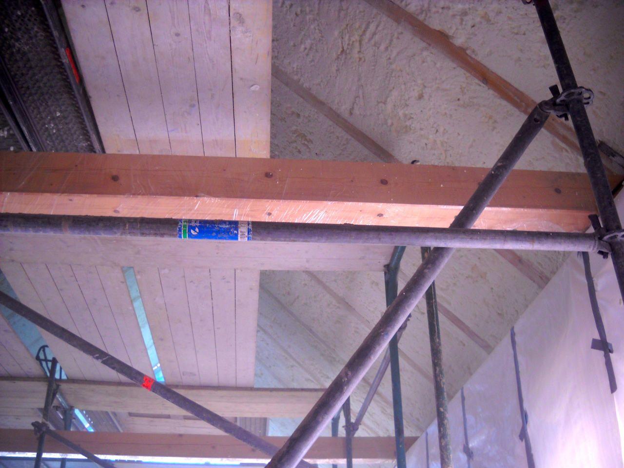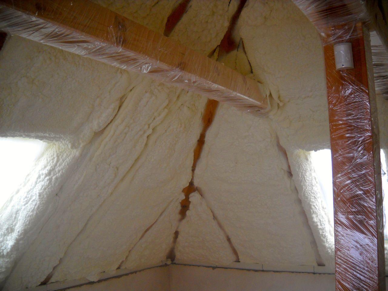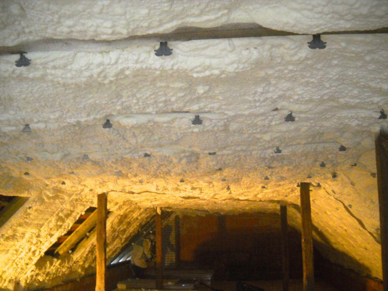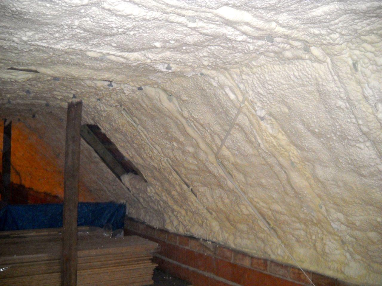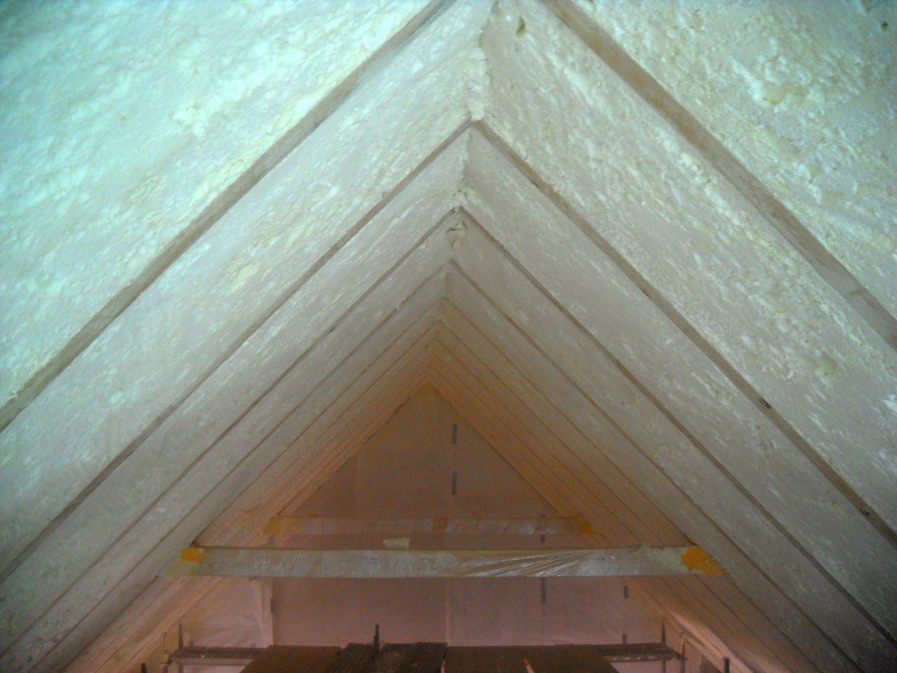 Aplikace stříkané pěny EKO S 500 na objektu starší dvoupatrové vily, kde docházelo k velkému úniku tepla. Jedná se o nástřik přímo na dřevěné bednění,kde naše pěna je k tomuto materiálu šetrná z hlediska otevřené difuze izolantu. Nedochází tudíž zde k výskytu plísní na podkladu (dřevo). Celý izolovaný prostor podkroví je tak vzduchotěsně uzavřen, ale přesto dýchá, což je podstata moderní technologie zateplování.