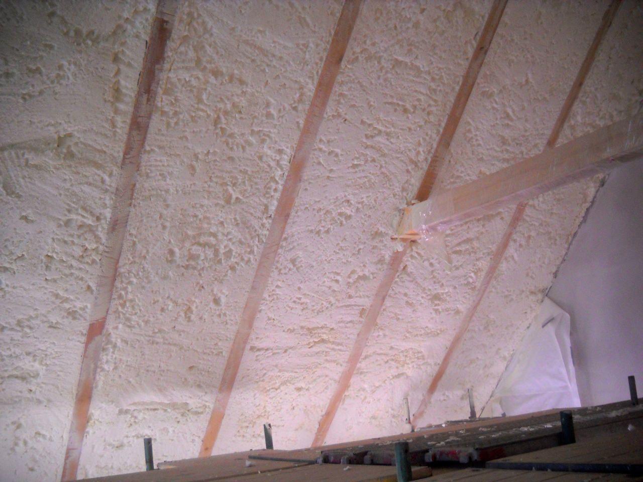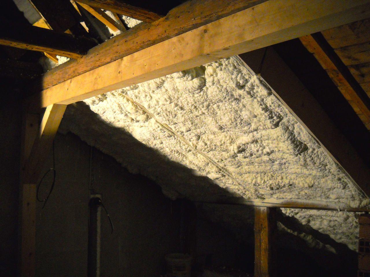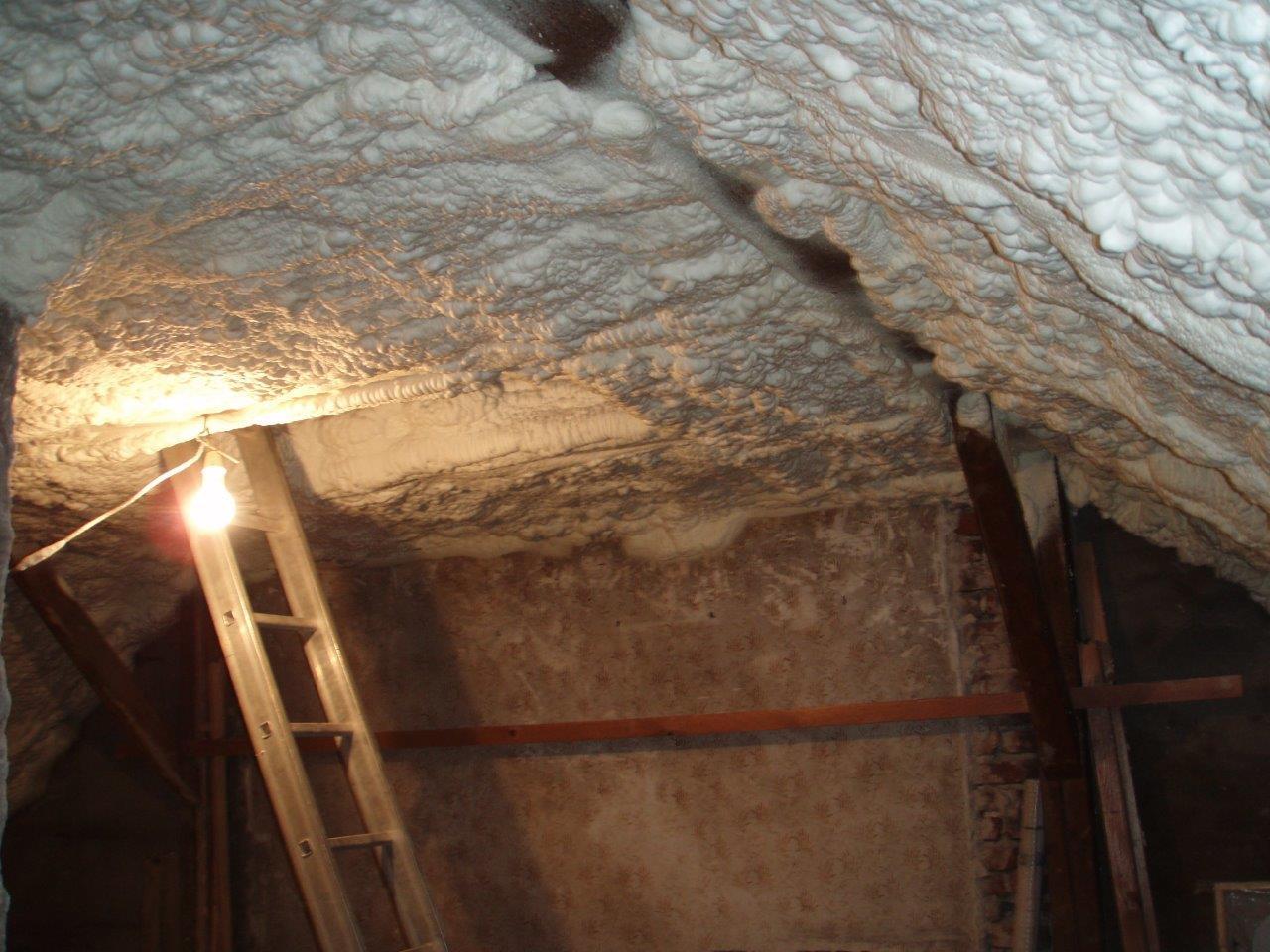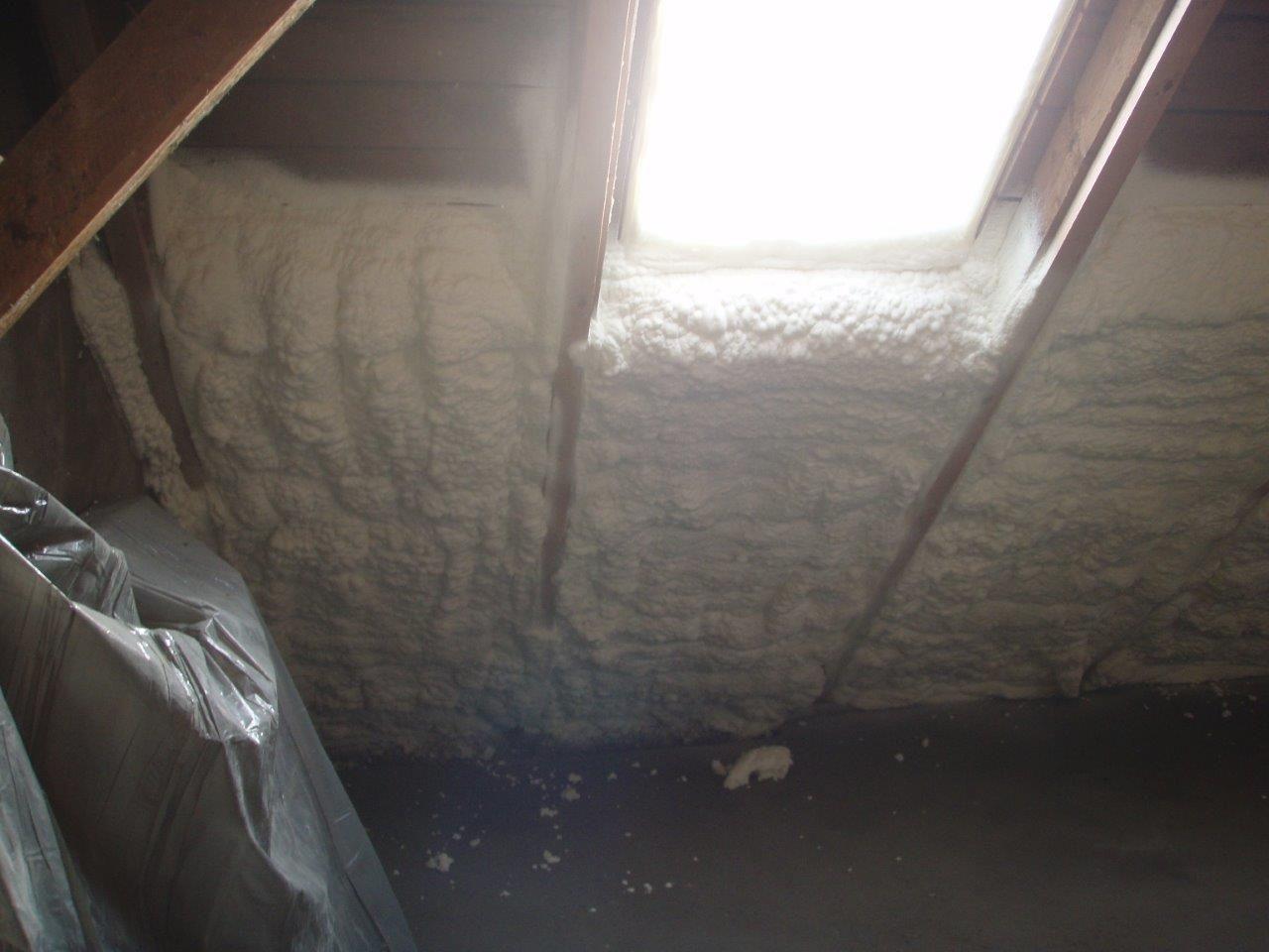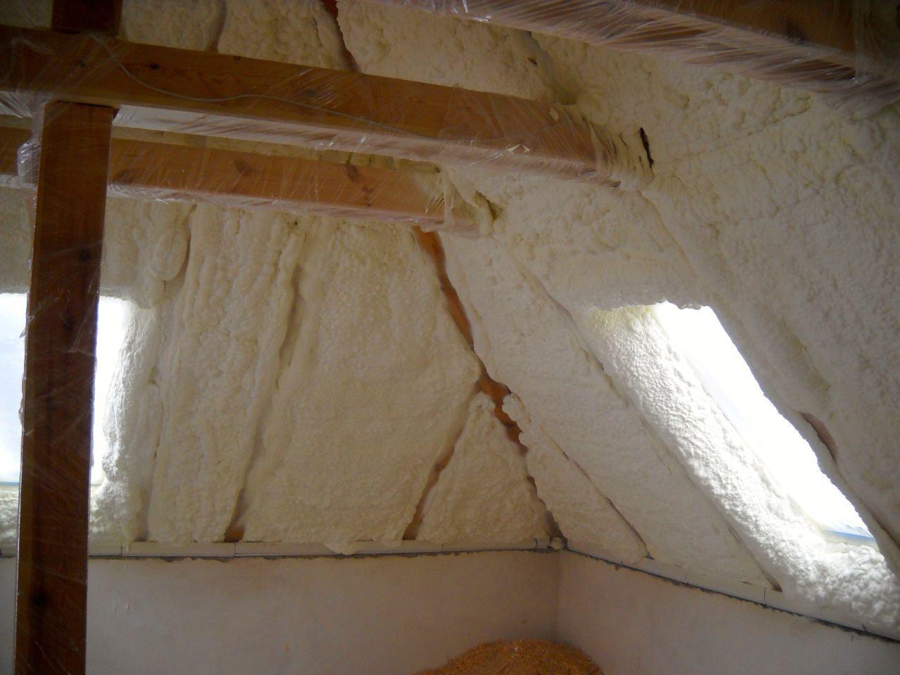Aplikace stříkané pěny EKO S 500 na objektu starší dvoupatrové vily, kde docházelo k velkému úniku tepla. Jedná se o nástřik přímo na dřevěné bednění,kde naše pěna je k tomuto materiálu šetrná z hlediska otevřené difuze izolantu. Nedochází tudíž zde k výskytu plísní na podkladu (dřevo). Celý izolovaný prostor podkroví je tak vzduchotěsně uzavřen, ale přesto dýchá, což je podstata moderní technologie zateplování.
