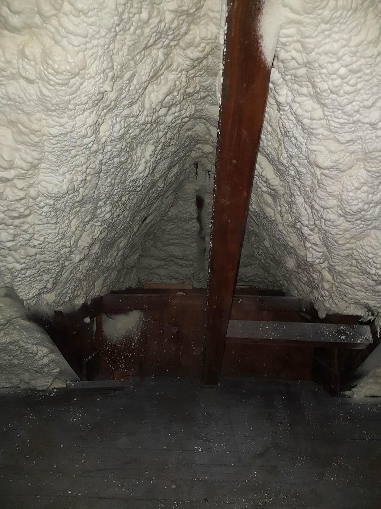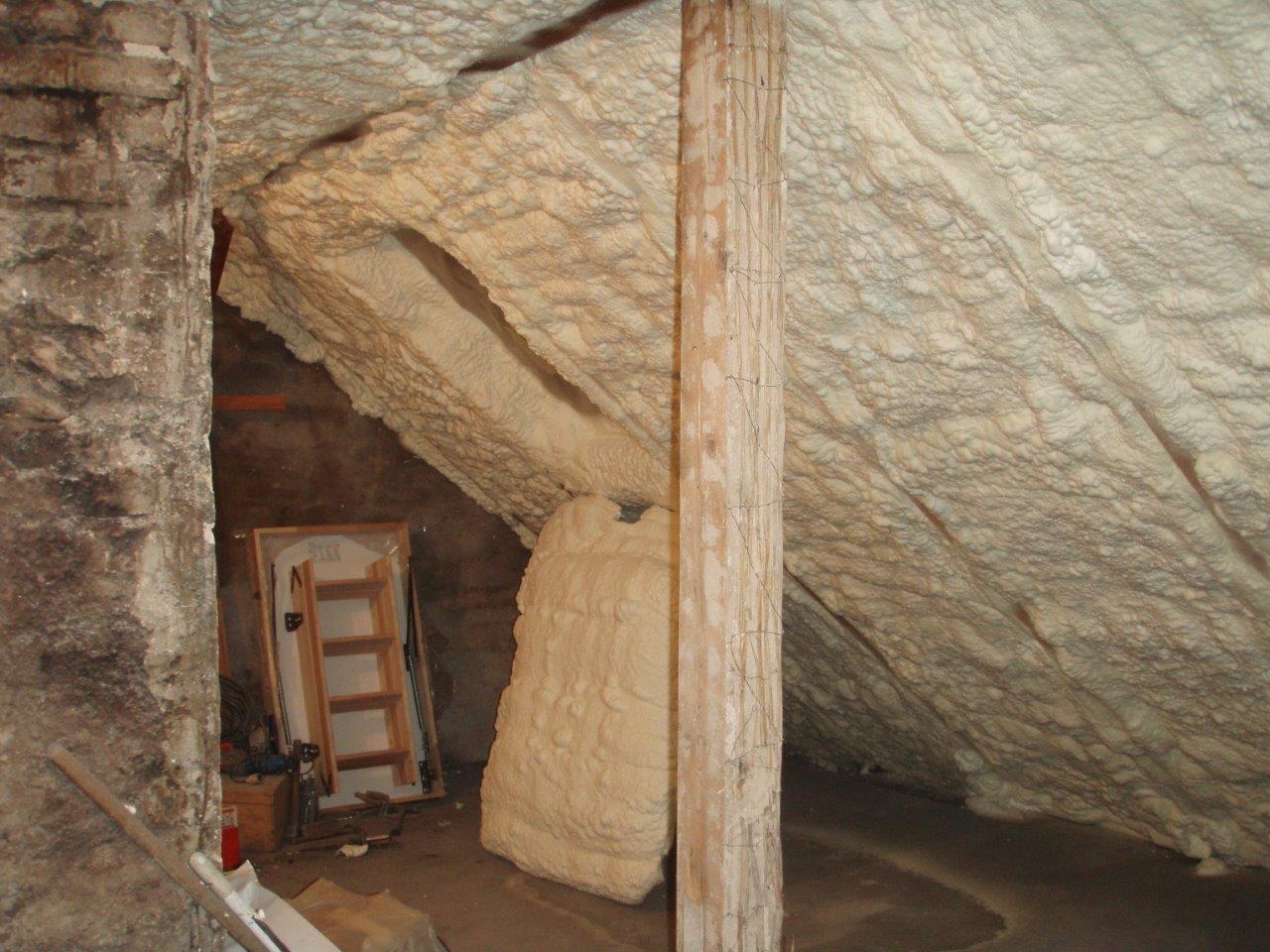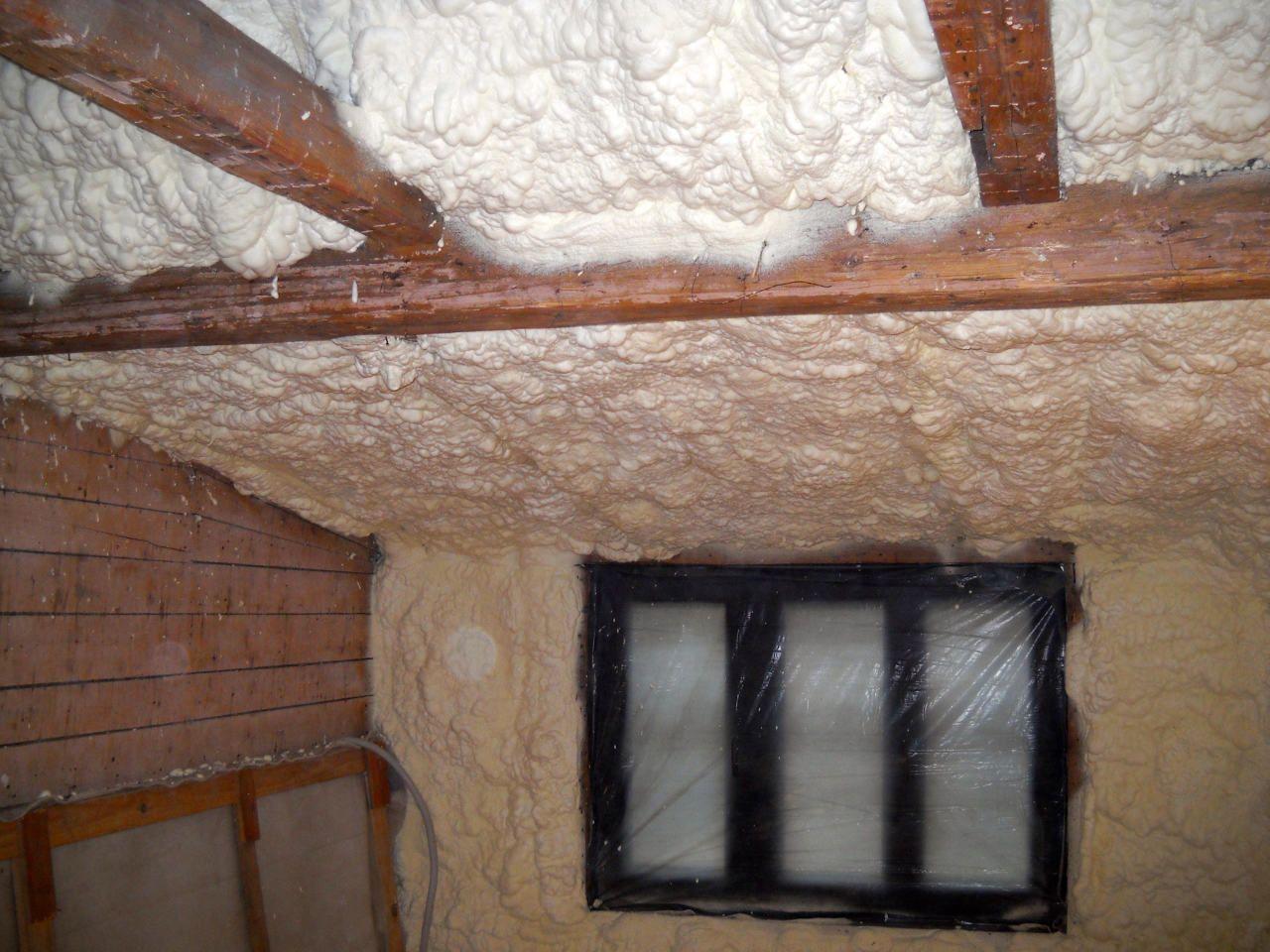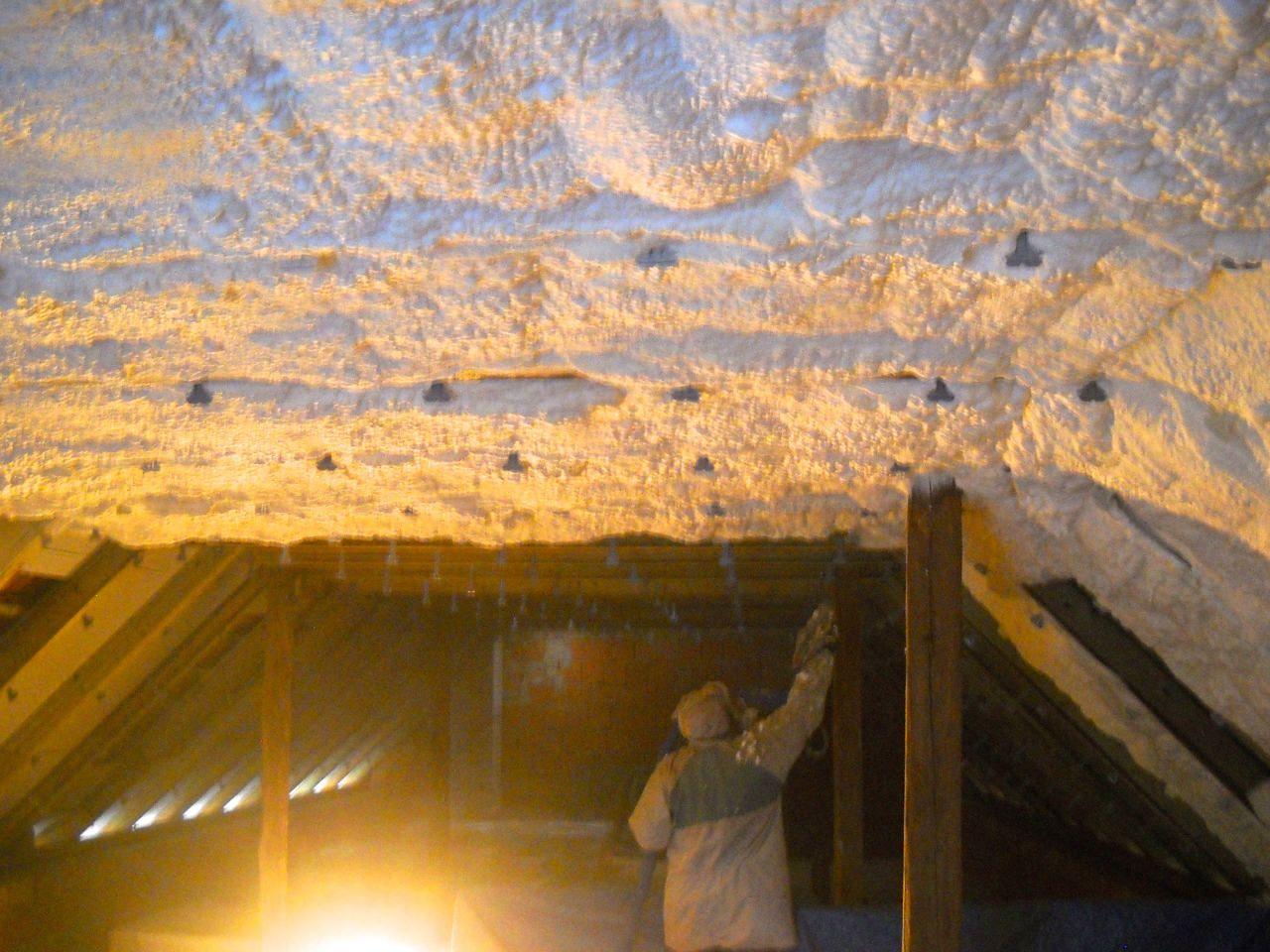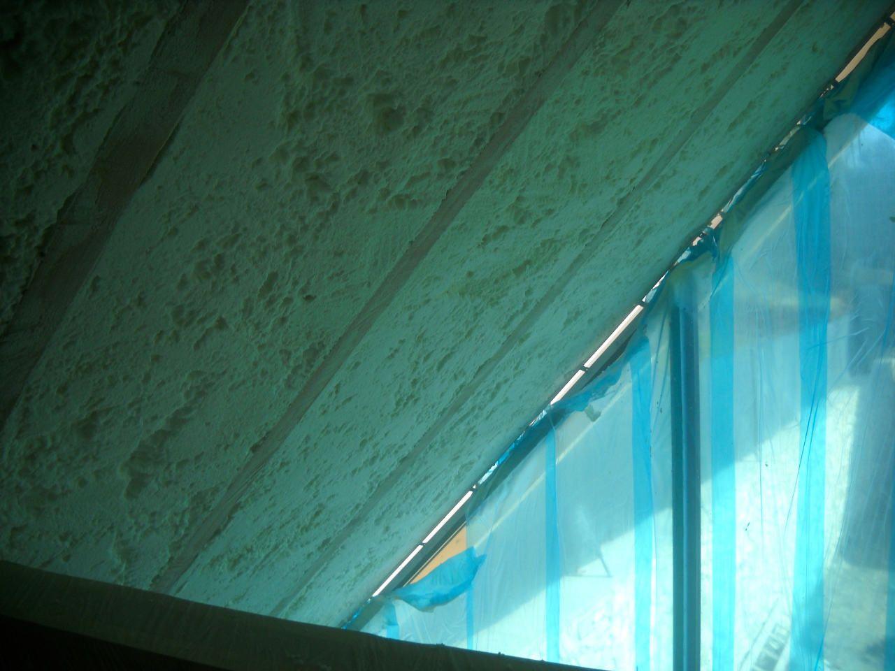 Aplikace stříkané pěny EKO S 500 na objektu starší dvoupatrové vily, kde docházelo k velkému úniku tepla. Jedná se o nástřik přímo na dřevěné bednění,kde naše pěna je k tomuto materiálu šetrná z hlediska otevřené difuze izolantu. Nedochází tudíž zde k výskytu plísní na podkladu (dřevo). Celý izolovaný prostor podkroví je tak vzduchotěsně uzavřen, ale přesto dýchá, což je podstata moderní technologie zateplování.
