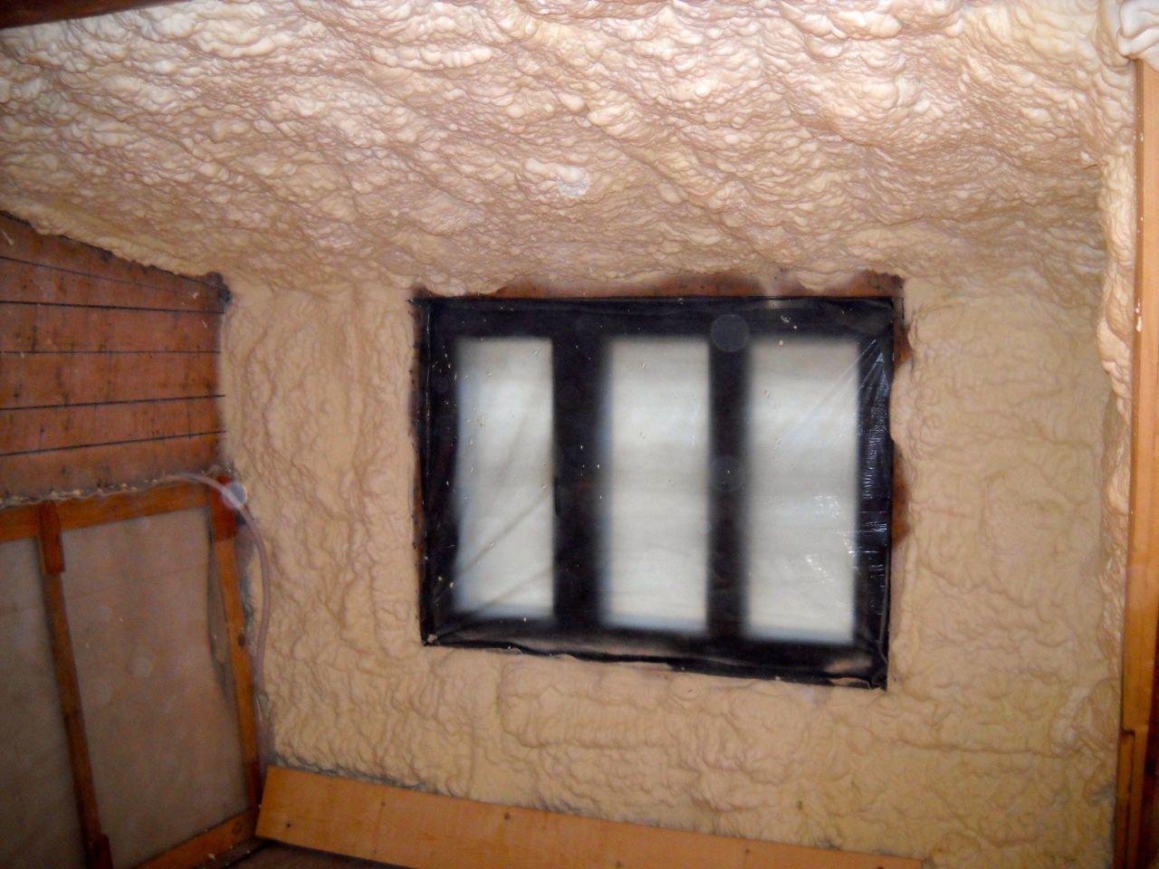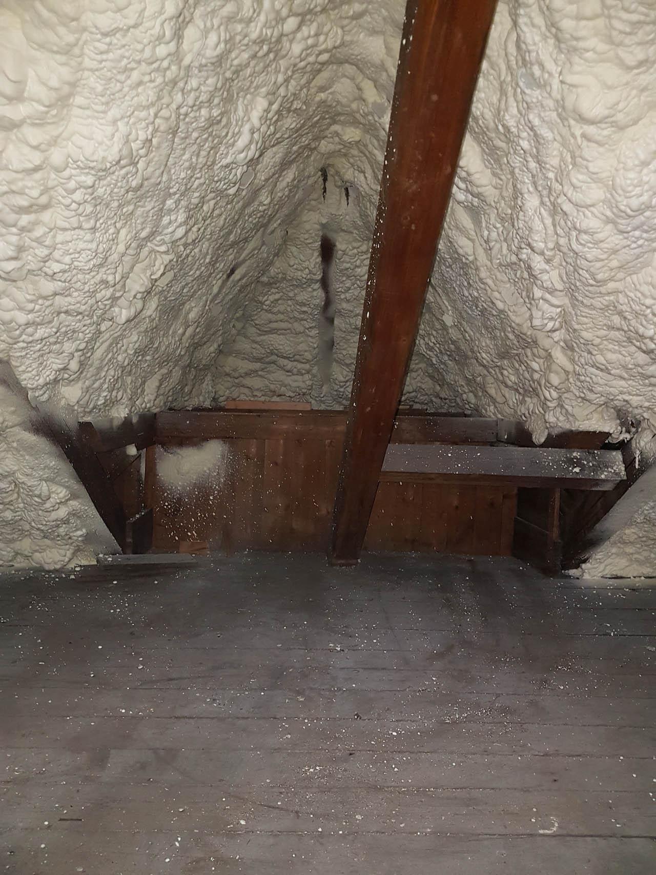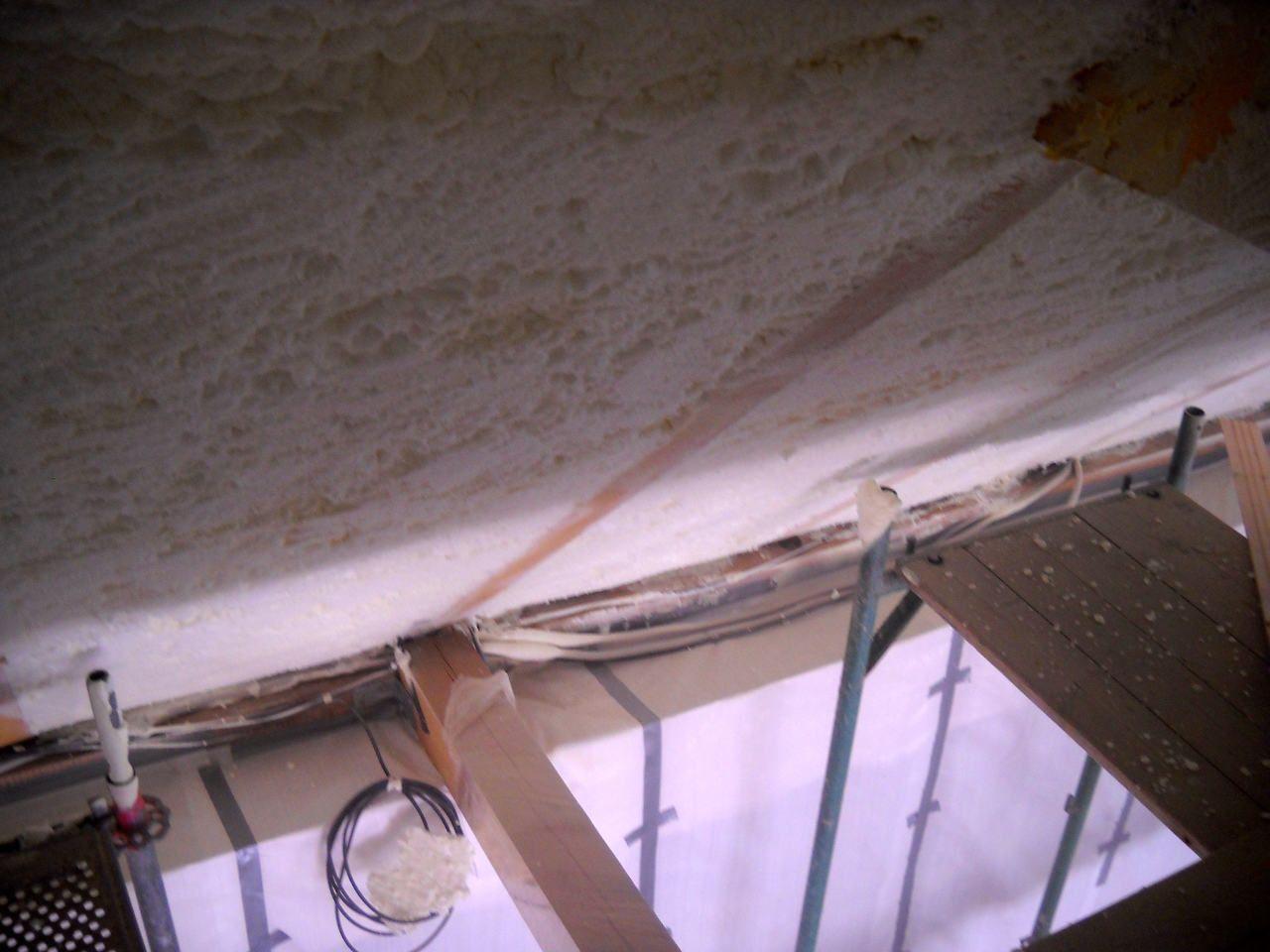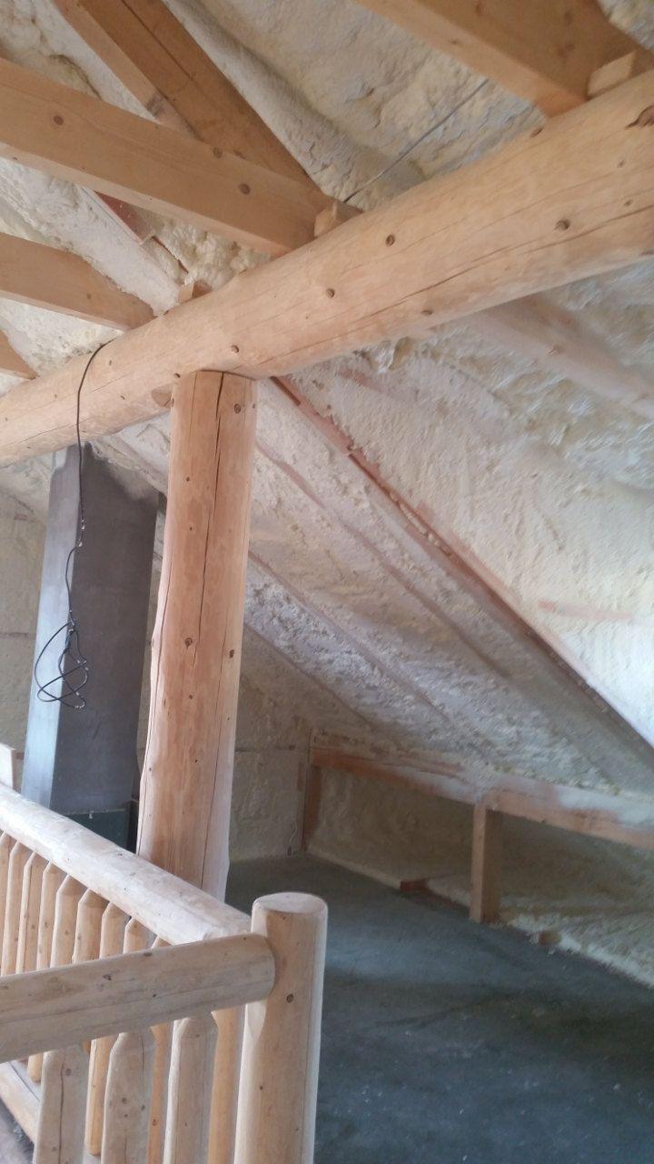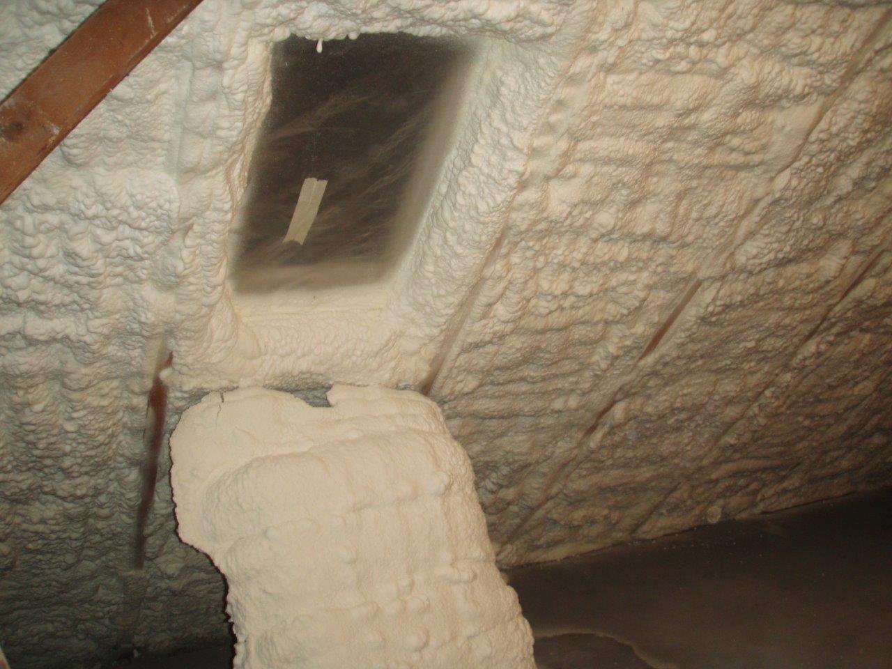 Aplikace stříkané pěny EKO S 500 na objektu starší dvoupatrové vily, kde docházelo k velkému úniku tepla. Jedná se o nástřik přímo na dřevěné bednění,kde naše pěna je k tomuto materiálu šetrná z hlediska otevřené difuze izolantu. Nedochází tudíž zde k výskytu plísní na podkladu (dřevo). Celý izolovaný prostor podkroví je tak vzduchotěsně uzavřen, ale přesto dýchá, což je podstata moderní technologie zateplování.