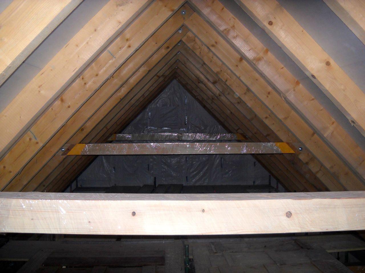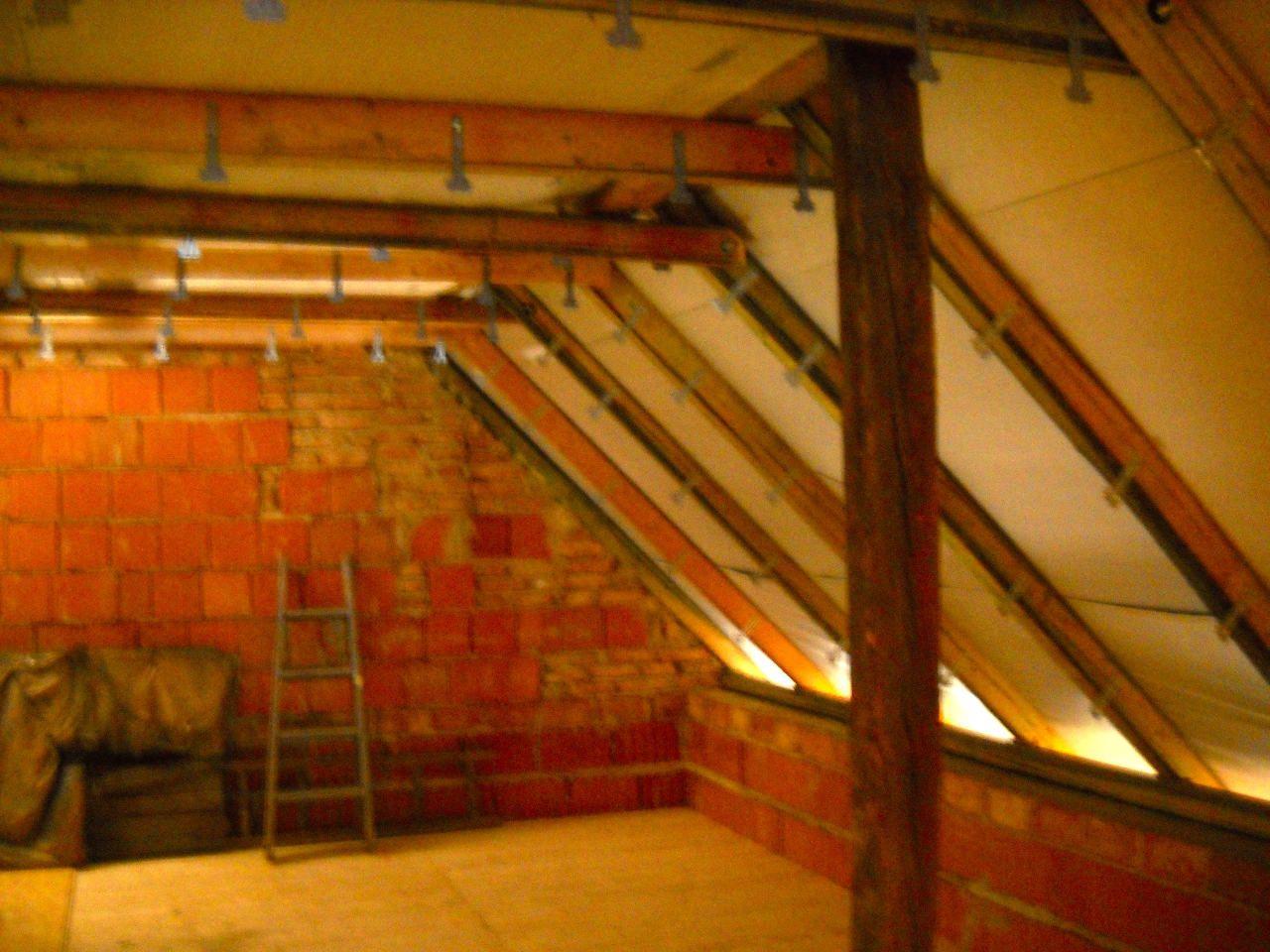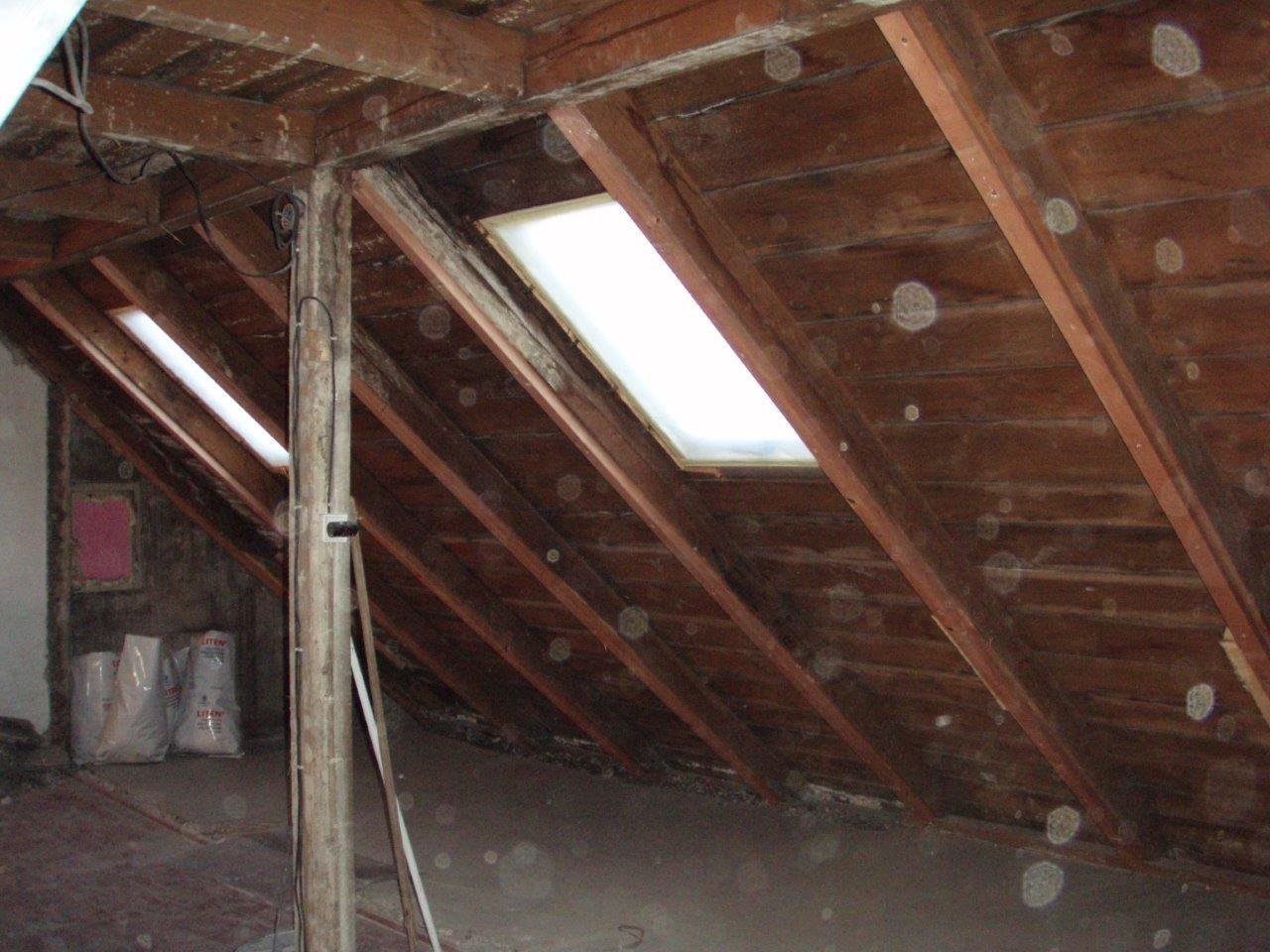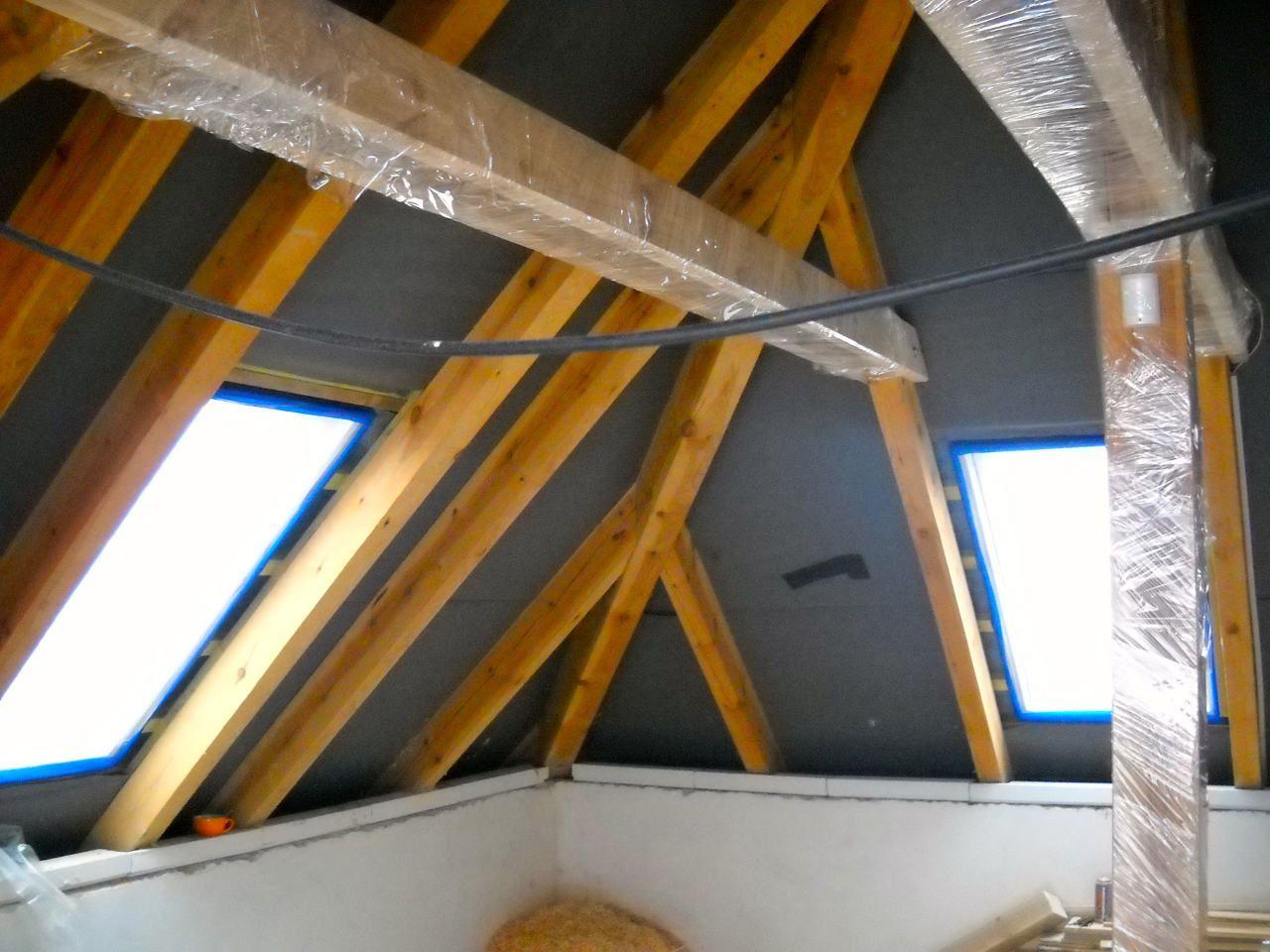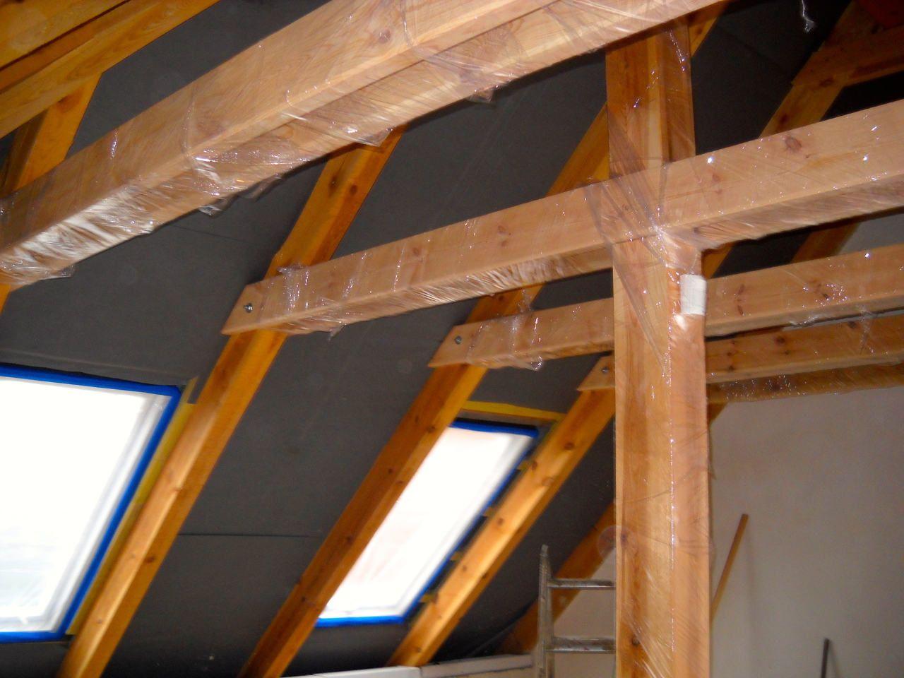 2 x šikminy délky 3m - krokve 10/14. Nastaveny profily SDK pro pěnu o tloušťce 25 cm. Strop - klaštiny délky 5m s podbitím z OSB desek, nástřik pěny z půdy rovněž 25 cm, bednění střechy z prken.
