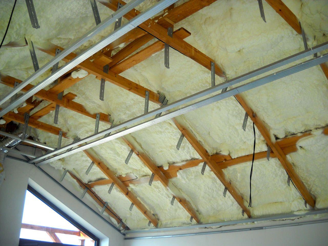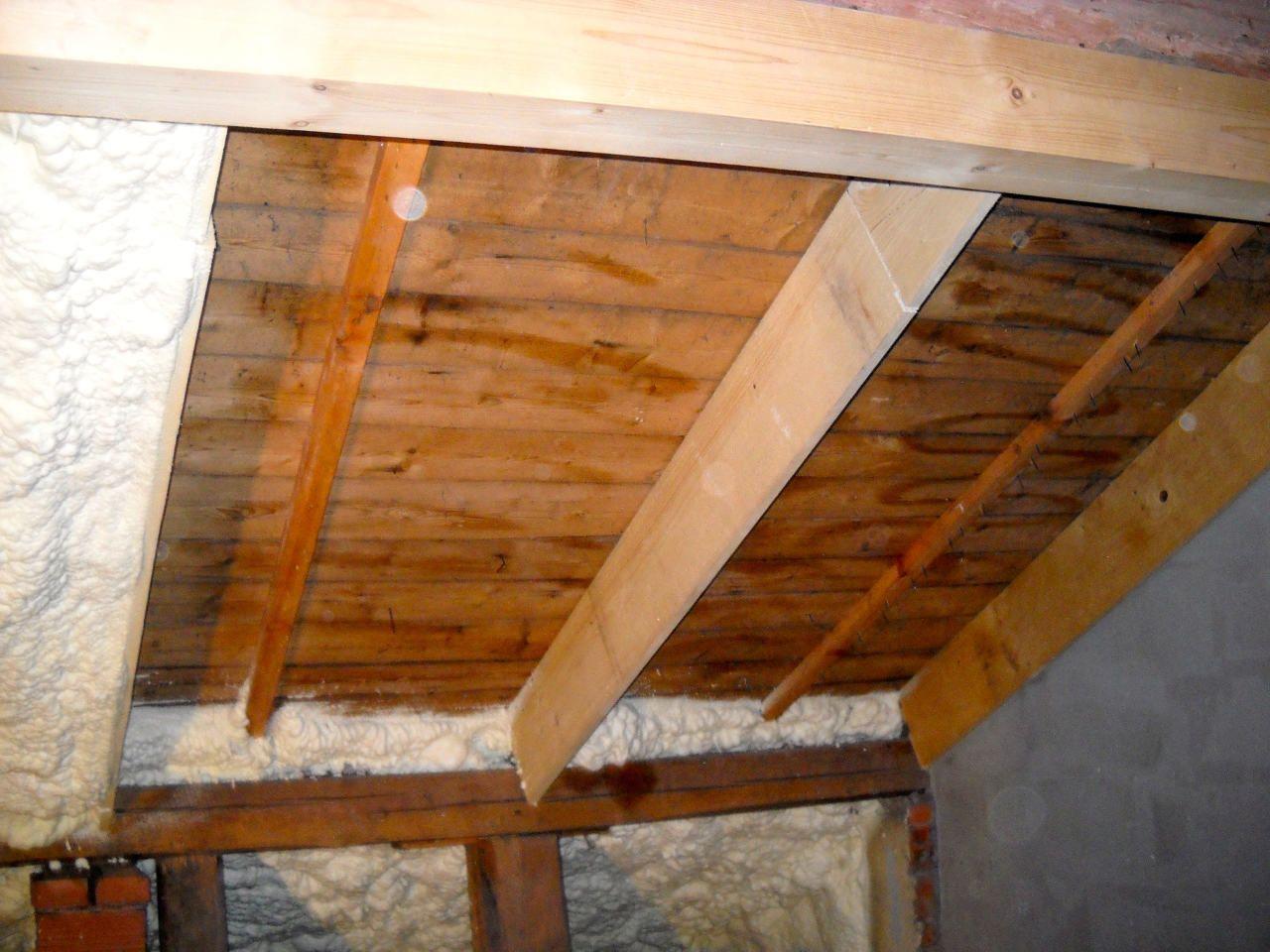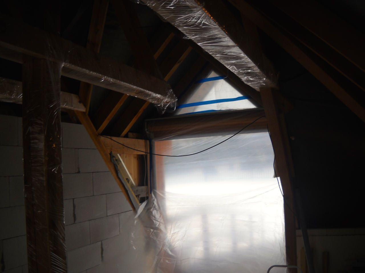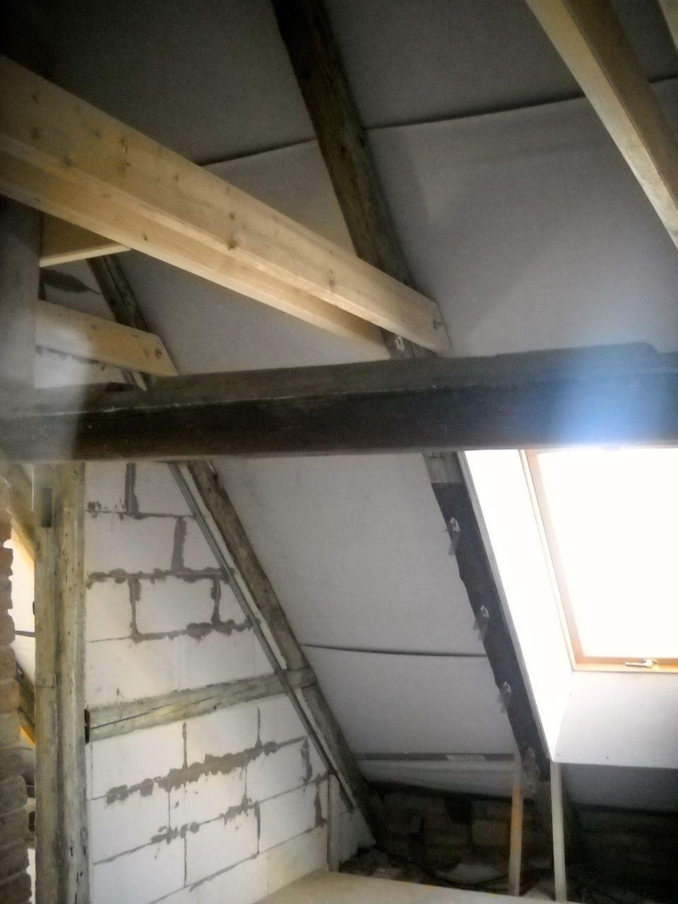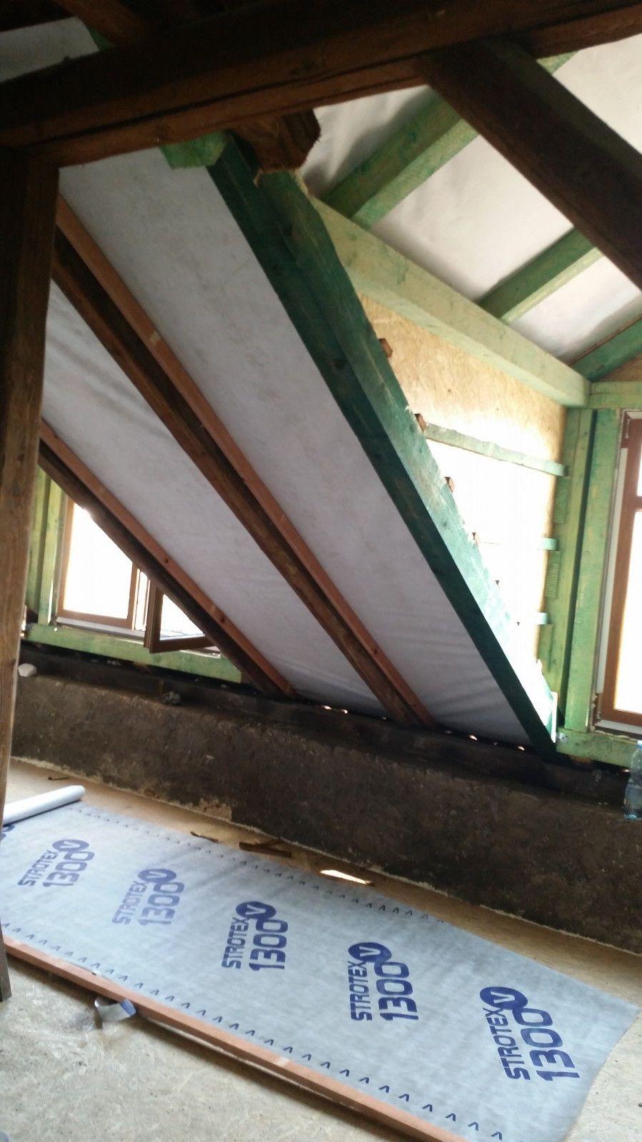 2 x šikminy délky 3m - krokve 10/14. Nastaveny profily SDK pro pěnu o tloušťce 25 cm. Strop - klaštiny délky 5m s podbitím z OSB desek, nástřik pěny z půdy rovněž 25 cm, bednění střechy z prken.