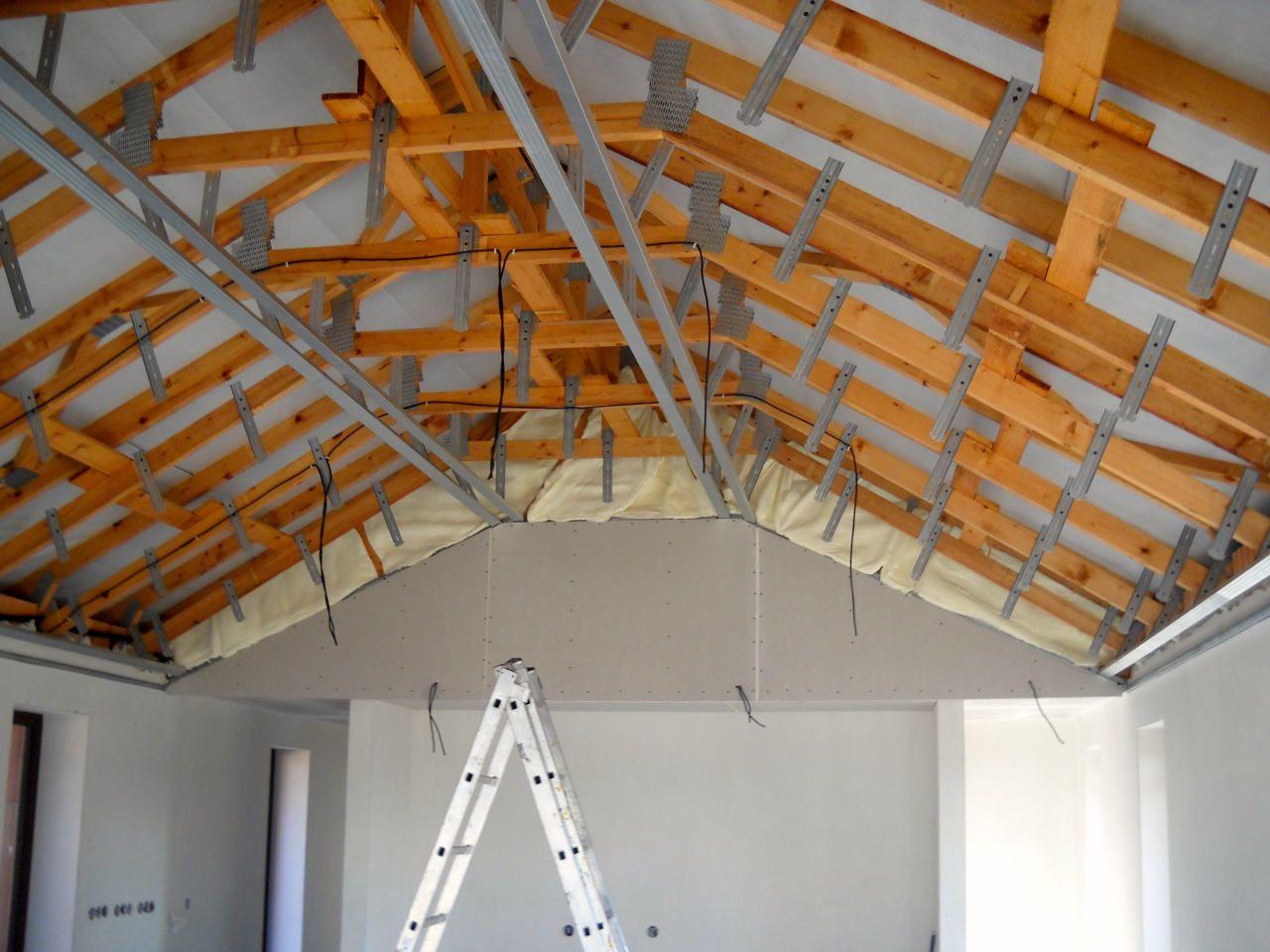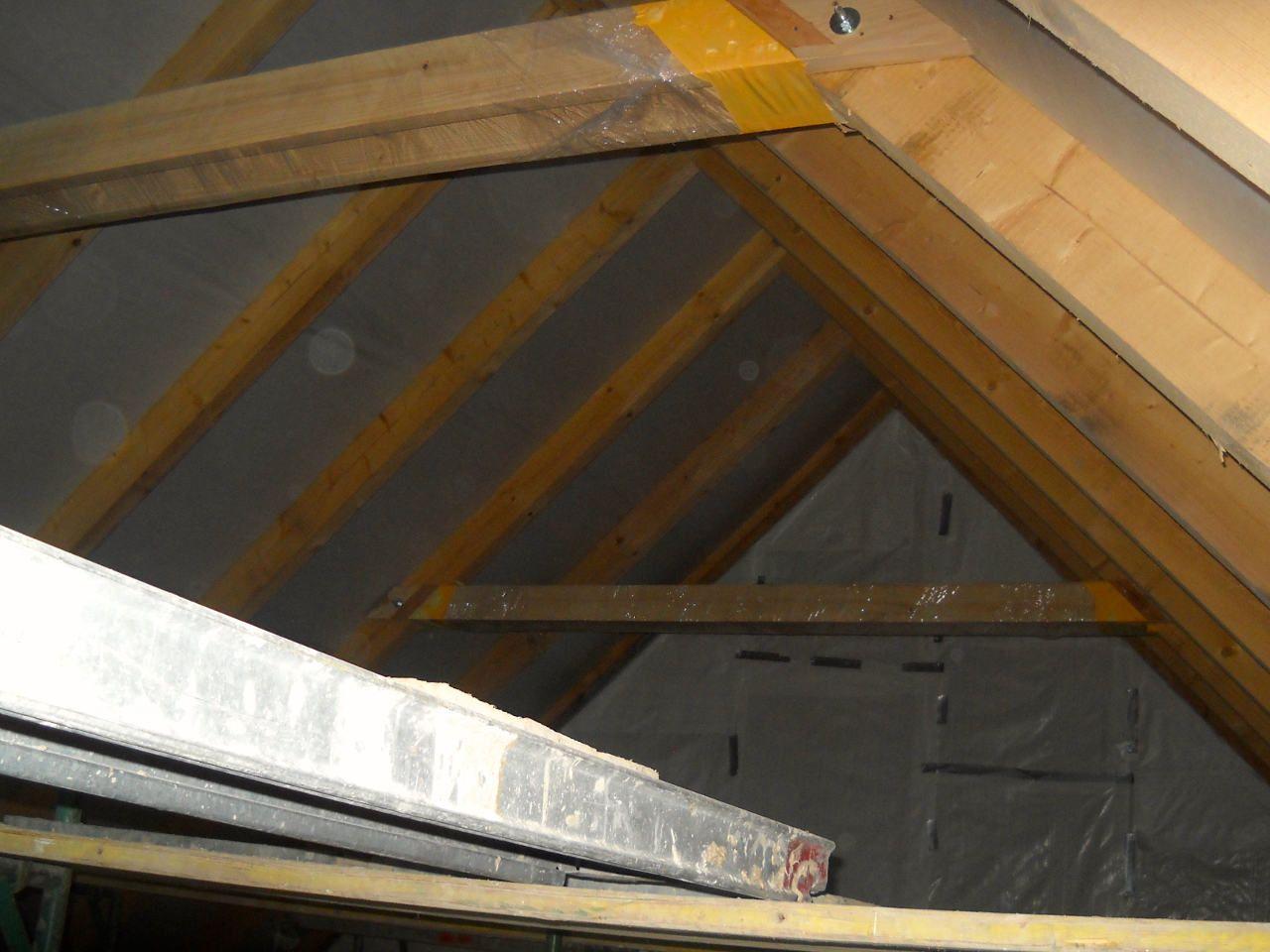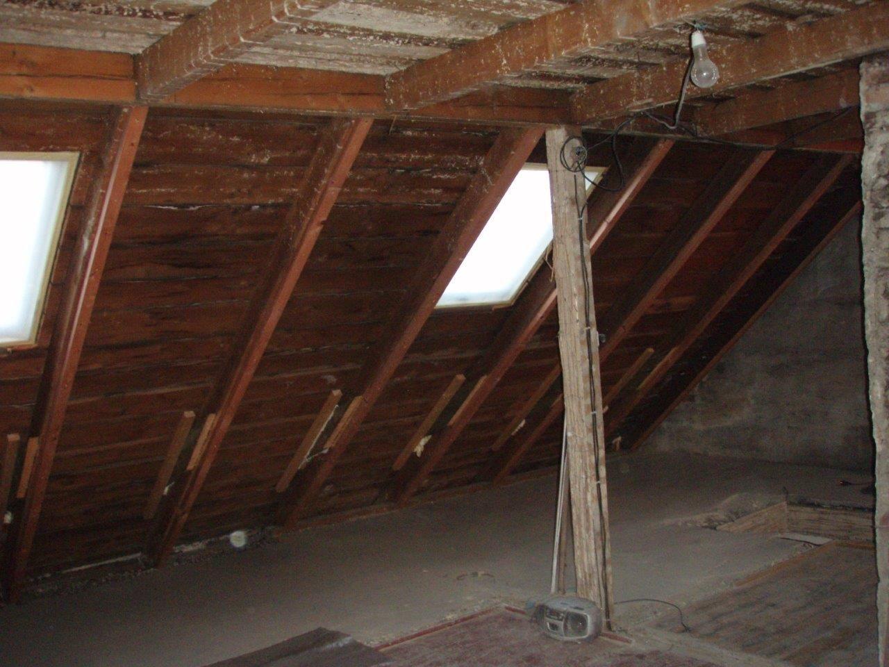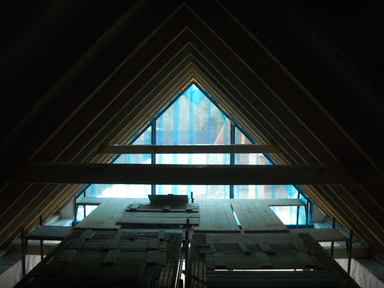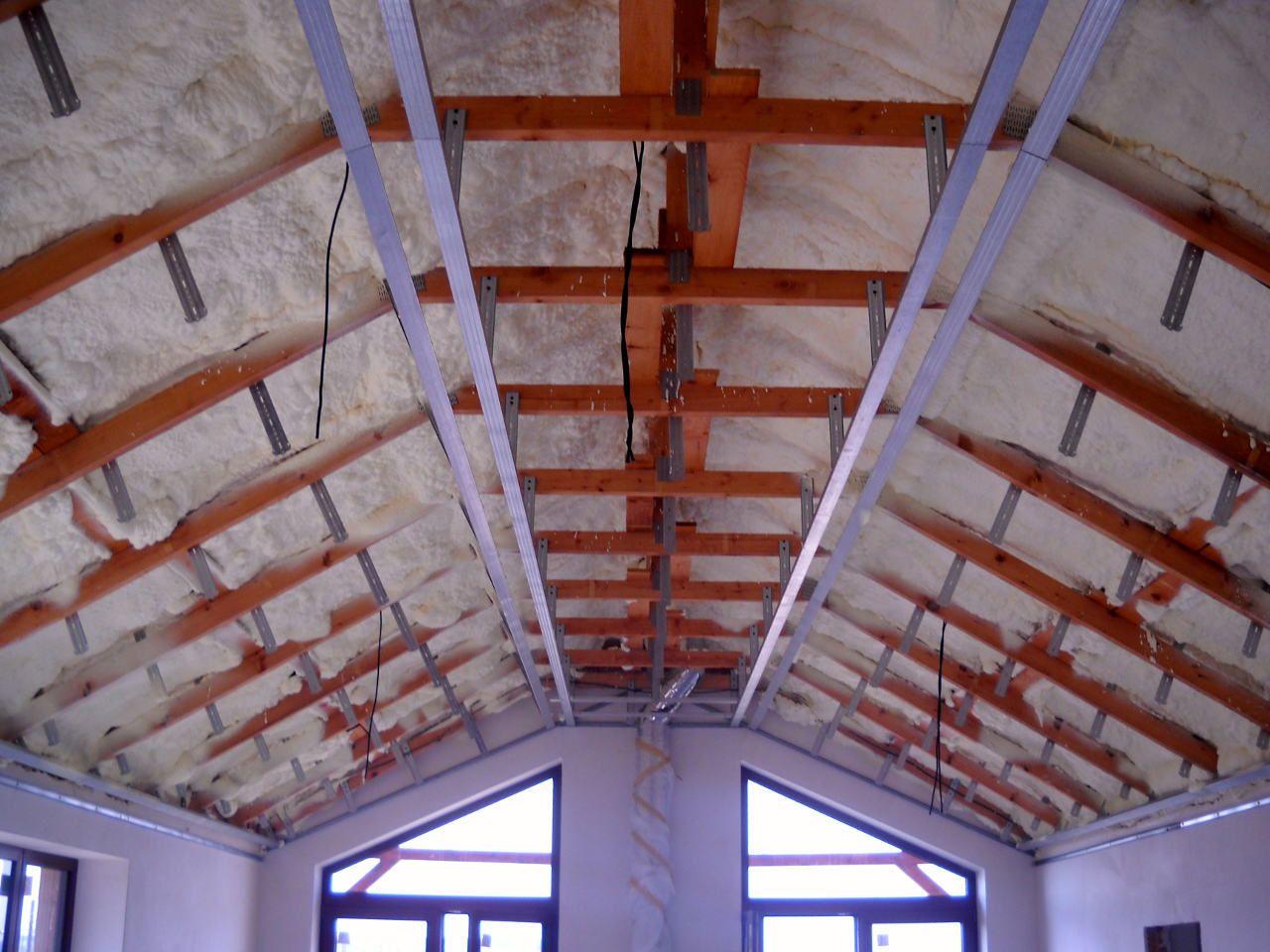 2 x šikminy délky 3m - krokve 10/14. Nastaveny profily SDK pro pěnu o tloušťce 25 cm. Strop - klaštiny délky 5m s podbitím z OSB desek, nástřik pěny z půdy rovněž 25 cm, bednění střechy z prken.