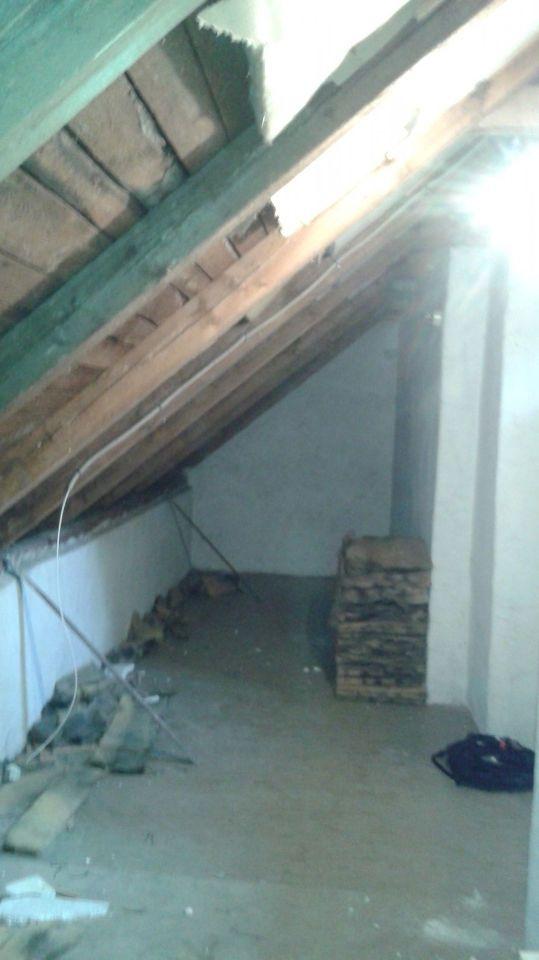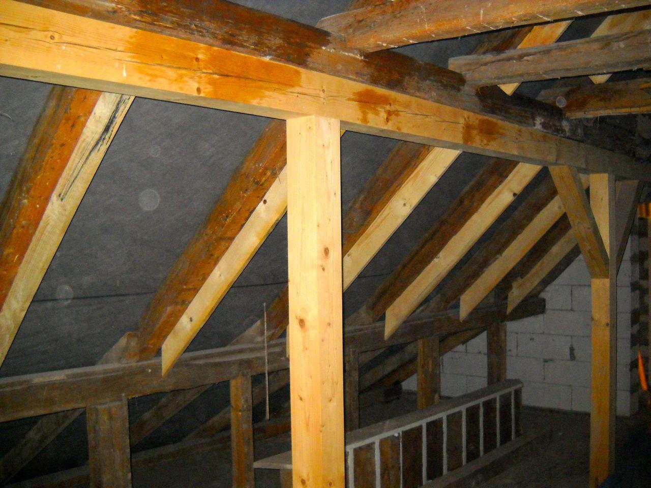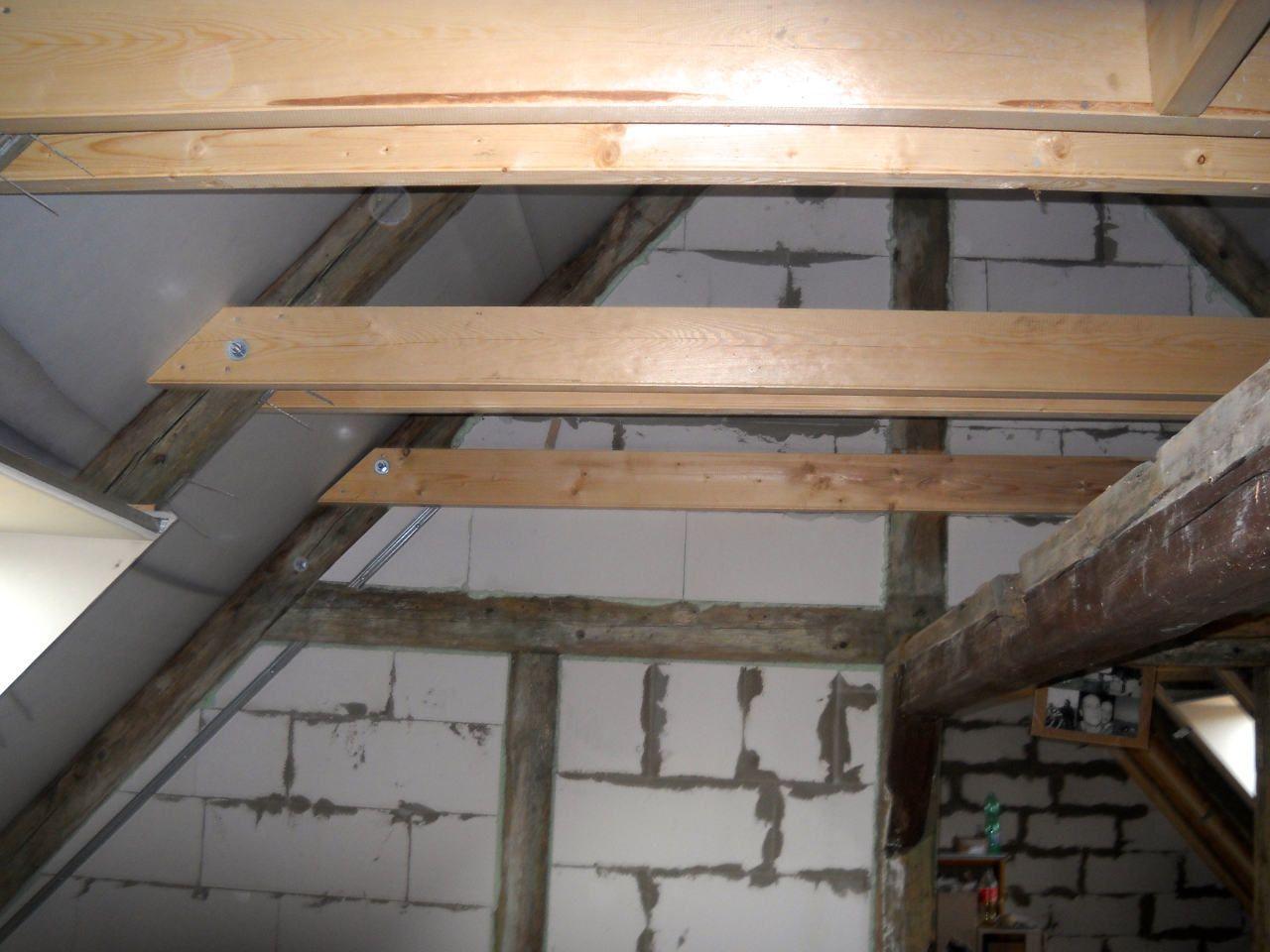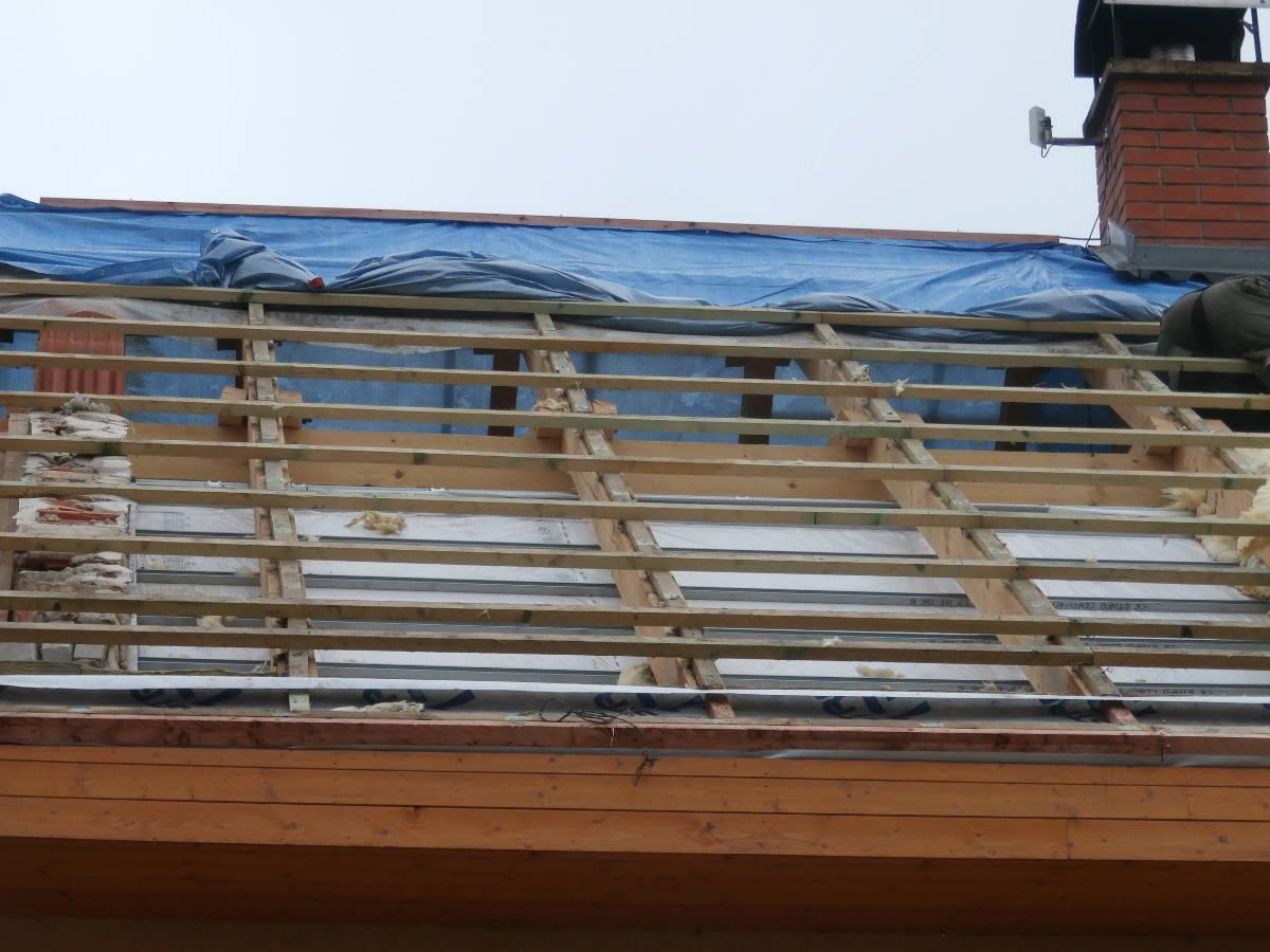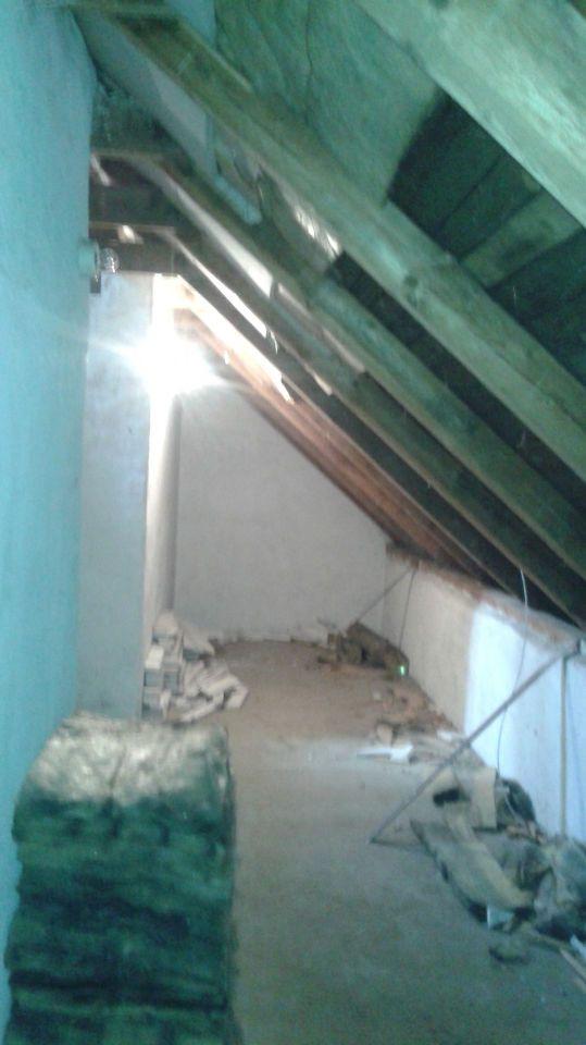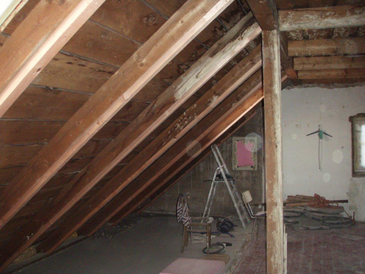 2 x šikminy délky 3m - krokve 10/14. Nastaveny profily SDK pro pěnu o tloušťce 25 cm. Strop - klaštiny délky 5m s podbitím z OSB desek, nástřik pěny z půdy rovněž 25 cm, bednění střechy z prken.
