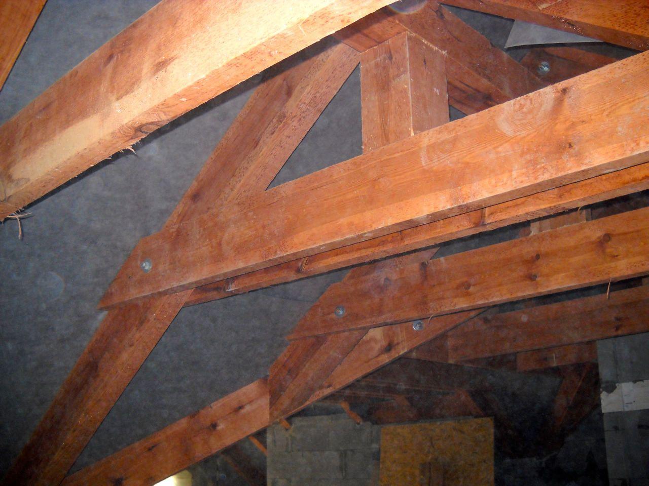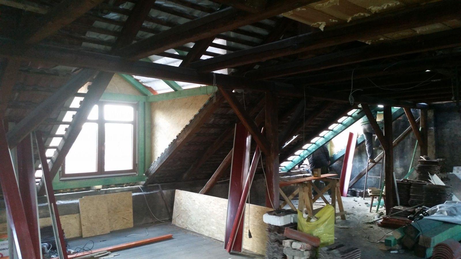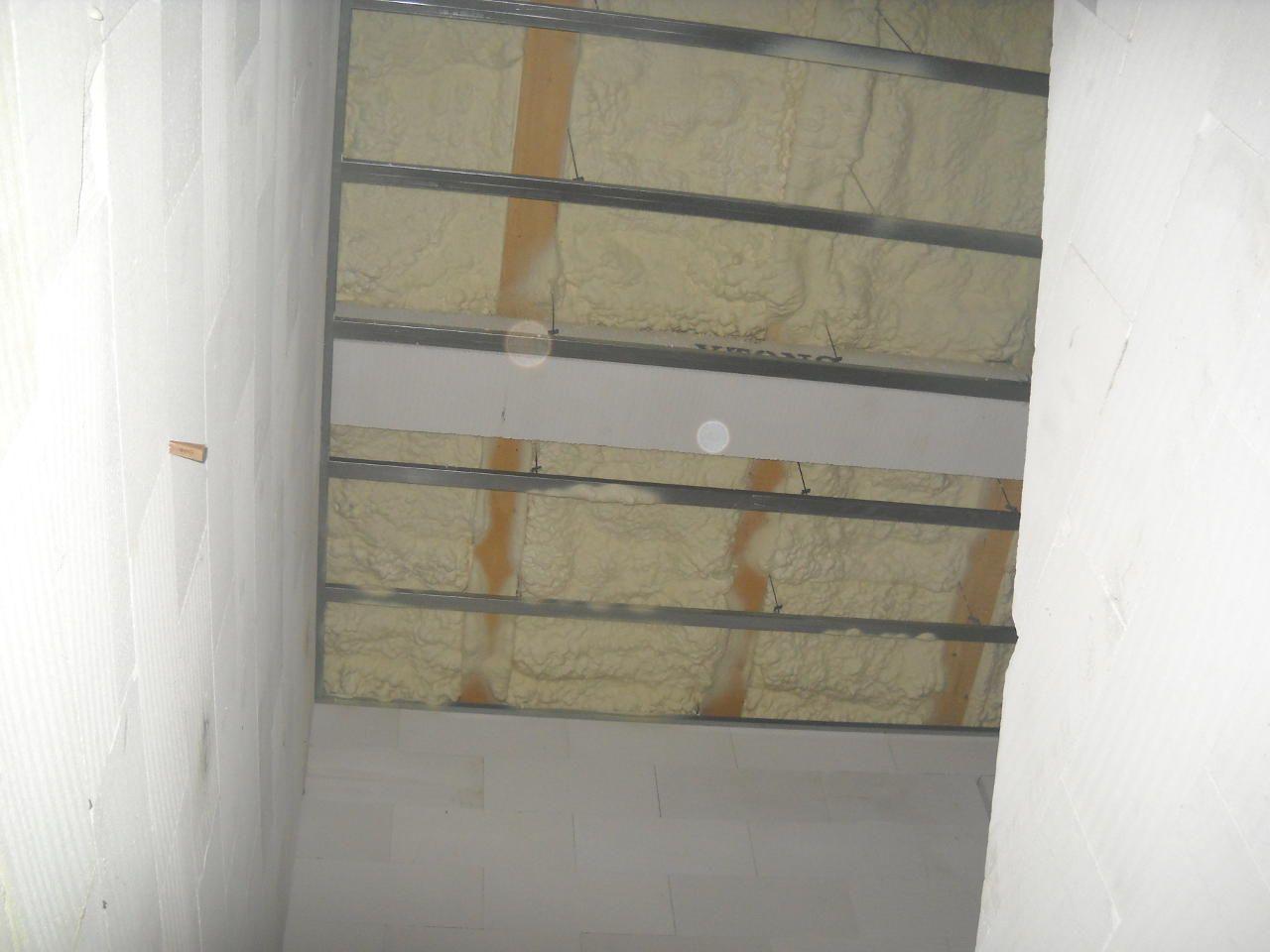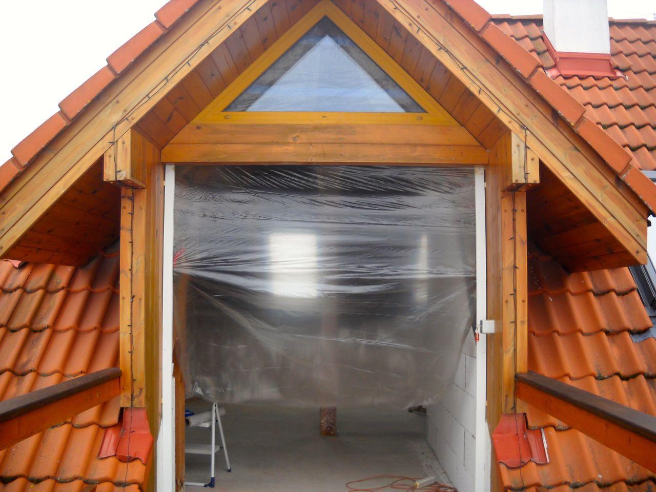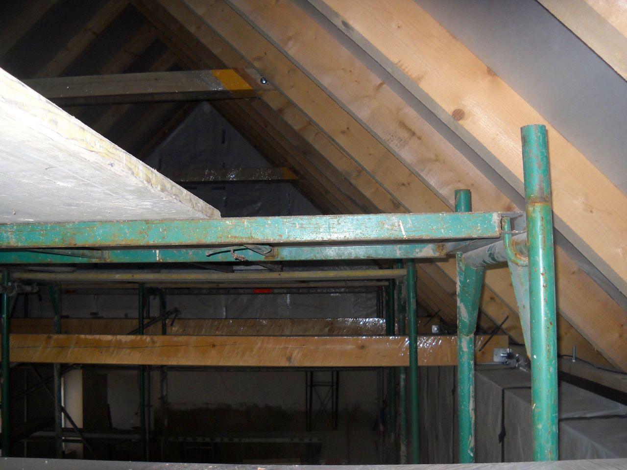 2 x šikminy délky 3m - krokve 10/14. Nastaveny profily SDK pro pěnu o tloušťce 25 cm. Strop - klaštiny délky 5m s podbitím z OSB desek, nástřik pěny z půdy rovněž 25 cm, bednění střechy z prken.