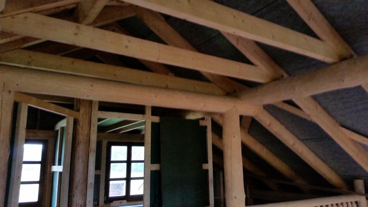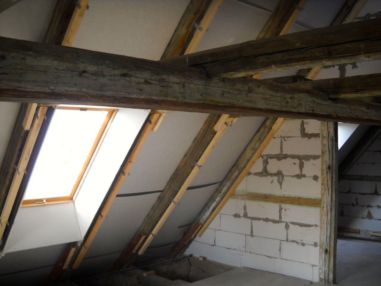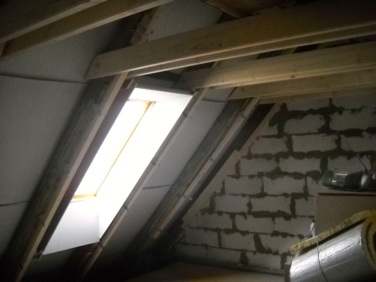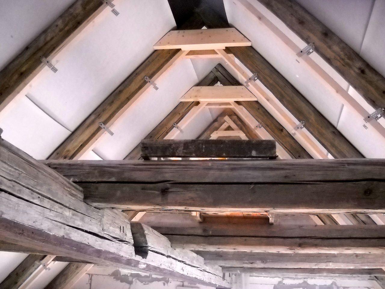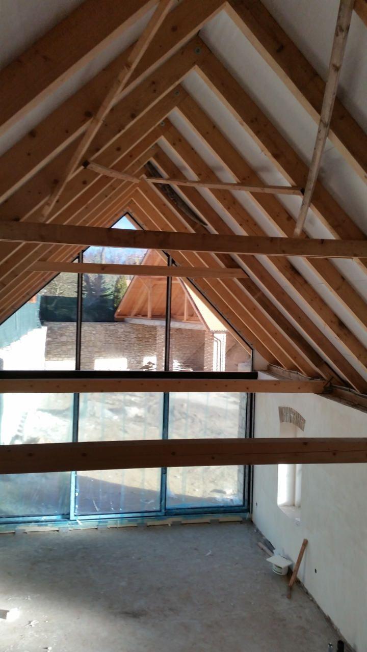 2 x šikminy délky 3m - krokve 10/14. Nastaveny profily SDK pro pěnu o tloušťce 25 cm. Strop - klaštiny délky 5m s podbitím z OSB desek, nástřik pěny z půdy rovněž 25 cm, bednění střechy z prken.