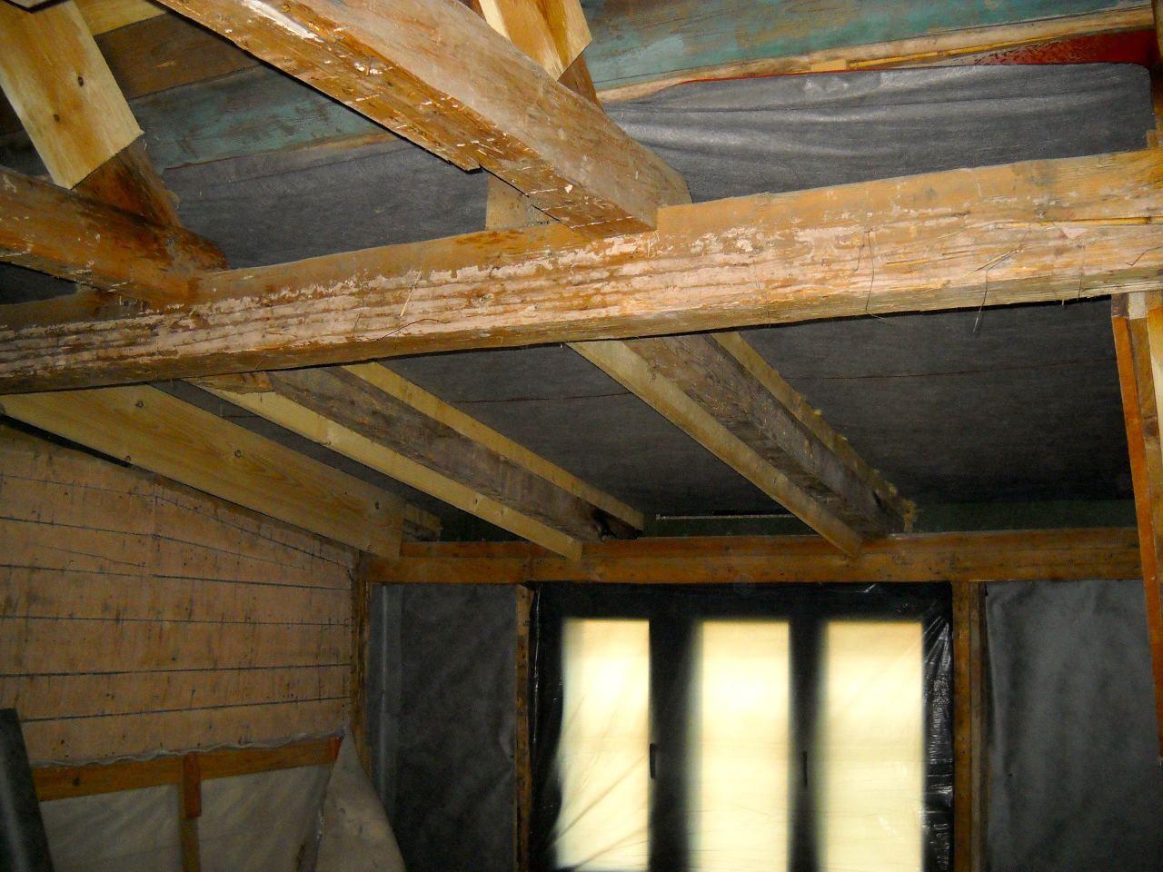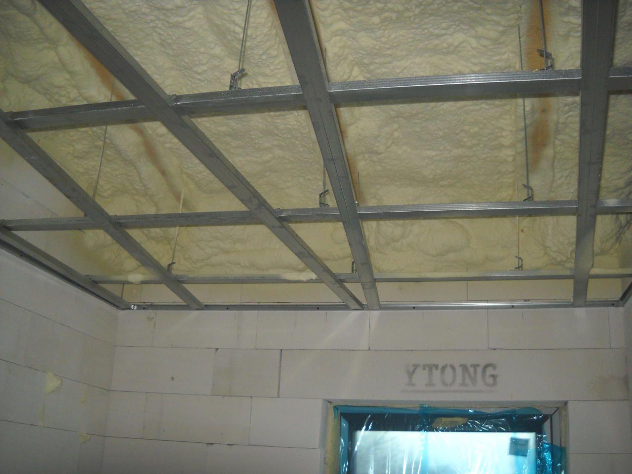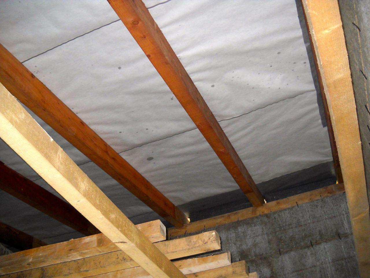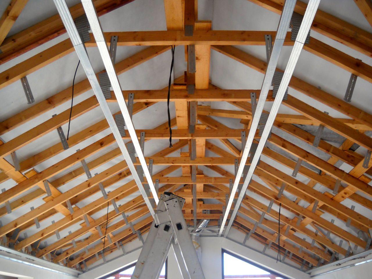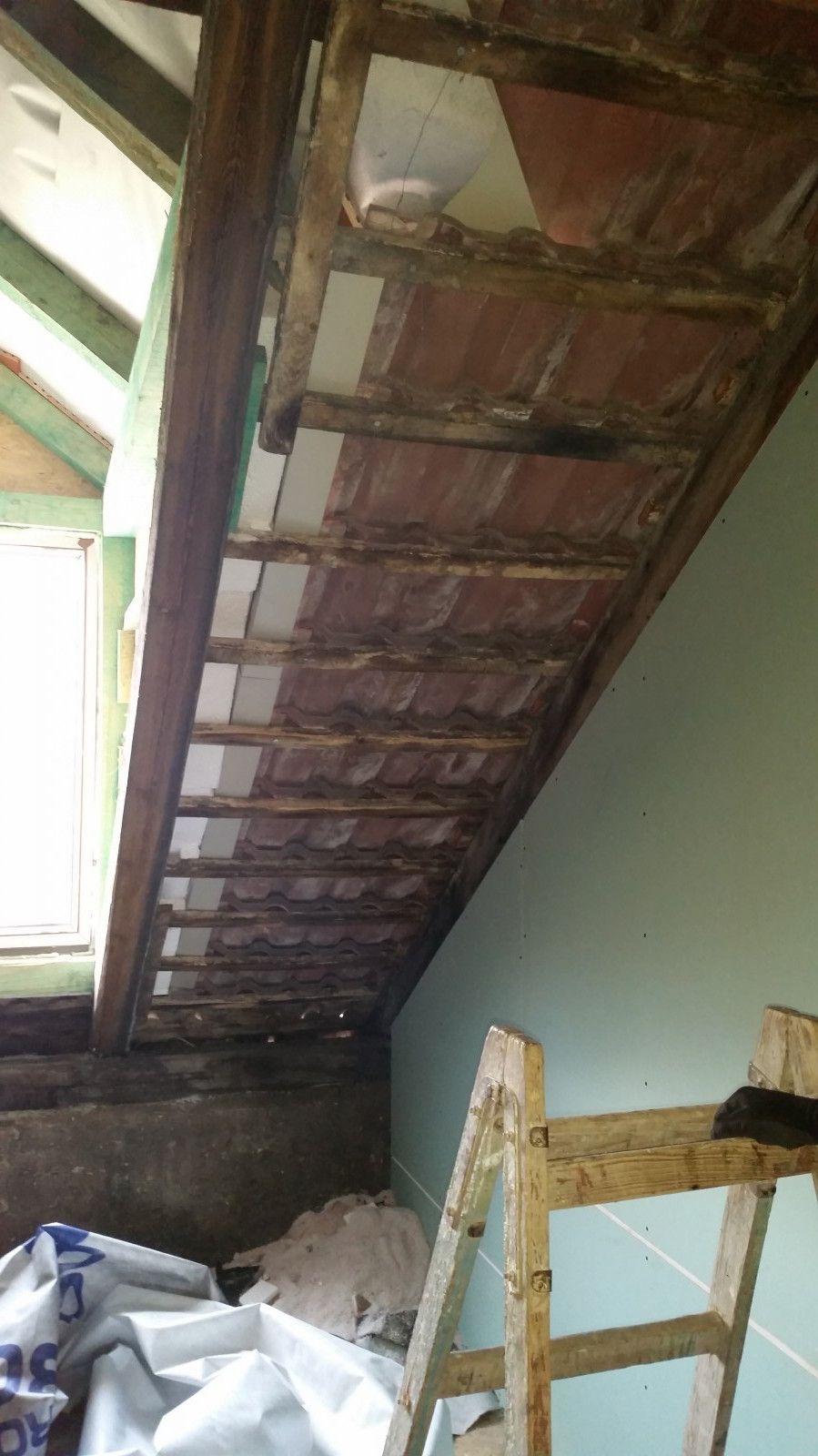 2 x šikminy délky 3m - krokve 10/14. Nastaveny profily SDK pro pěnu o tloušťce 25 cm. Strop - klaštiny délky 5m s podbitím z OSB desek, nástřik pěny z půdy rovněž 25 cm, bednění střechy z prken.