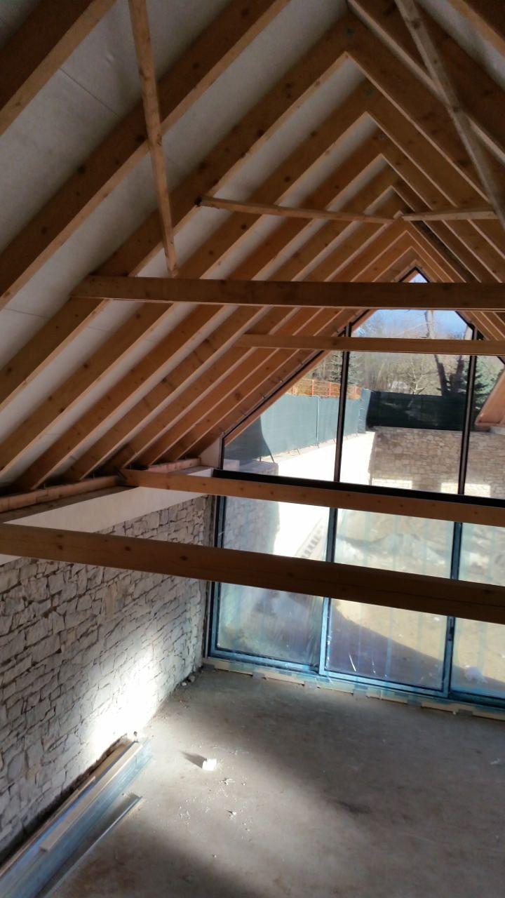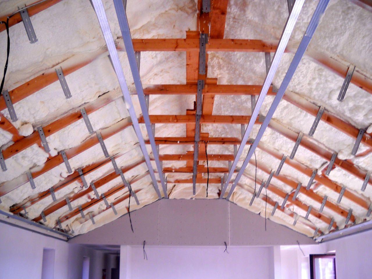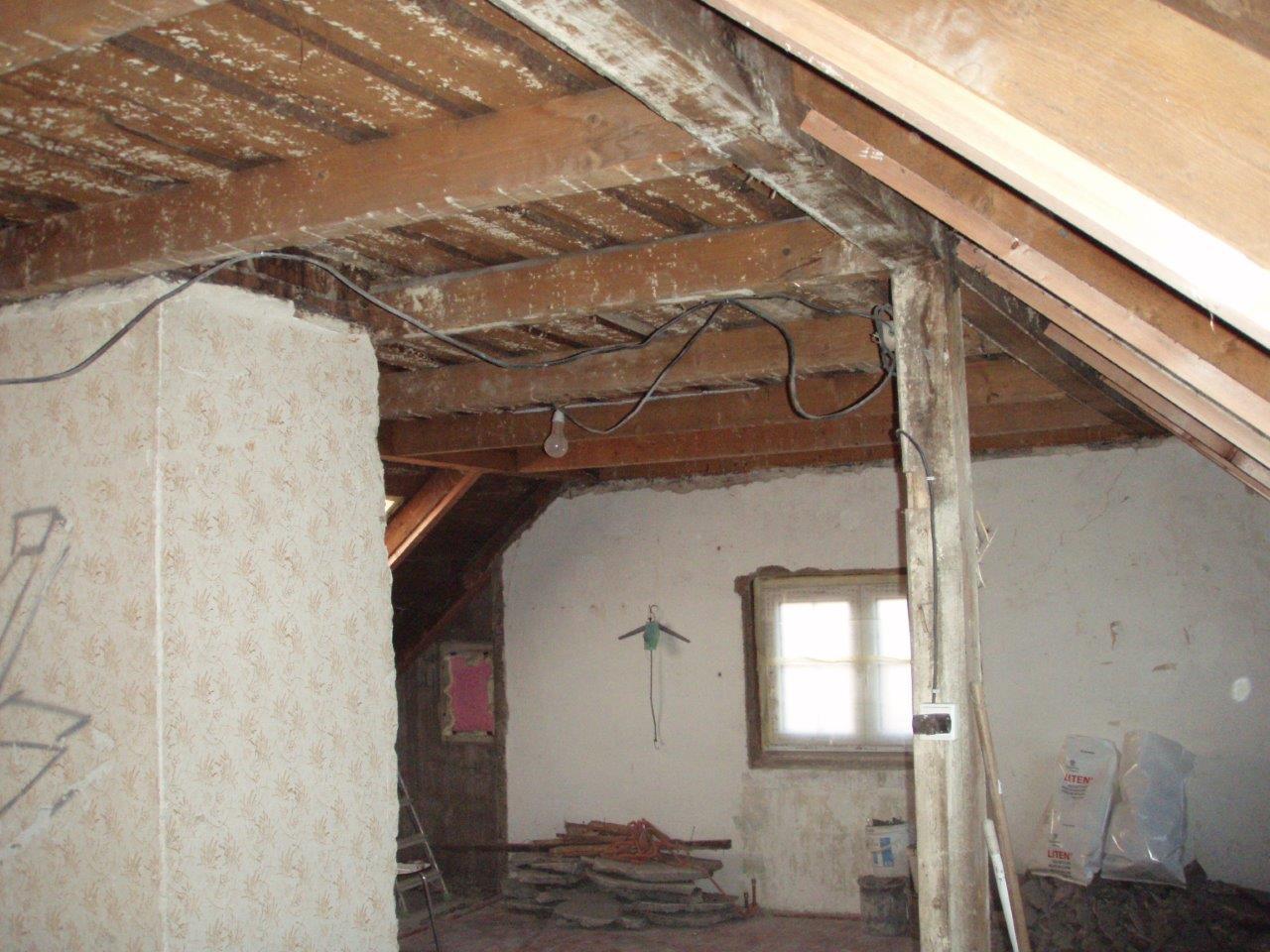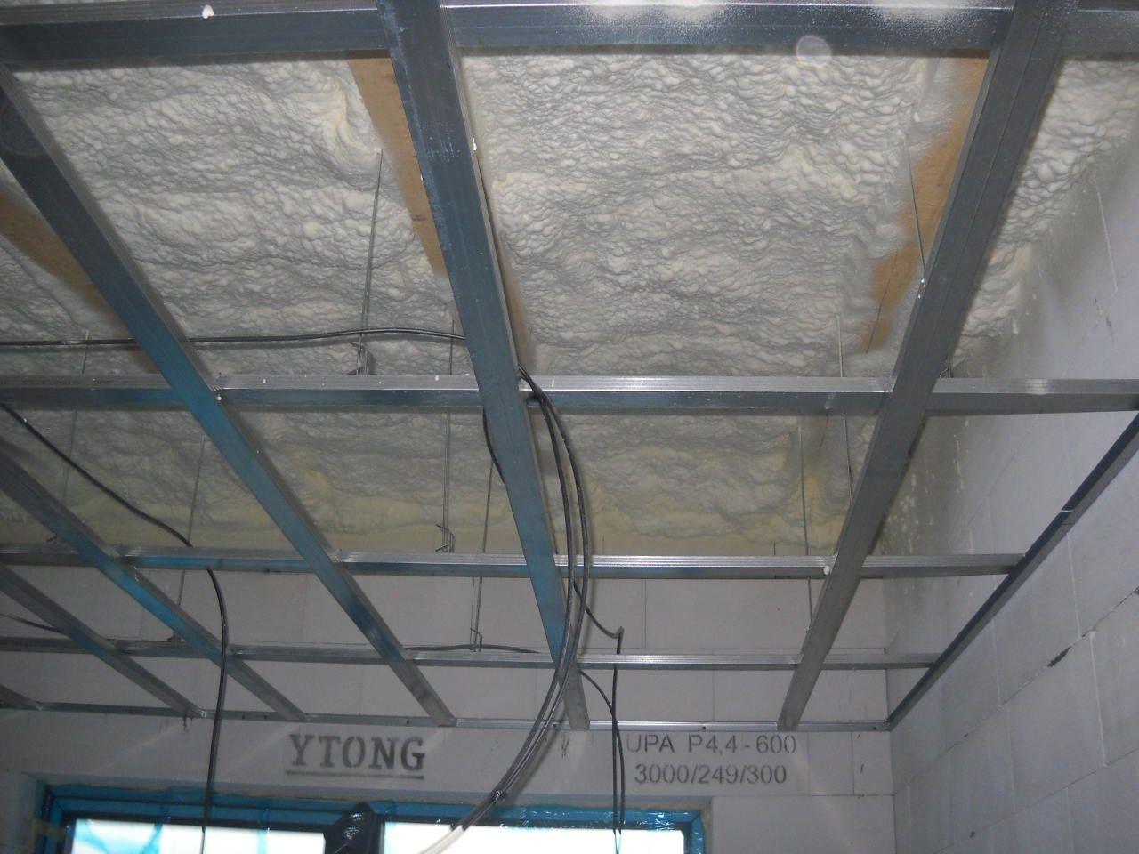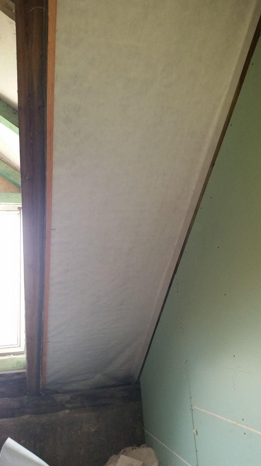 2 x šikminy délky 3m - krokve 10/14. Nastaveny profily SDK pro pěnu o tloušťce 25 cm. Strop - klaštiny délky 5m s podbitím z OSB desek, nástřik pěny z půdy rovněž 25 cm, bednění střechy z prken.