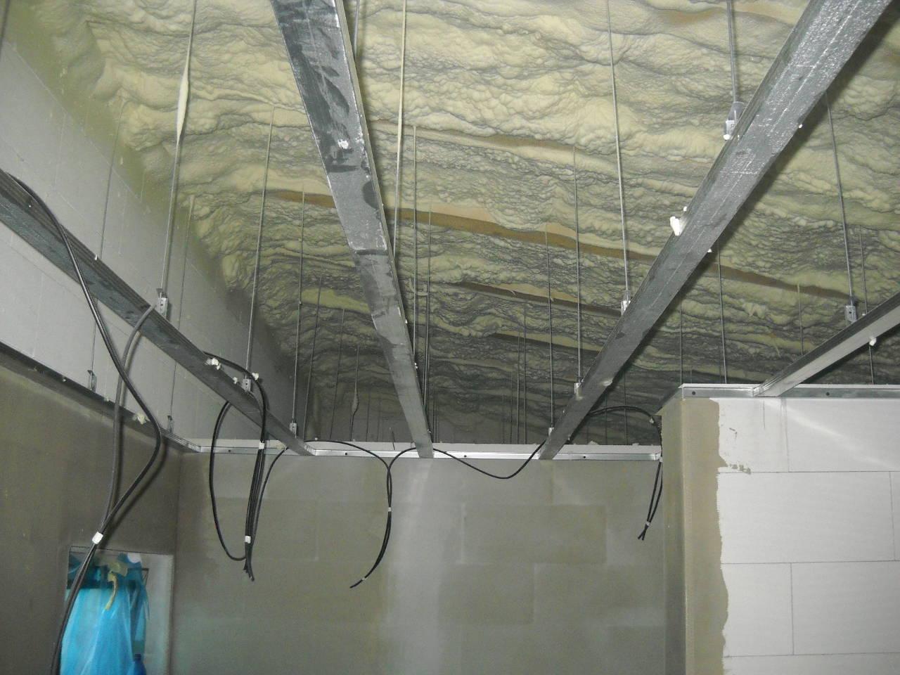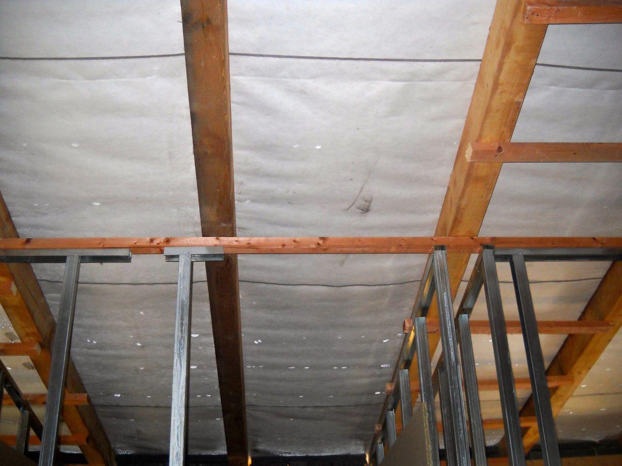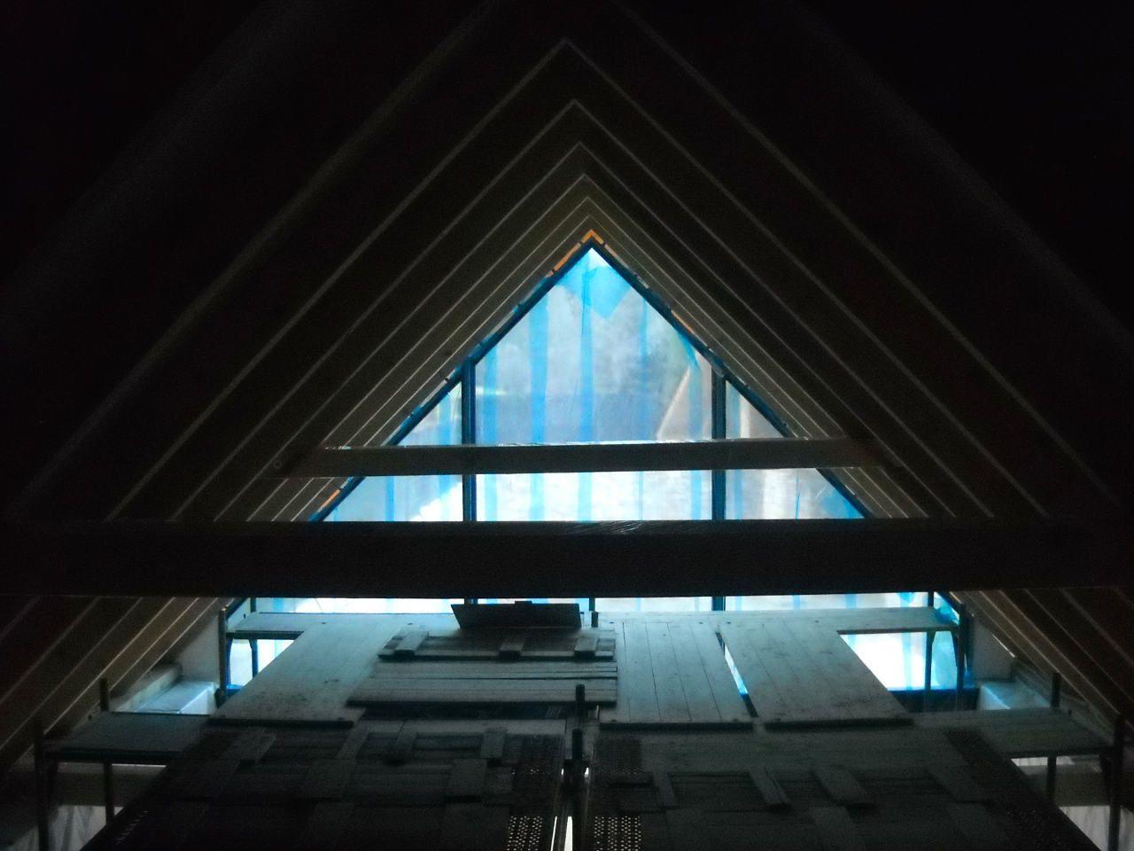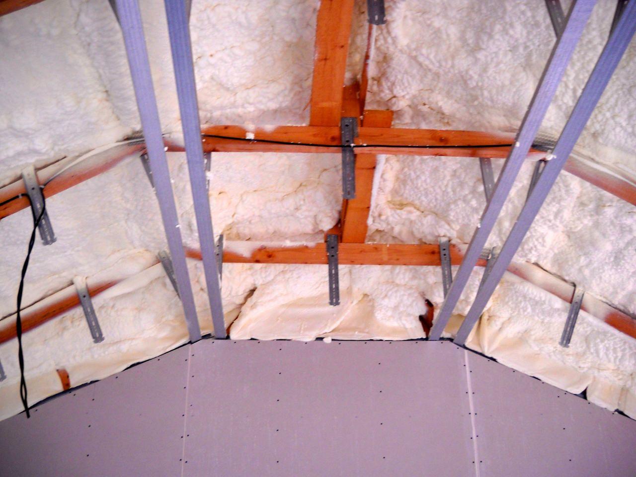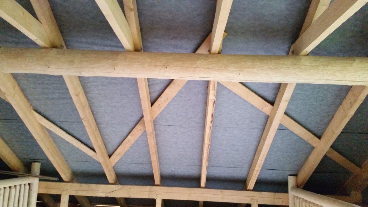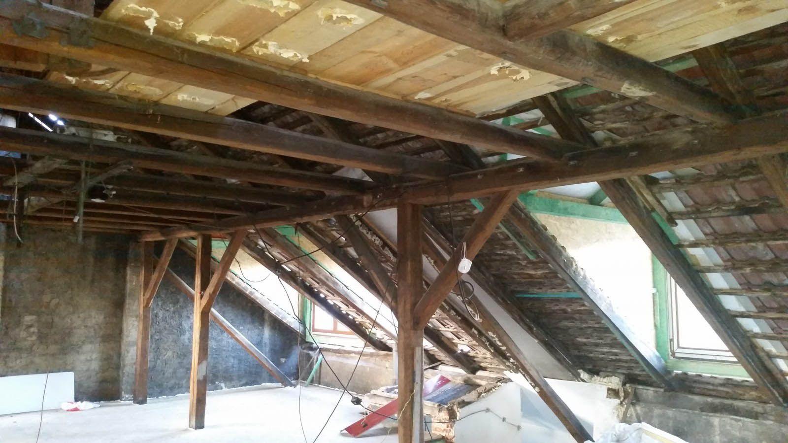 2 x šikminy délky 3m - krokve 10/14. Nastaveny profily SDK pro pěnu o tloušťce 25 cm. Strop - klaštiny délky 5m s podbitím z OSB desek, nástřik pěny z půdy rovněž 25 cm, bednění střechy z prken.