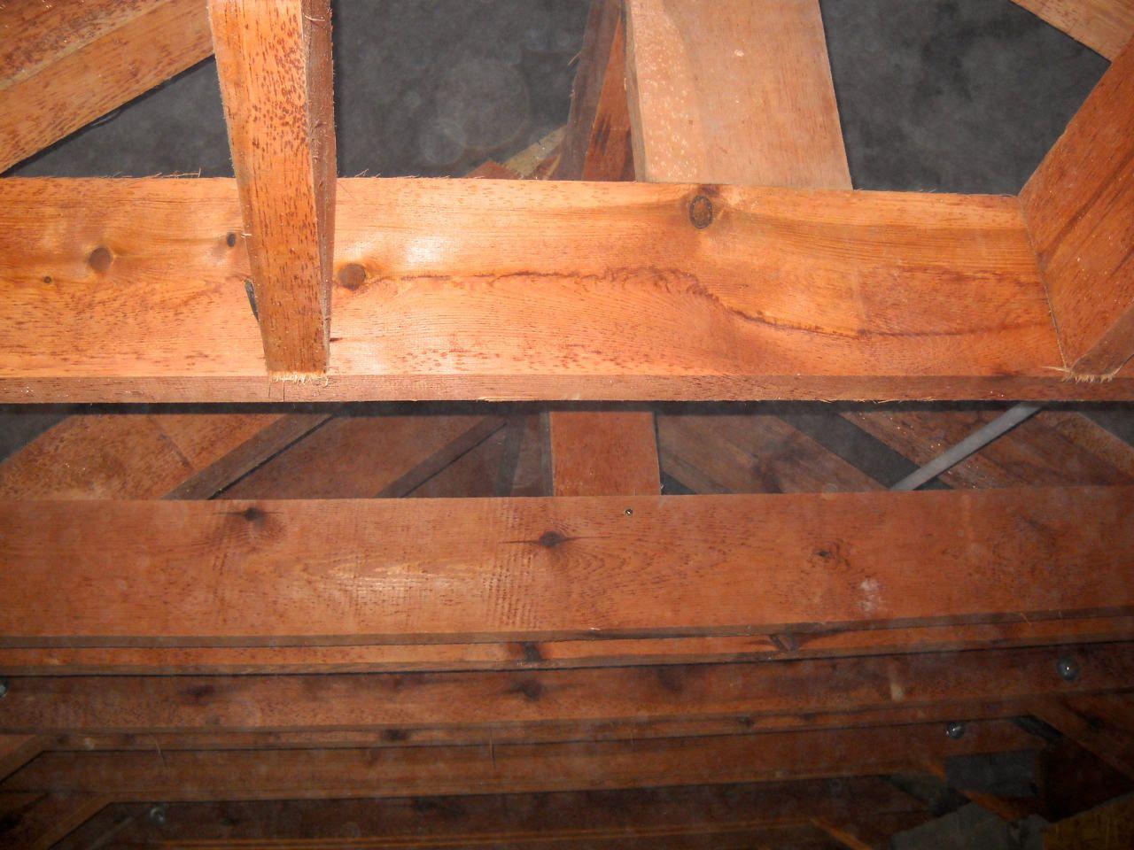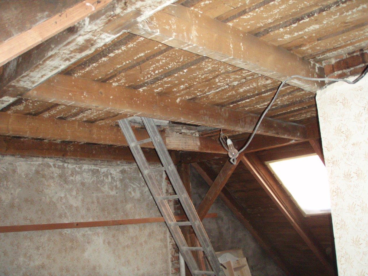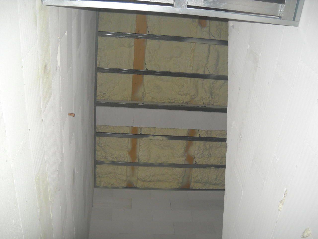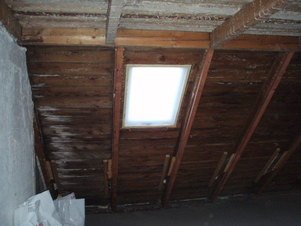2 x šikminy délky 3m - krokve 10/14. Nastaveny profily SDK pro pěnu o tloušťce 25 cm. Strop - klaštiny délky 5m s podbitím z OSB desek, nástřik pěny z půdy rovněž 25 cm, bednění střechy z prken.