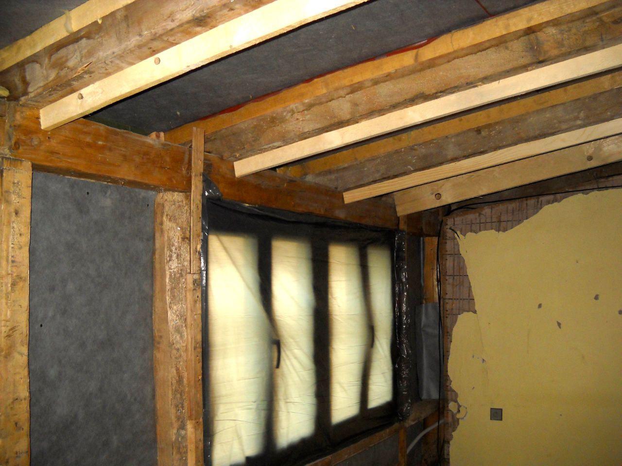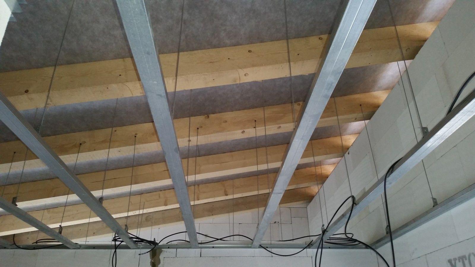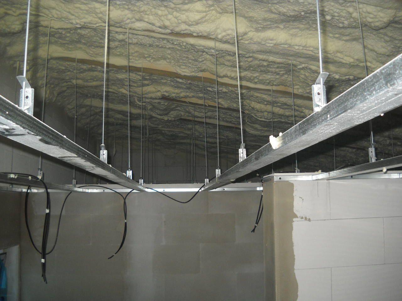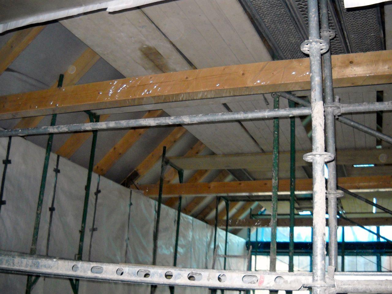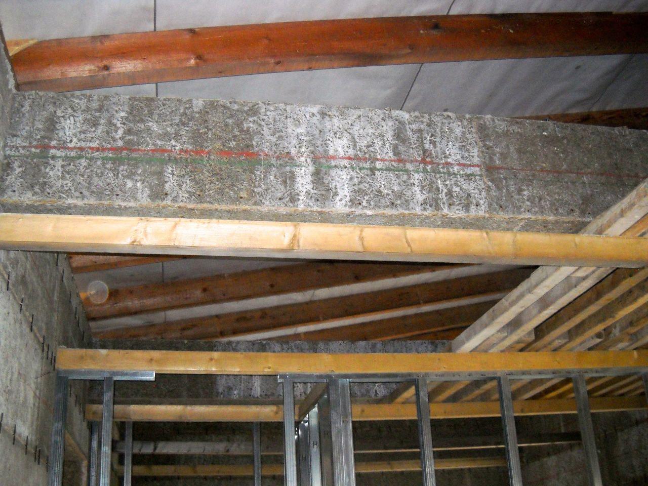 2 x šikminy délky 3m - krokve 10/14. Nastaveny profily SDK pro pěnu o tloušťce 25 cm. Strop - klaštiny délky 5m s podbitím z OSB desek, nástřik pěny z půdy rovněž 25 cm, bednění střechy z prken.