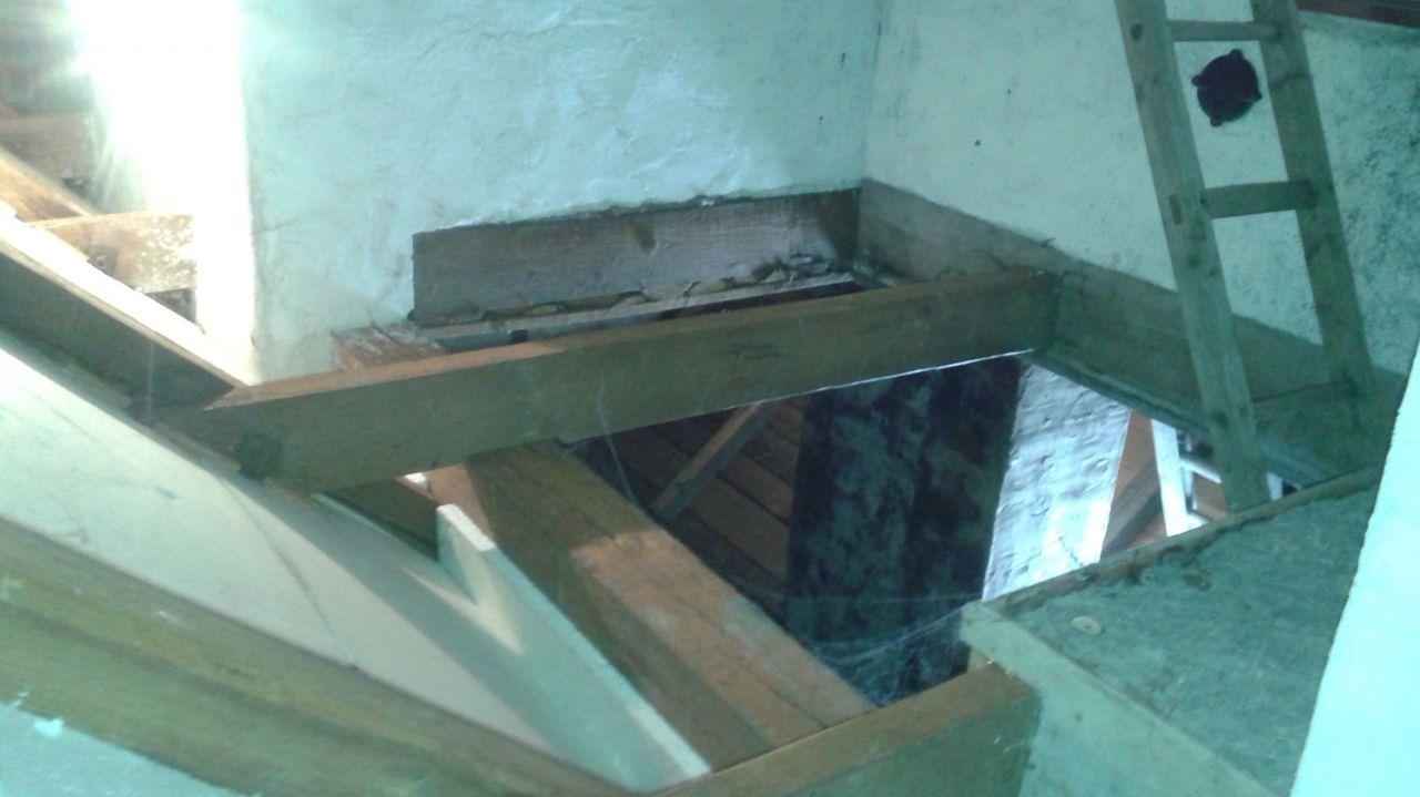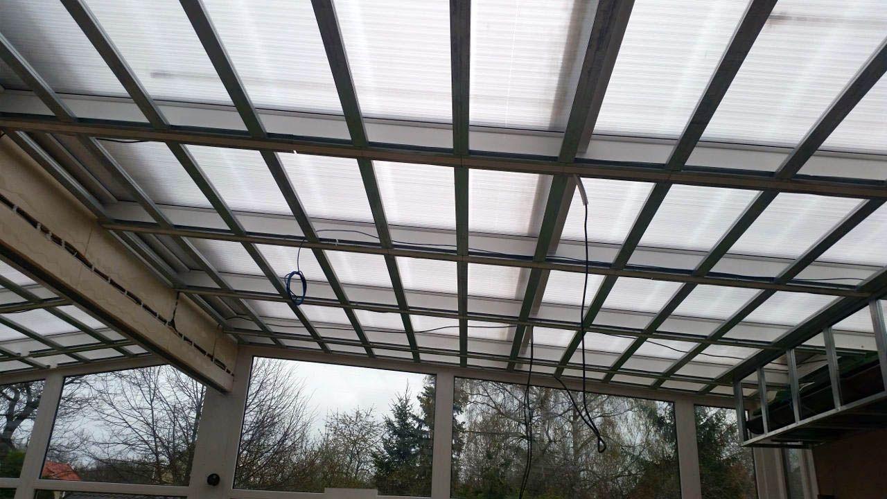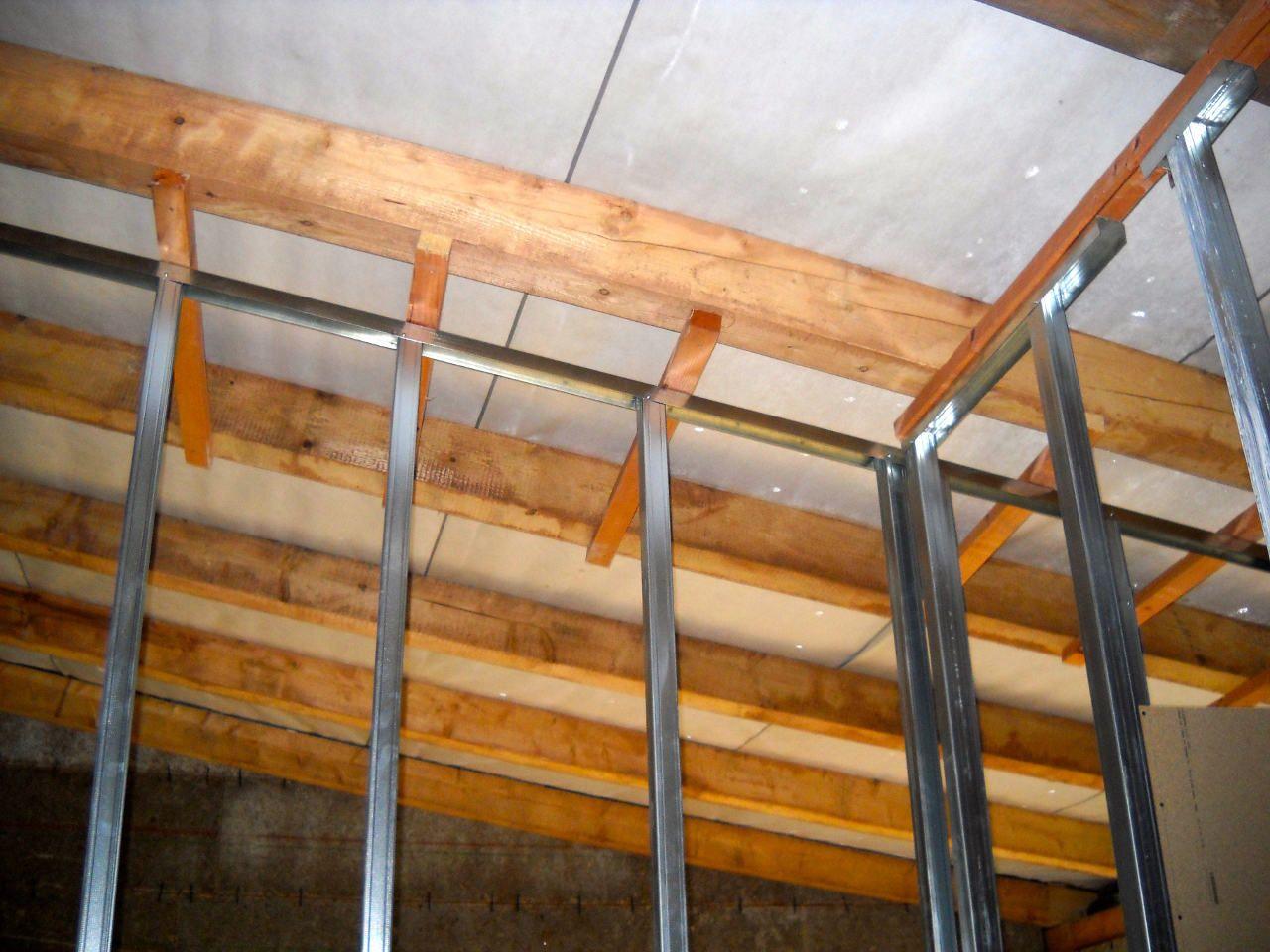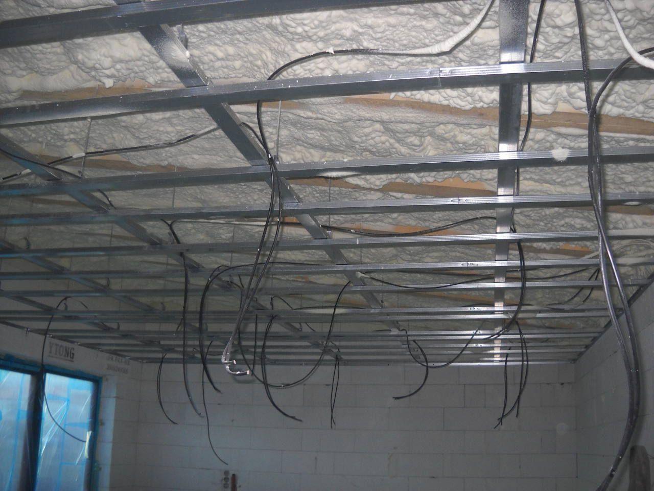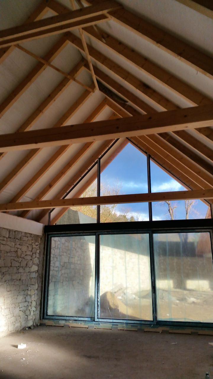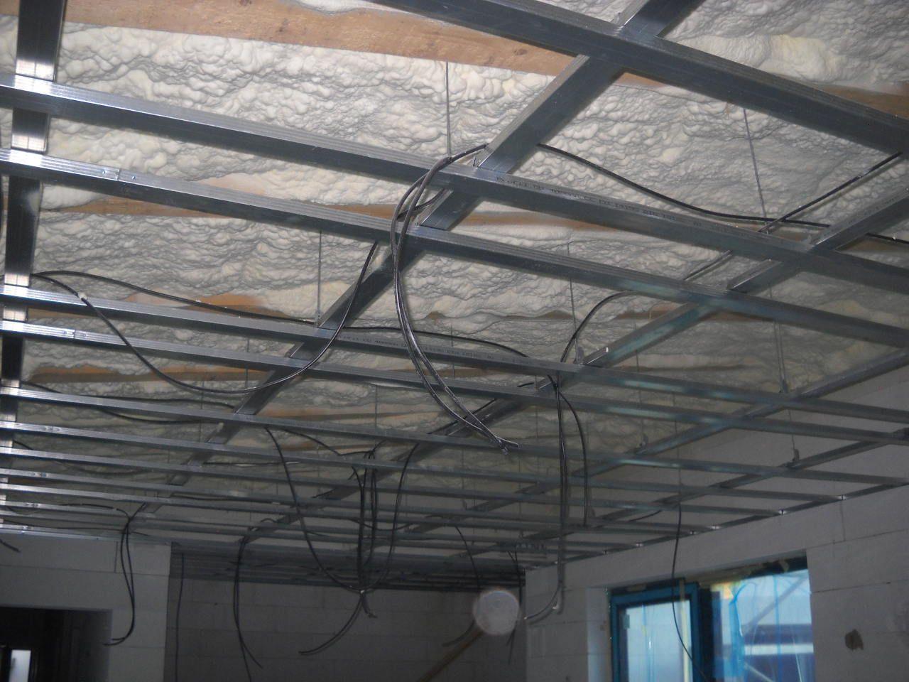2 x šikminy délky 3m - krokve 10/14. Nastaveny profily SDK pro pěnu o tloušťce 25 cm. Strop - klaštiny délky 5m s podbitím z OSB desek, nástřik pěny z půdy rovněž 25 cm, bednění střechy z prken.