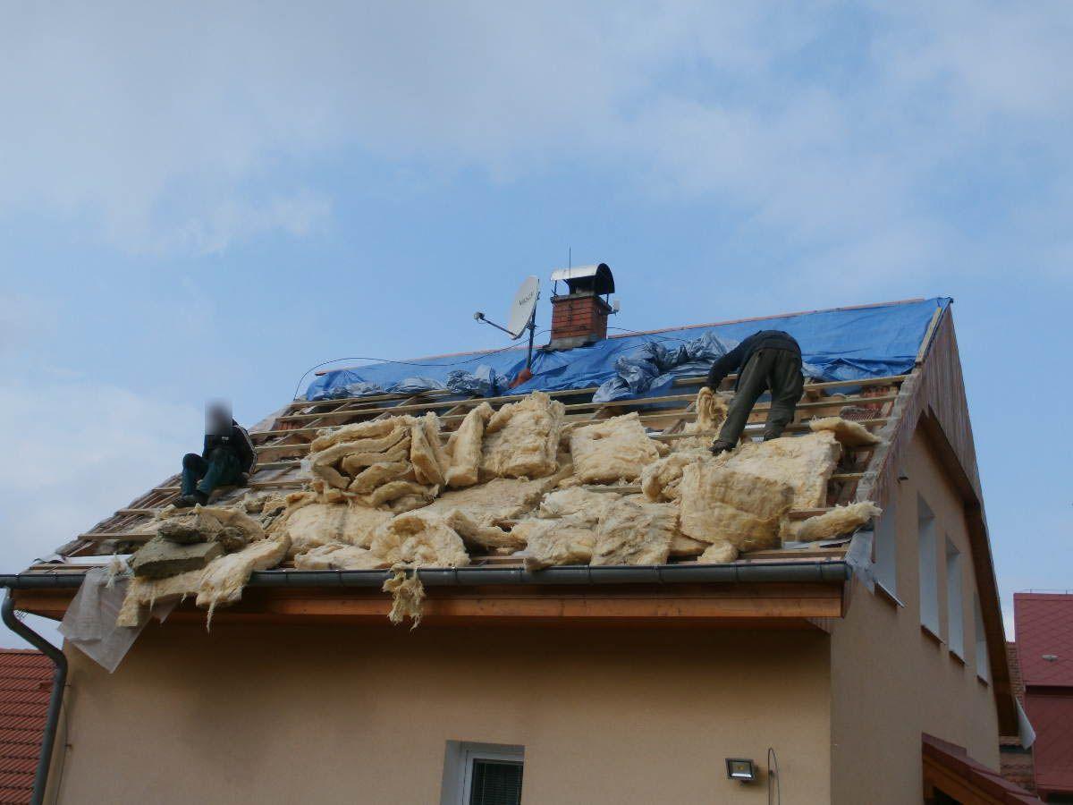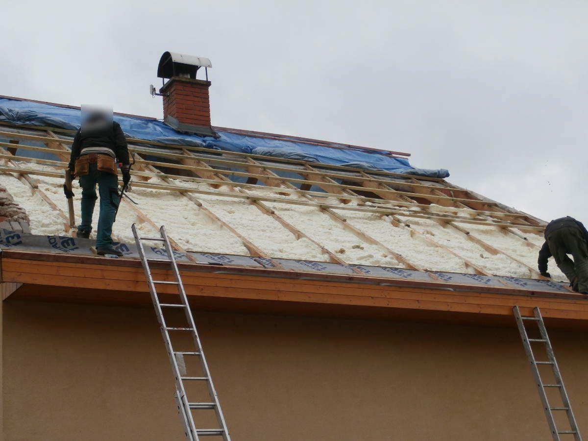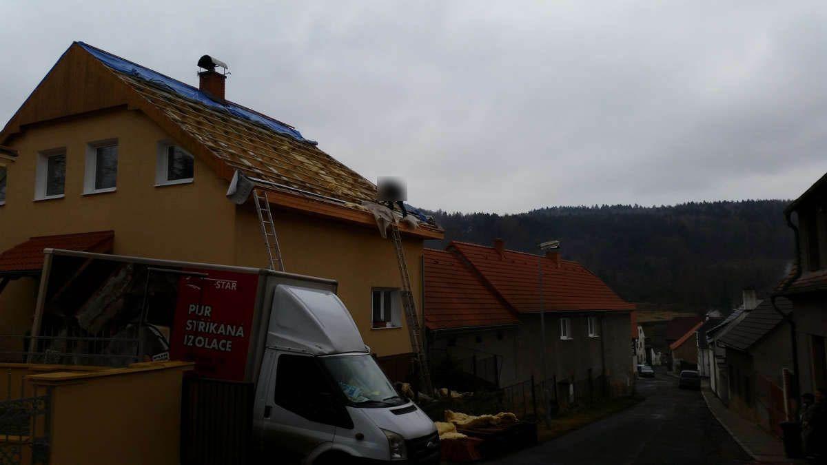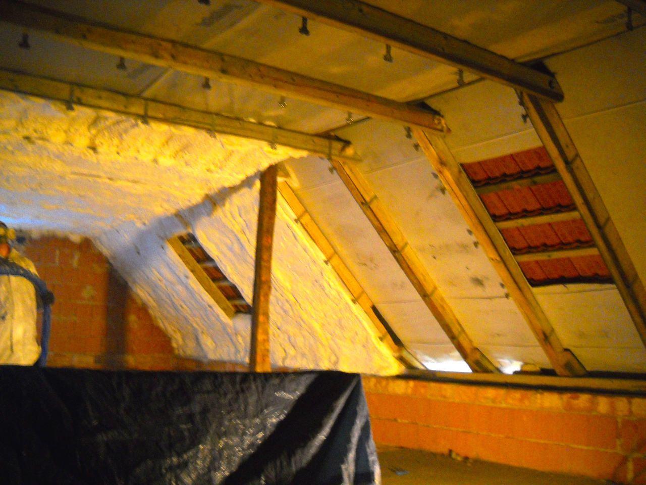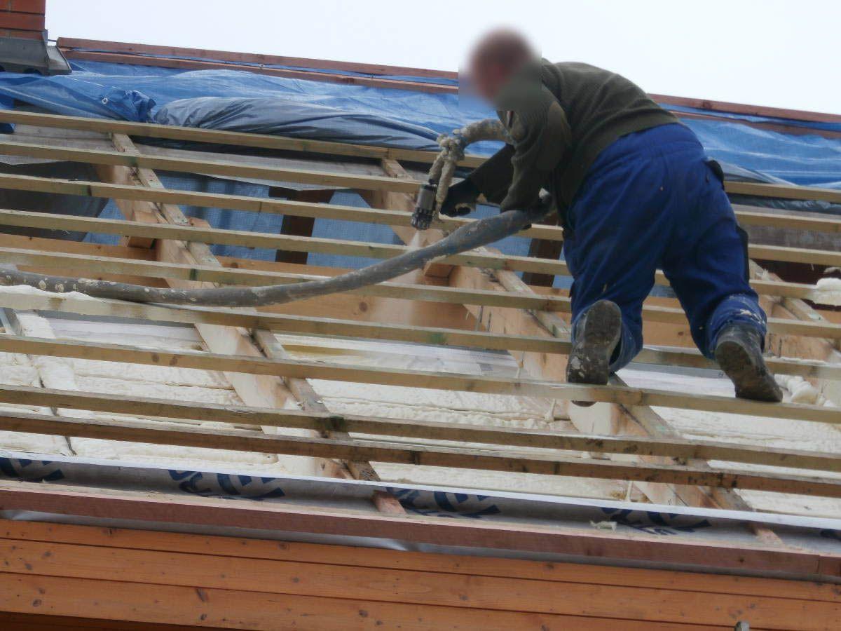 Izolace podkroví rodinné domu prováděná zvenku. Neefektivní skelnou vatu jsme nahradili stříkanou pěnou a výrazně tak ušetřili náklady na vytápění i klimatizaci.