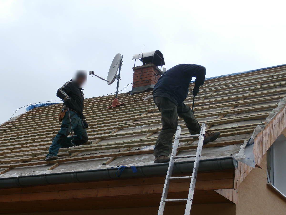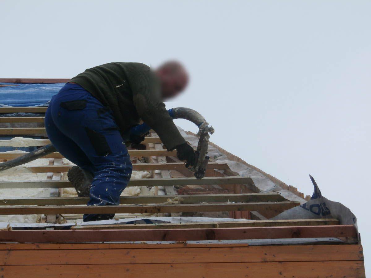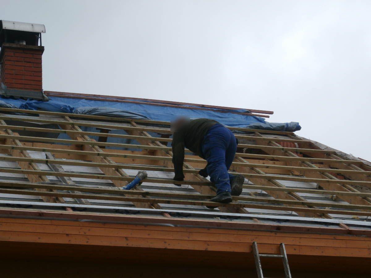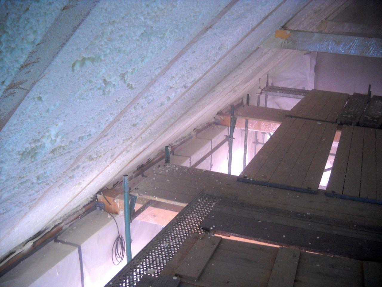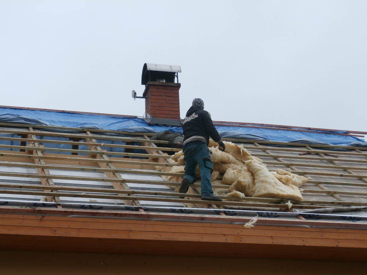 Izolace podkroví rodinné domu prováděná zvenku. Neefektivní skelnou vatu jsme nahradili stříkanou pěnou a výrazně tak ušetřili náklady na vytápění i klimatizaci.