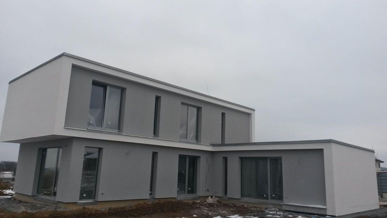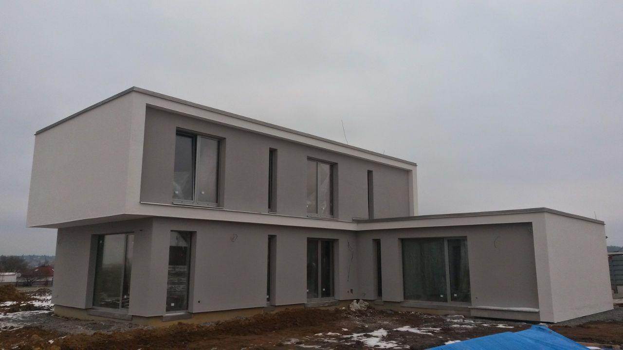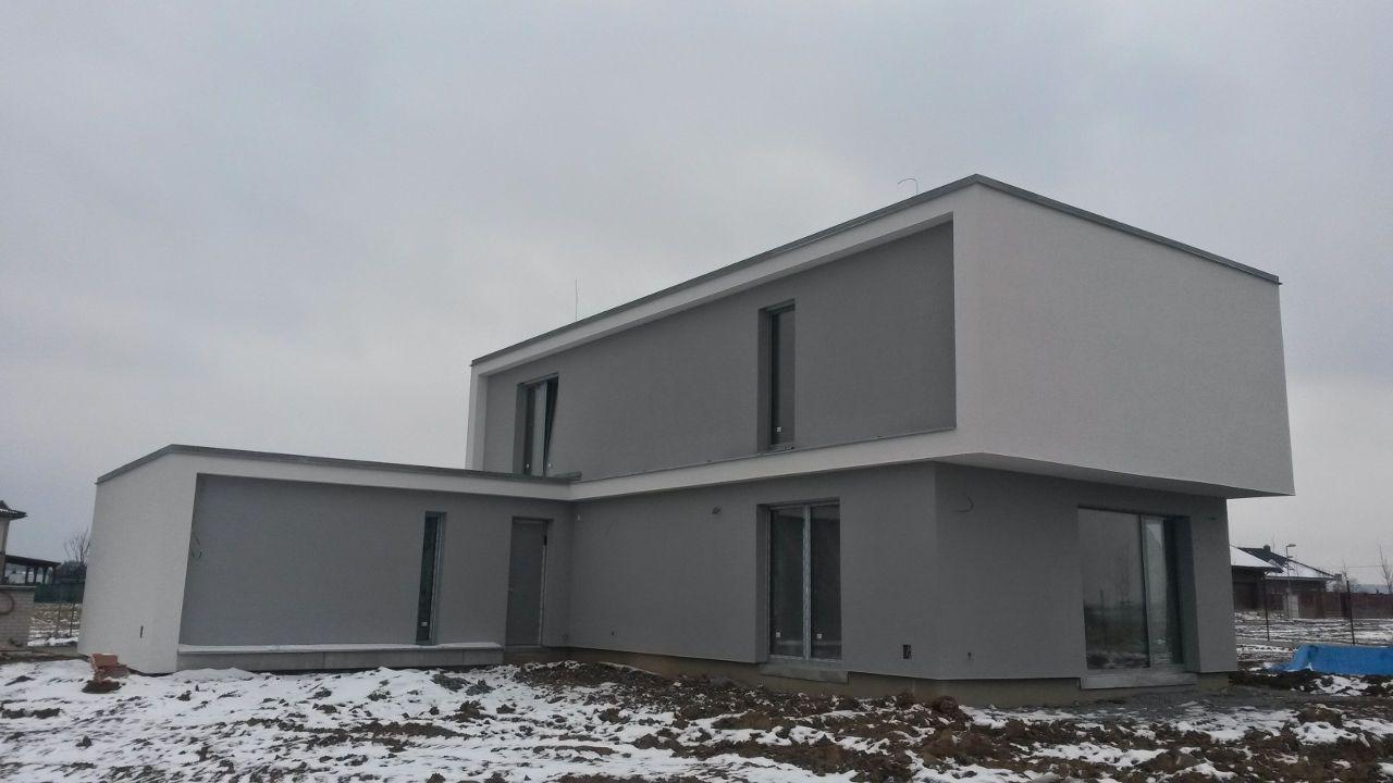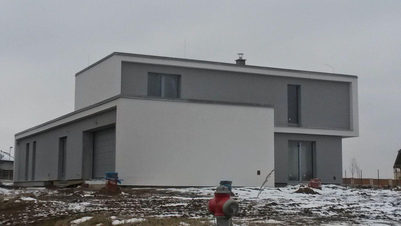Zákazník řešil zhotovení fasády pro svou novostavbu a rozhodl se pro systém BAUMIT, kde je uvažován jako izolant termo omítka BAUMIT TermoExtra o tloušťce 4 cm. Postup prací byl následující: na zdivo z pálených cihel byl nanesen přednástřik (penetrace) pro lepší adhezi mezi stěnou a omítkou. Na přednástřik byla dále strojně aplikována termoizolační omítka. Po vytvrdnutí byla omítka zaarmována tkaninou a přetažena lepidlovou stěrkou. Jako finální (pohledová vrstva) byla nanesena omítka BAUMIT Nanoporcolor bílého probarvení. Délka realizace: 1 měsíc, cena díla: 60 660 Kč bez DPH (pouze práce, materiál si dodal zákazník sám).