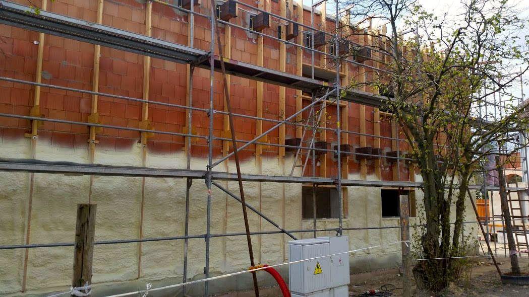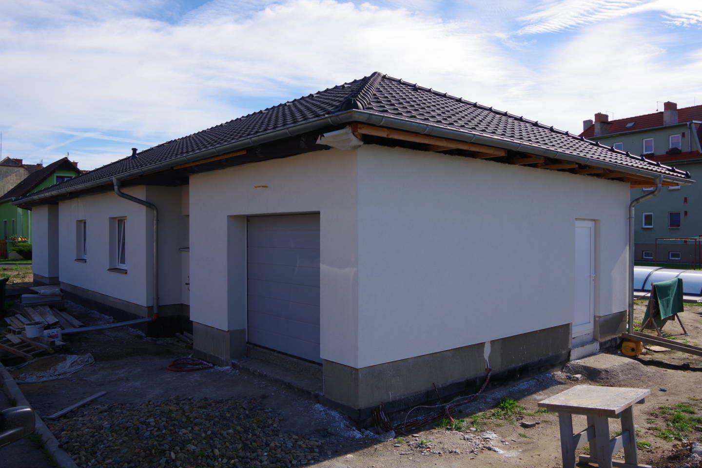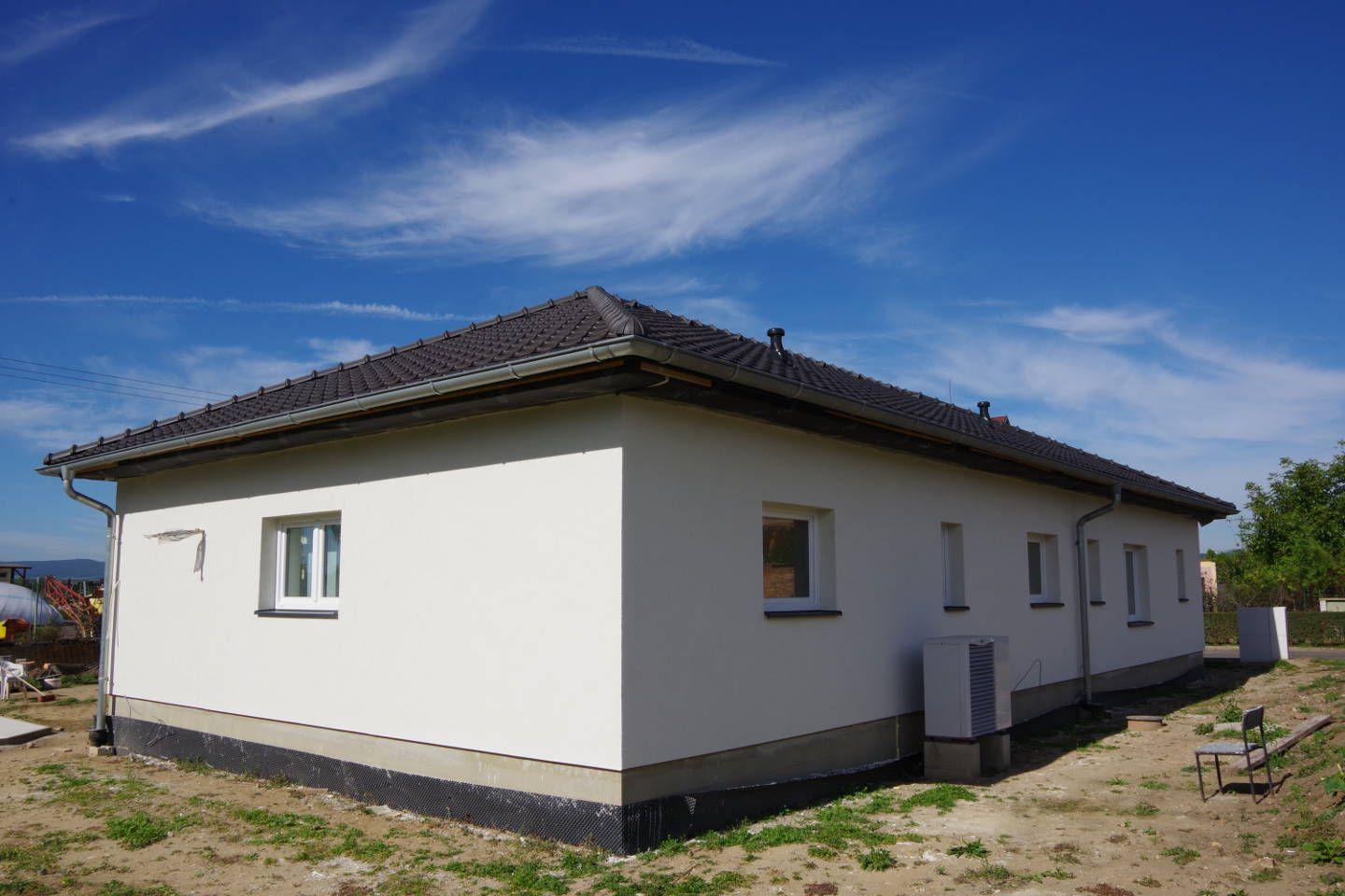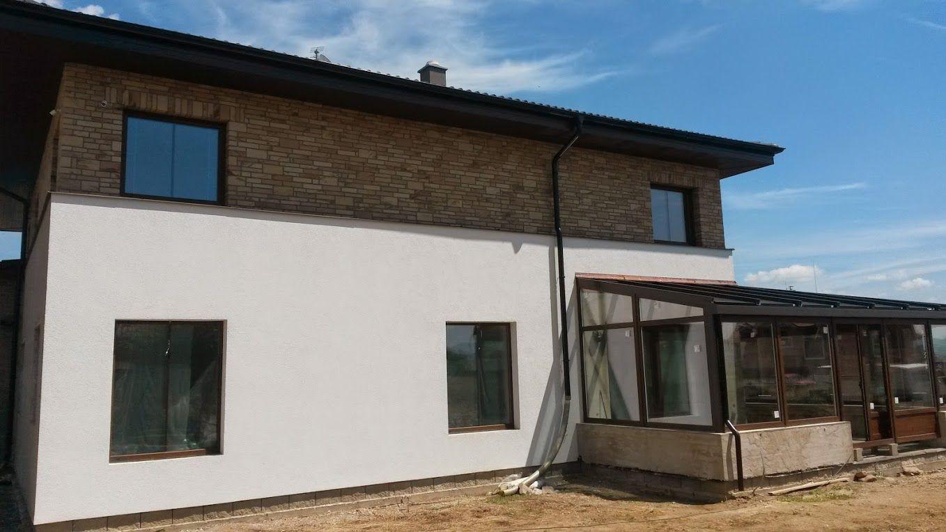 Zákazník řešil zhotovení fasády pro svou novostavbu a rozhodl se pro systém BAUMIT, kde je uvažován jako izolant termo omítka BAUMIT TermoExtra o tloušťce 4 cm. Postup prací byl následující: na zdivo z pálených cihel byl nanesen přednástřik (penetrace) pro lepší adhezi mezi stěnou a omítkou. Na přednástřik byla dále strojně aplikována termoizolační omítka. Po vytvrdnutí byla omítka zaarmována tkaninou a přetažena lepidlovou stěrkou. Jako finální (pohledová vrstva) byla nanesena omítka BAUMIT Nanoporcolor bílého probarvení. Délka realizace: 1 měsíc, cena díla: 60 660 Kč bez DPH (pouze práce, materiál si dodal zákazník sám).