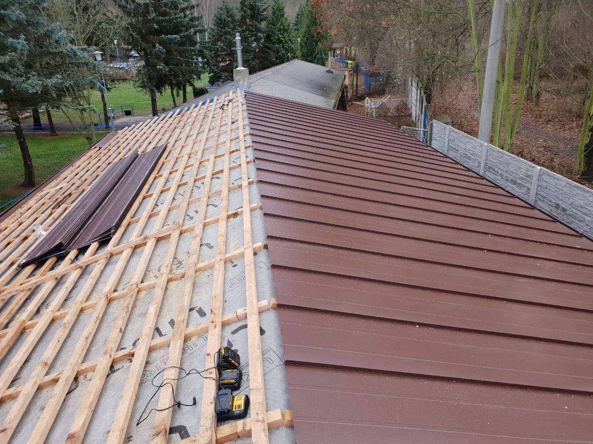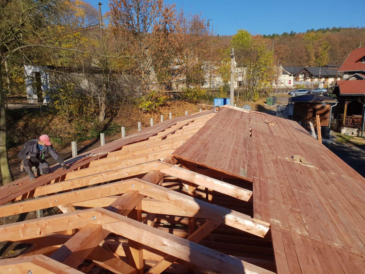 Nosná konstrukce sedlové střechy je navržena z dřevěných vaznic 140/160 mm, krokví 100/140 mm, pásků 100/120 mm a jednostranných kleštin 80/160 mm. Dřevěné vaznice jsou osazeny na dřevěných sloupcích a podepřeny pásky 100/120 mm. Střešní plášť z falcovaných ocelových probarvených plechů je osazen na dřevěné bednění z prken tl. 25 mm. Pod plechy se nachází strukturovaná dělící rohož.