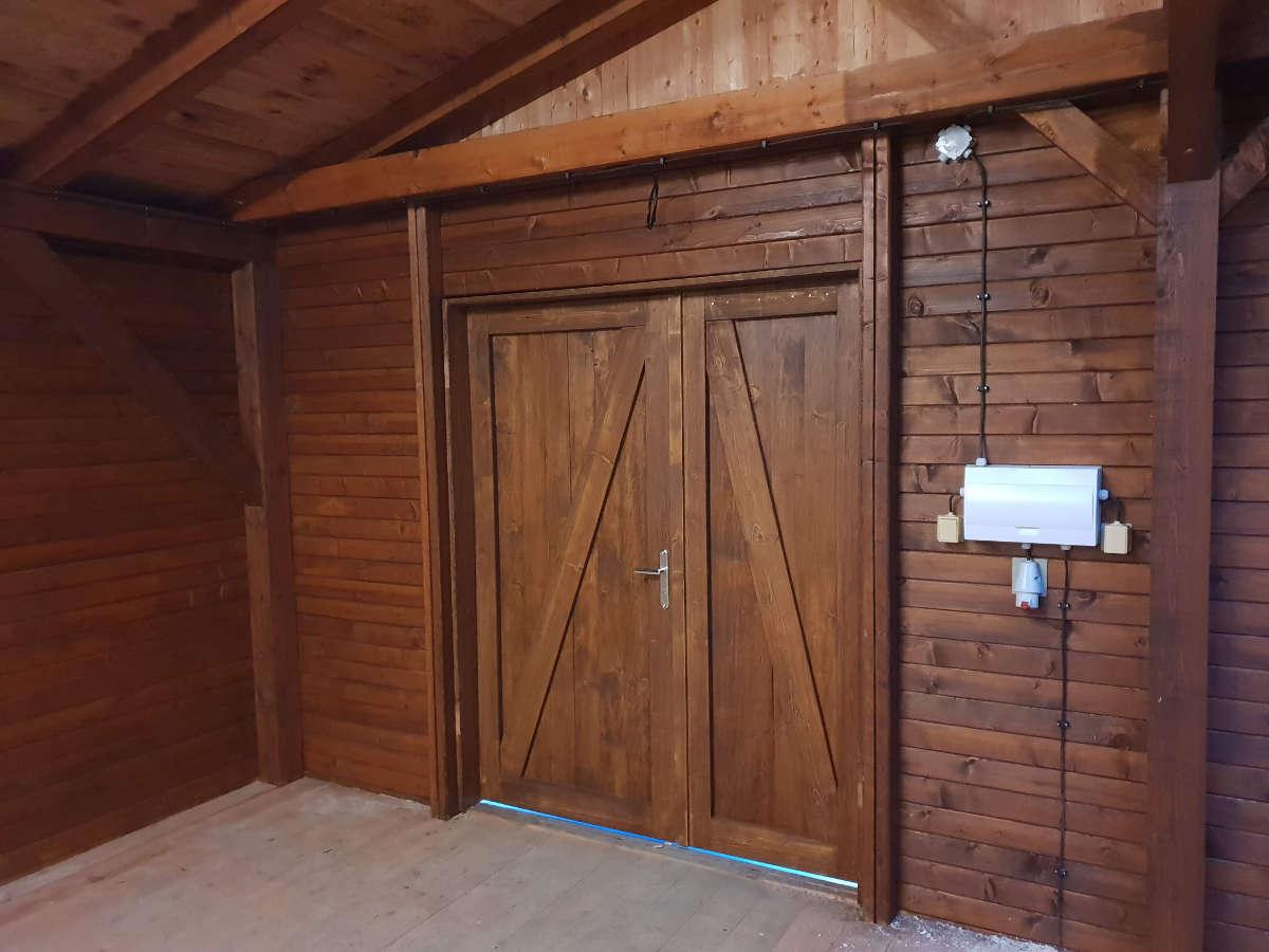 Dveře byly vyrobeny na míru dle domluvy. V tomto případě se jednalo o několik typů dveří - dvoukřídlé (1600 / 2035 mm), 2x jednokřídlé klasické (900 / 2000 mm) s instalací wc zámku a bezpečnostních zámků, dále 18x dveře kabinkové (800 / 1975 mm). Všechny typy mají konstrukci tvořenou z dřevěných fošen, vnější povrch namořen do tmavého ořechu, vnitřní povrch světle čirý a dřevěnou zárubeň. Okna střešní jednokřídlová, pevně zasklená.