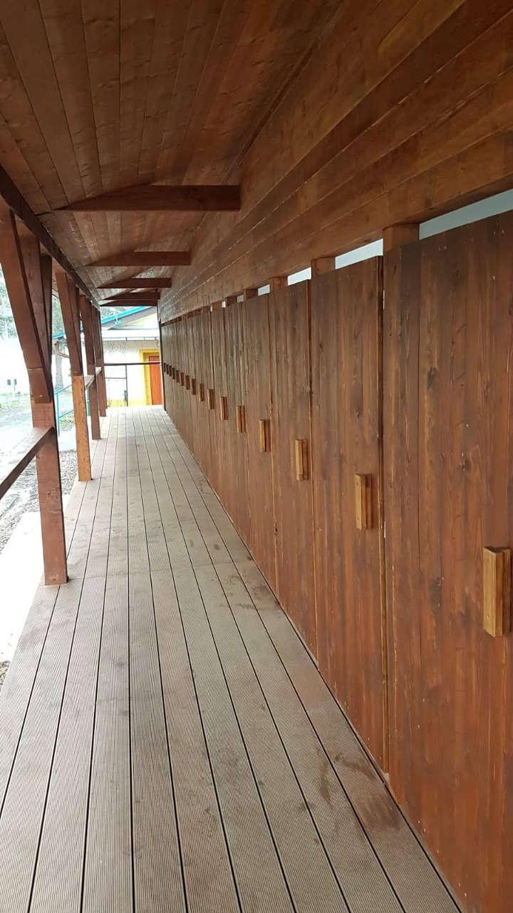 Ve vnitřních prostorách objektu ve skladu je navržena dřevěná podlaha z fošen tl. 40 mm. V prostorech převlékáren a terasy je navržena podlaha z dřevoplastových terasových prken (desky WPC) tl. cca 25 mm. Spodní podhledové a boční konstrukce jsou obloženy dřevěným obkladem z palubkových prken. Veškeré dřevěné konstrukce jsou opatřeny vhodným nátěrem na dřevo do vnějšího prostředí.