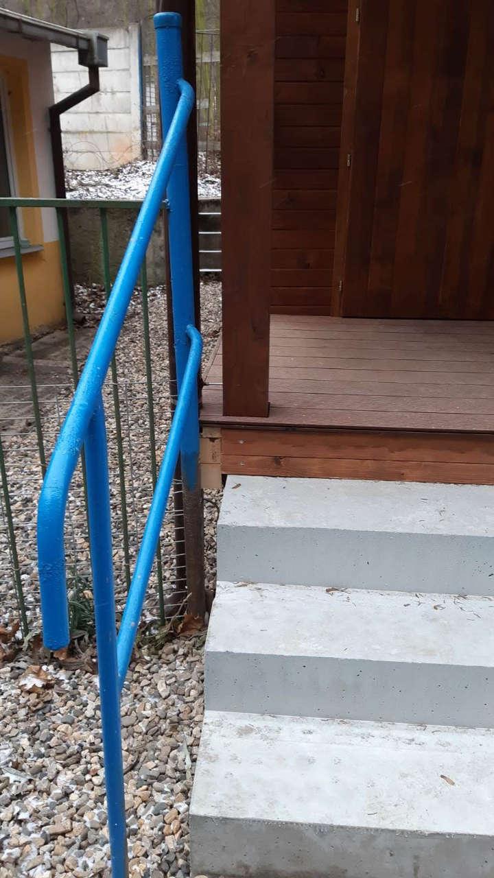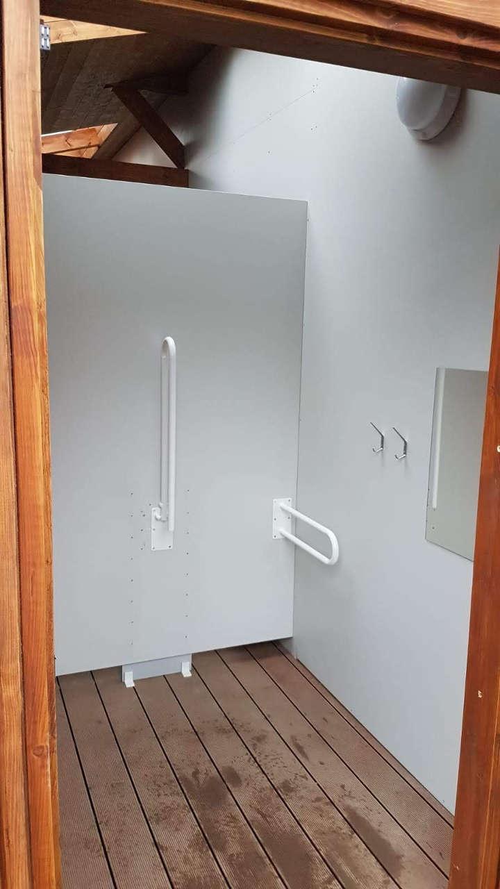Do každé kabinky byla vyrobena a instalována sklopná lavička a madla v bílé barvě.